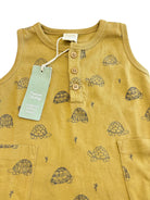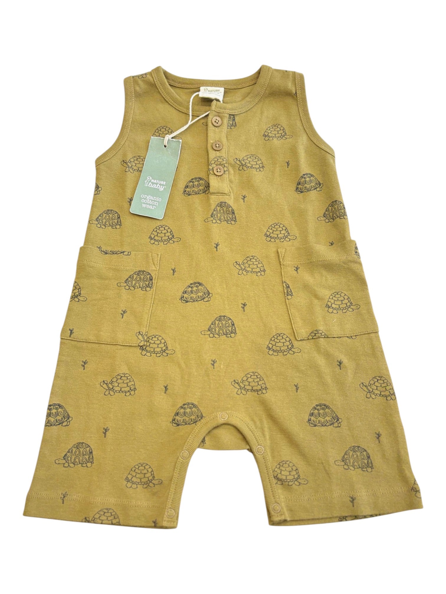 This adorable khaki green jumpsuit is a toddler's dream! Featuring a cute turtle print and crafted from 100% organic cotton, it's incredibly soft against delicate skin. The sleeveless, short-legged design keeps little ones cool and comfortable during playtime or warm-weather adventures. Easy to slip on and off, it's the perfect one-piece outfit for active toddlers who love to explore and have fun.