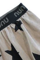 These brown shorts with a fun black star print bring a playful vibe to any outfit. Featuring a comfy elastic waist and cuffs, they offer a snug fit perfect for active days. Ideal for kids aged 8-9, they combine style and comfort effortlessly. Good condition.
