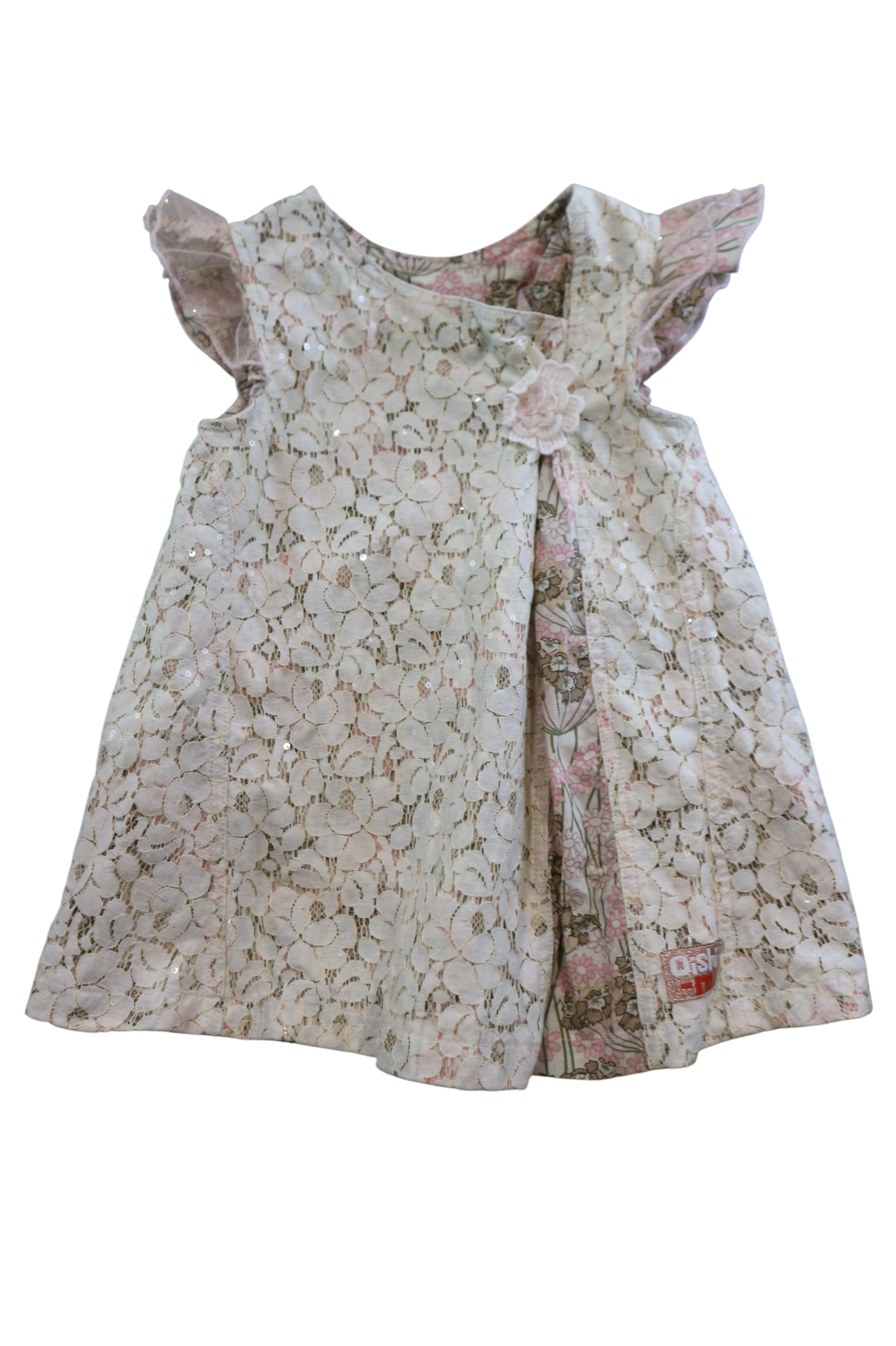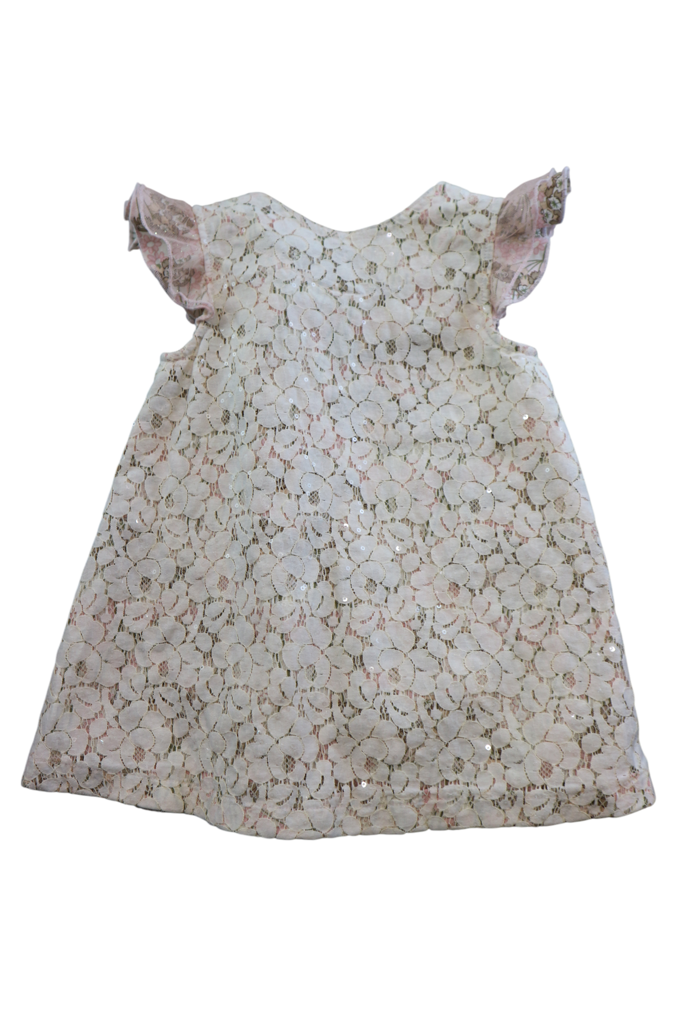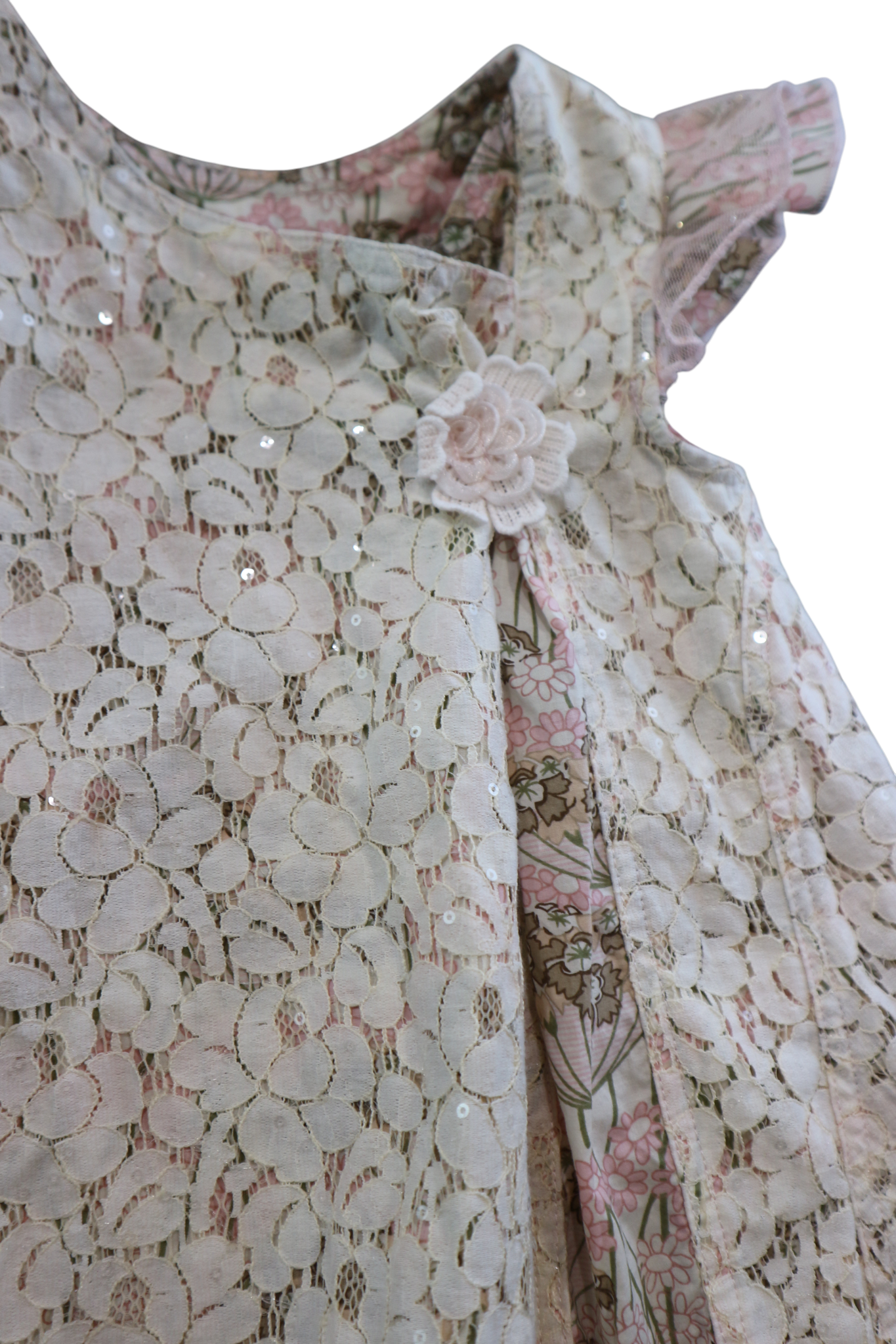 Oishi-m dress in cream lace & sequins and floral print, size 12-24m. Cotton/nylon/polyester.