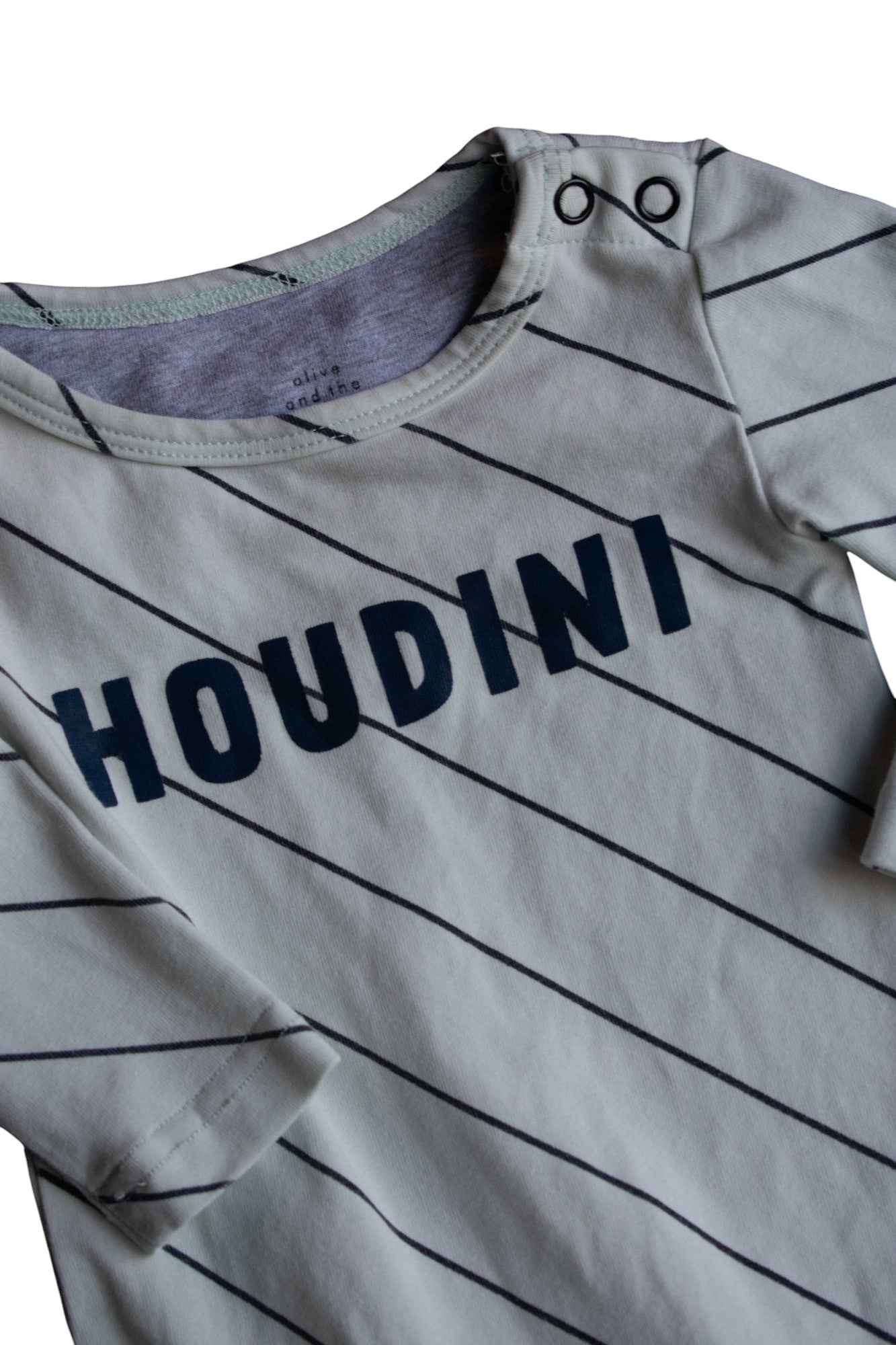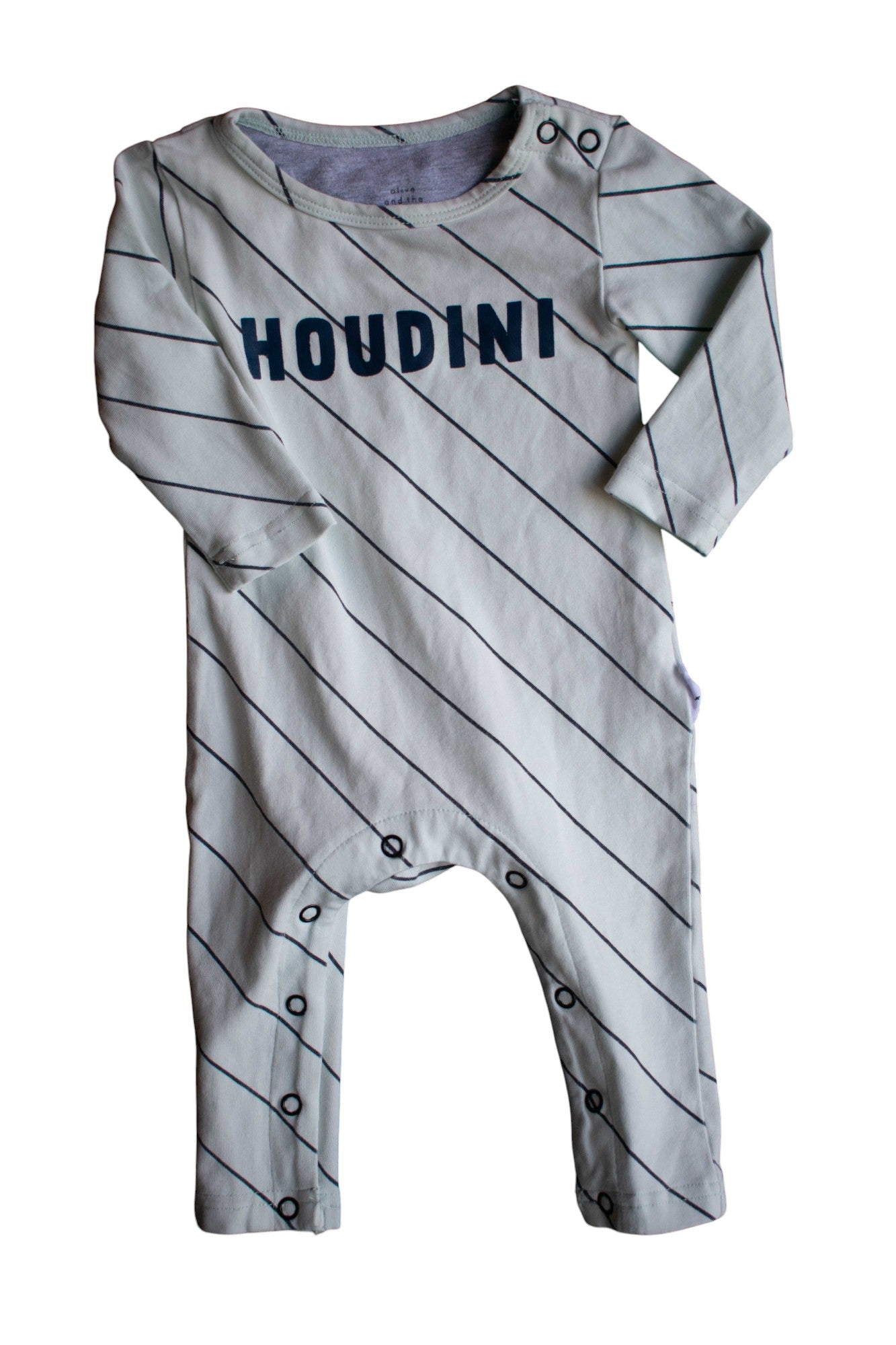 Dress your little adventurer in the Olive & The Captain Jumpsuit, featuring a fun "HOUDINI" print that sparks curiosity and playfulness. Crafted for comfort and ease, this jumpsuit lets your baby move freely while staying cozy. Perfect for everyday explorations and magical moments alike!