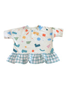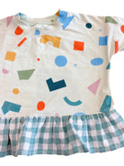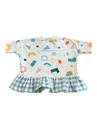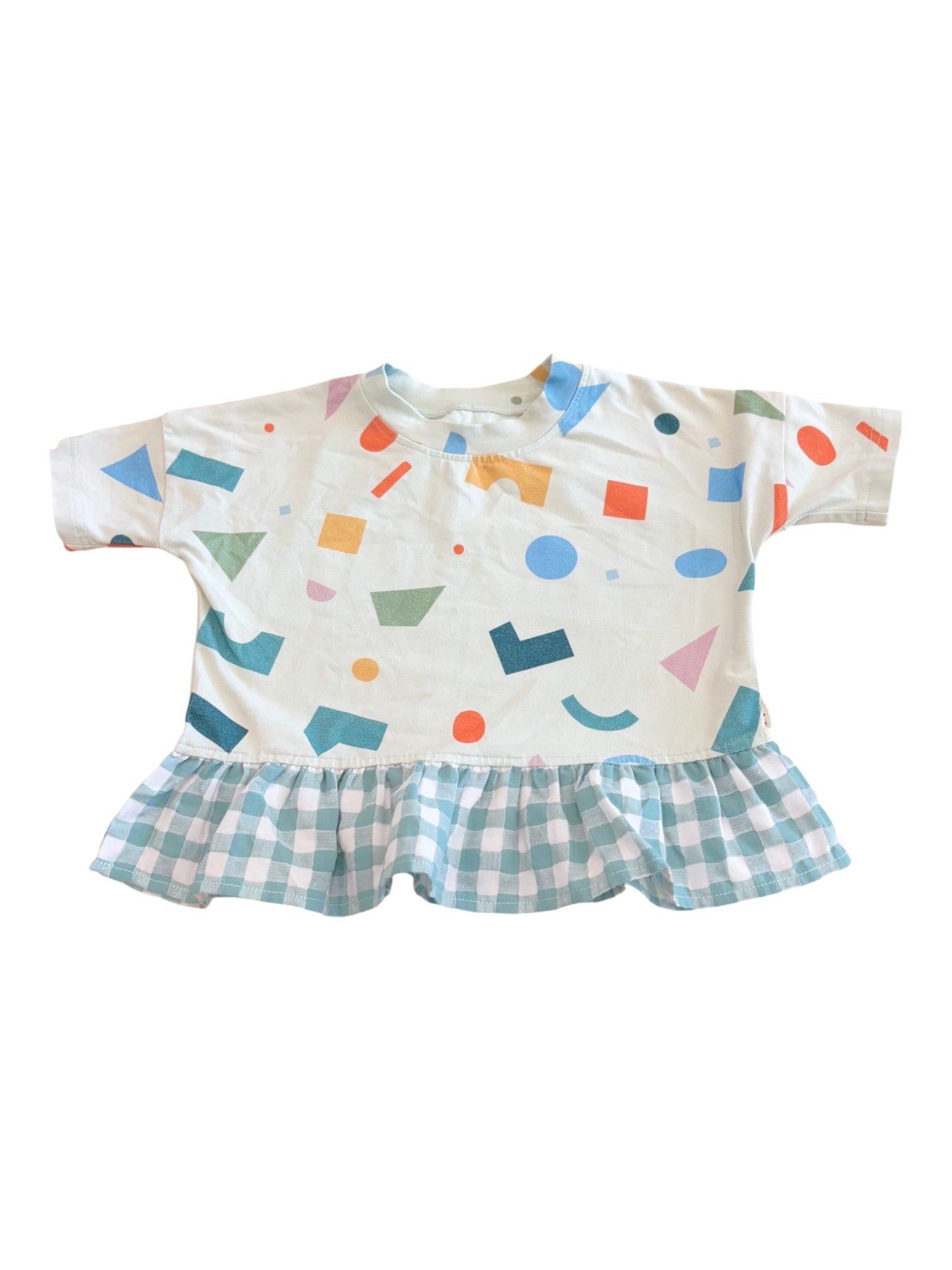 Mint magic meets playful style! This oversized tee features a vibrant multicoloured abstract print and a charming blue gingham ruffle hem. Soft and comfy for little adventurers, size 3.