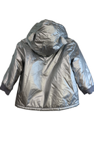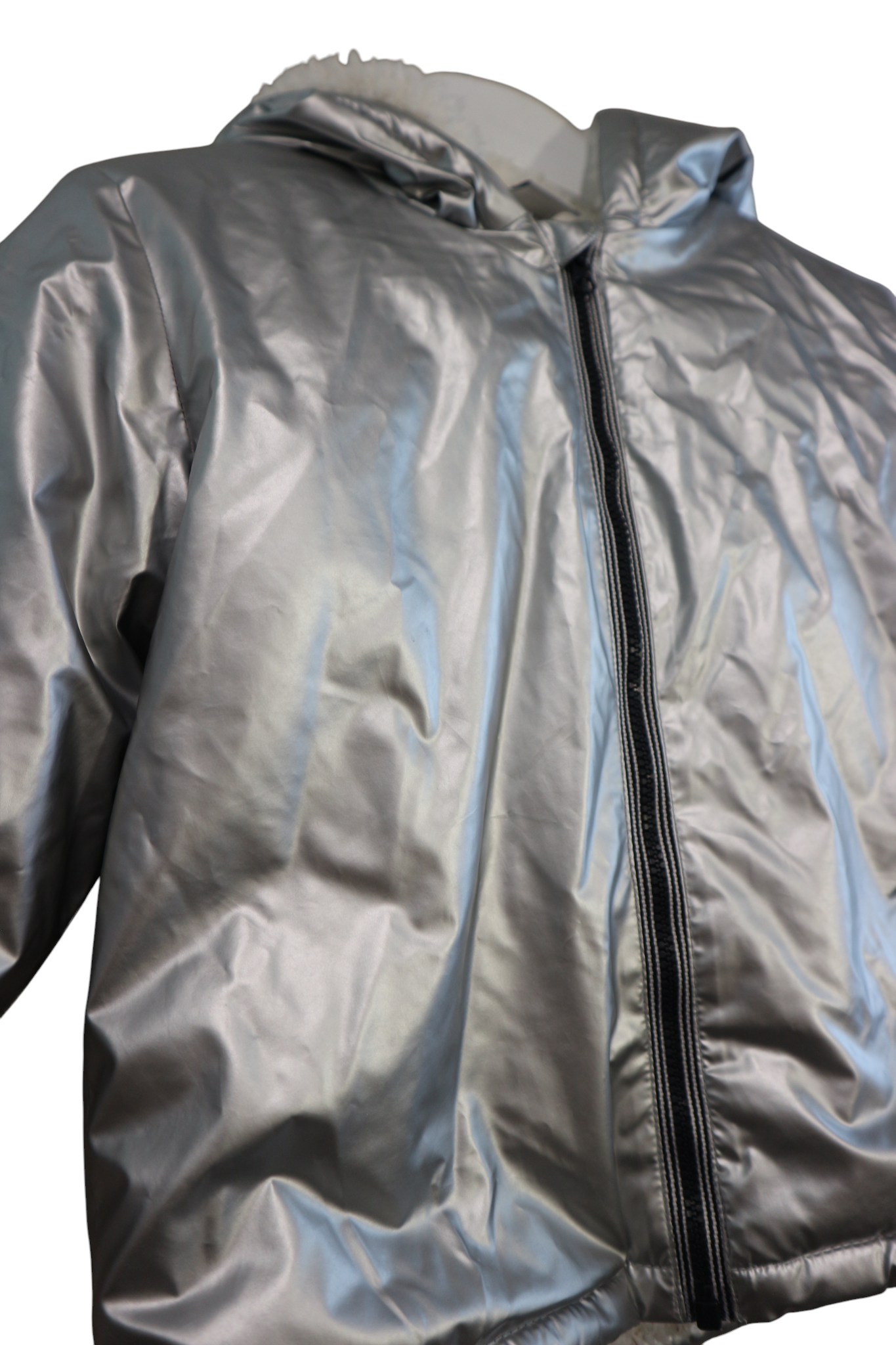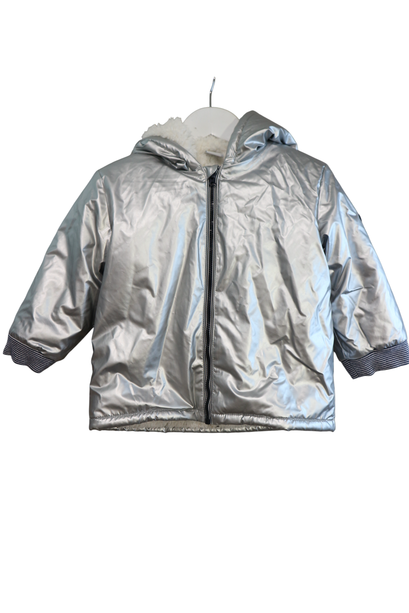 Petit Bateau hooded puffer jacket in silver foil with fluffy white fleece lining, size 2. Polyester (cotton lining).
