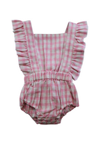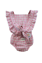 Ponchik pink and cream check playsuit with tie back, size 000. Linen/cotton/polyester.