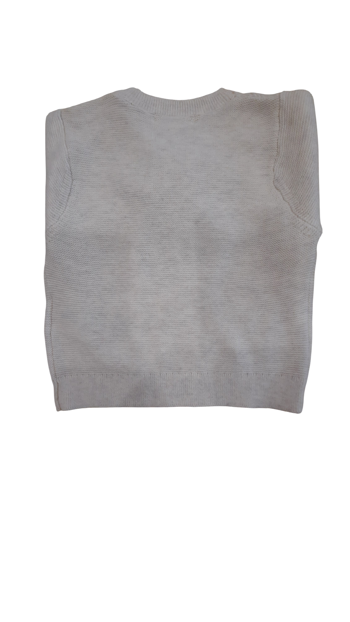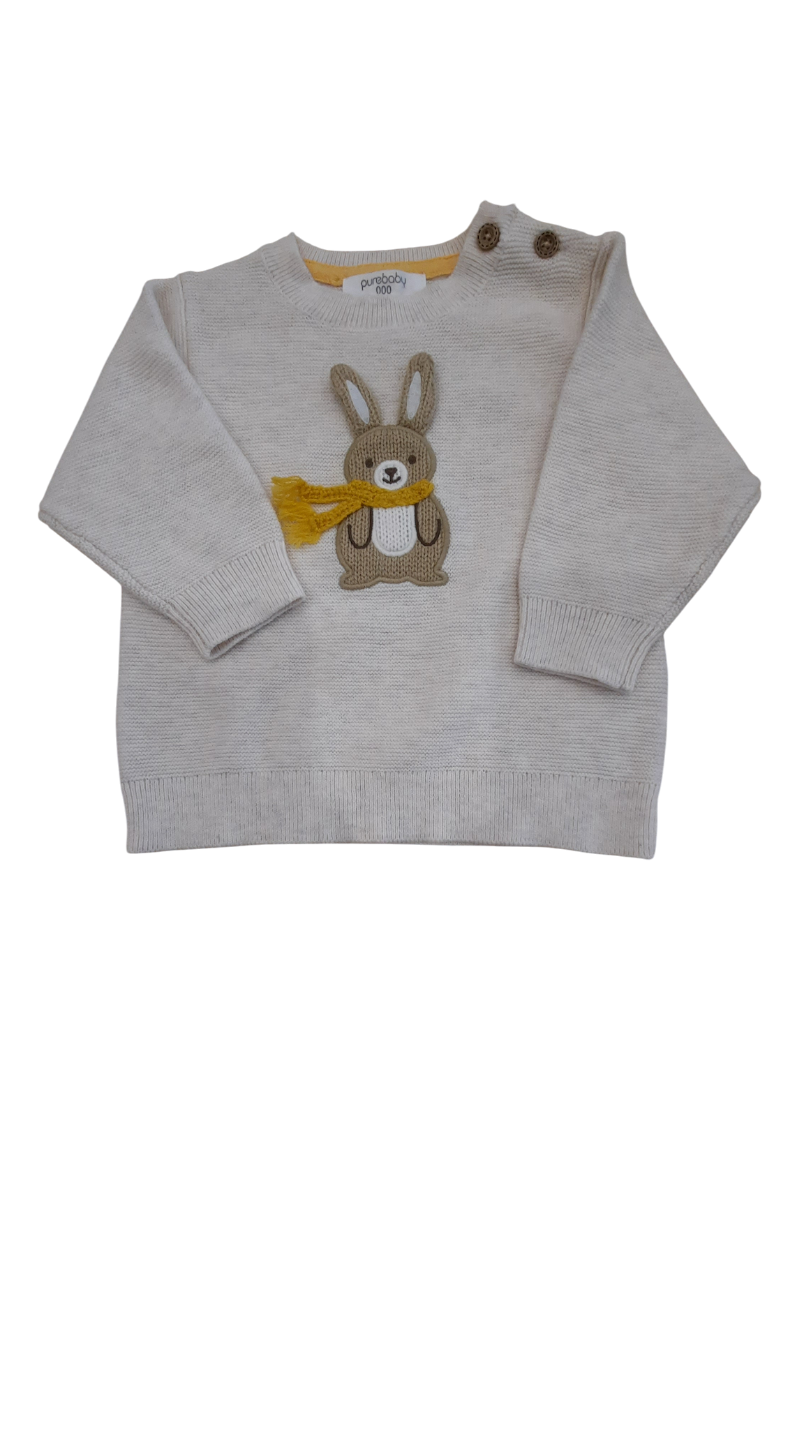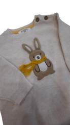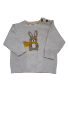 Snuggly beige jumper crafted from a cozy cotton and wool blend that's gentle on delicate skin. Featuring an adorable bunny appliqué, this cheerful knit brings instant charm to any outfit. The natural fibre mix provides warmth without overheating, making it perfect for layering through the seasons. Ideal for cuddles, playtime, and those precious moments when comfort matters most. A timeless piece that'll have little ones hopping with joy! Excellent condition.