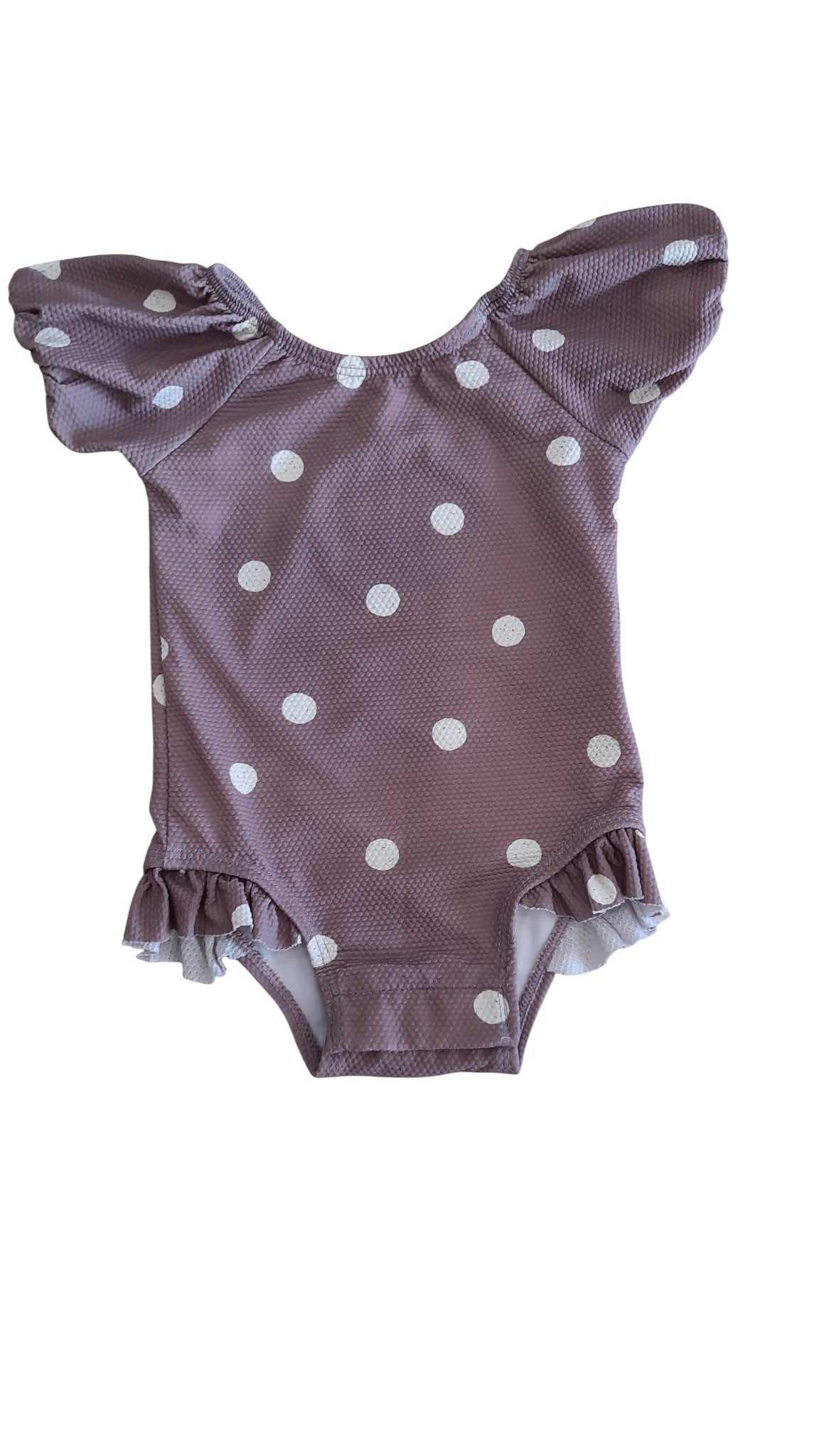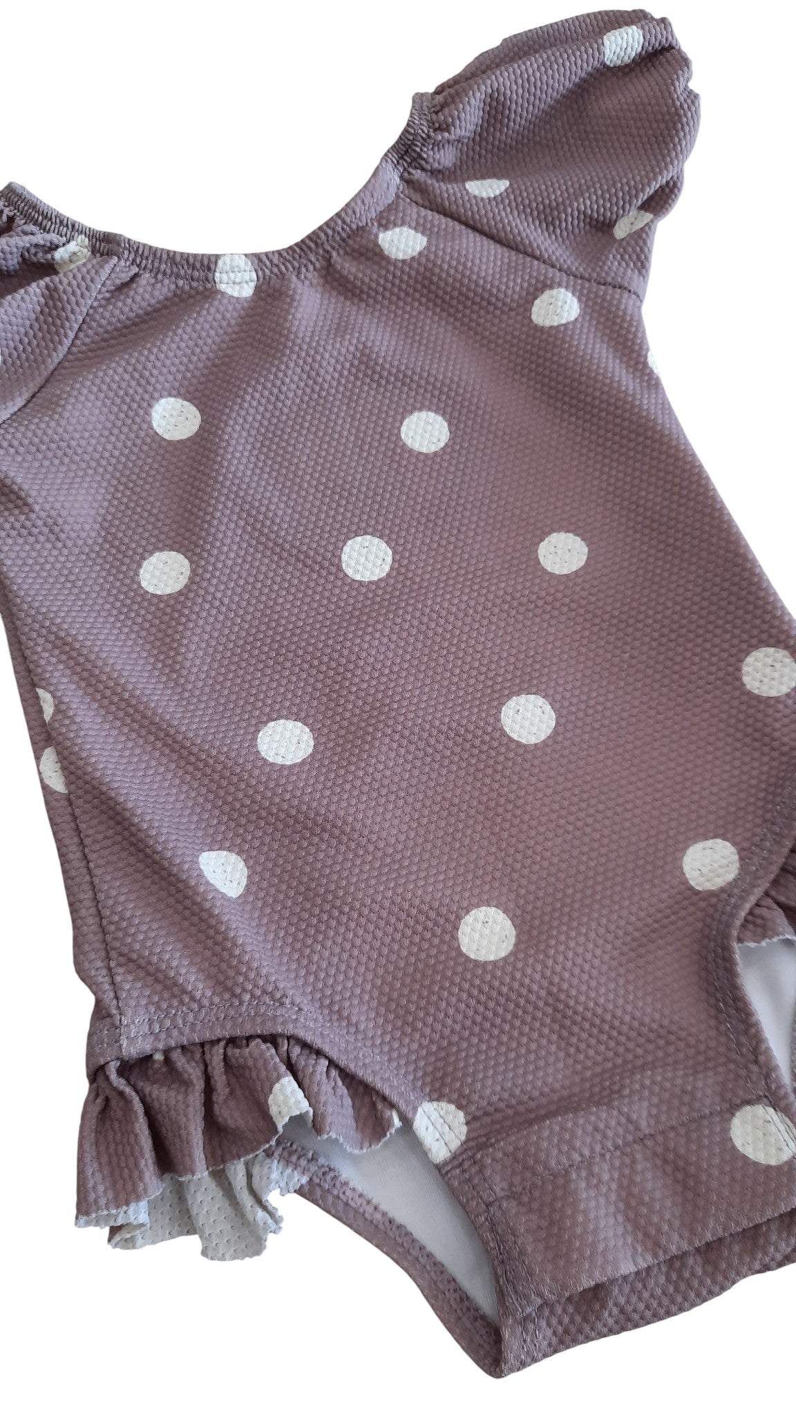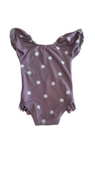 Quincy Mae mauve swimsuit with white polka dots, size 00. Recycled polyamide/elastane (OEKO-TEX certified).