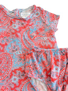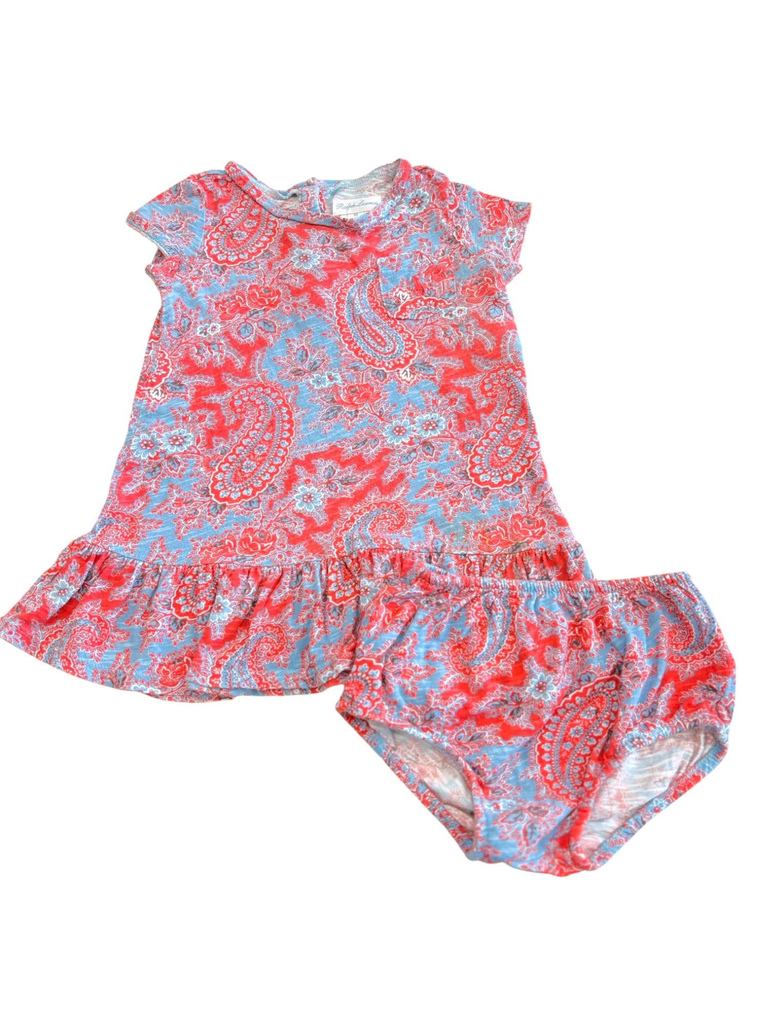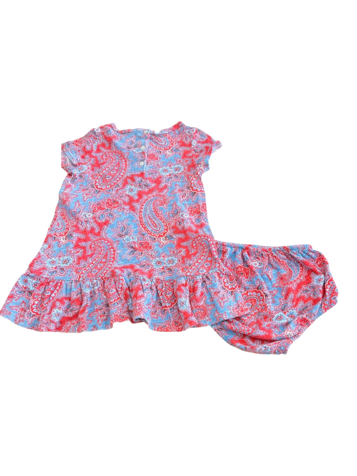This Ralph Lauren dress is pure joy! Lightweight, ultra-soft 100% cotton in a charming red and blue paisley print. Includes matching bloomers for a complete look. Perfect for babies in size 0. Very good condition.