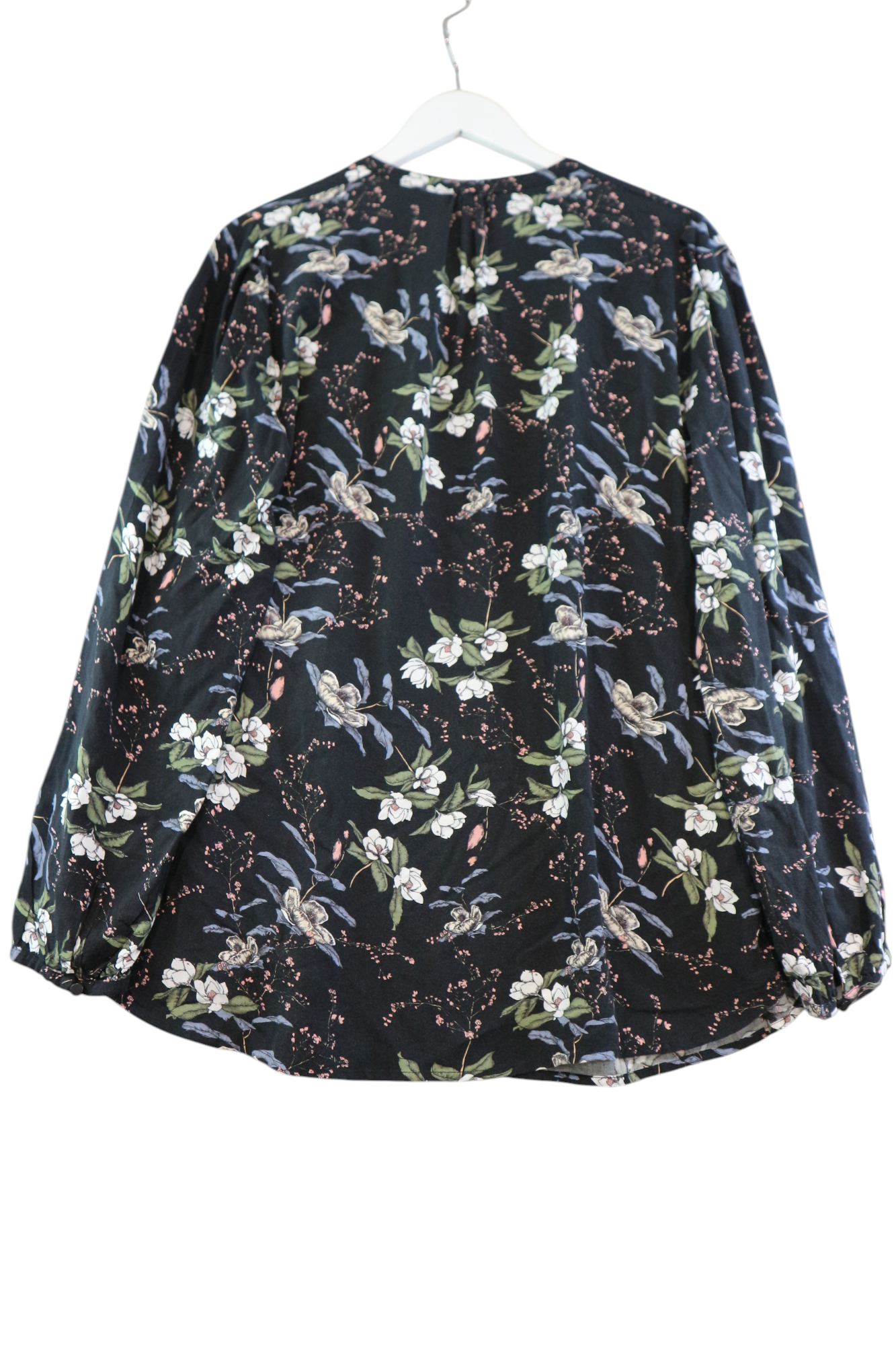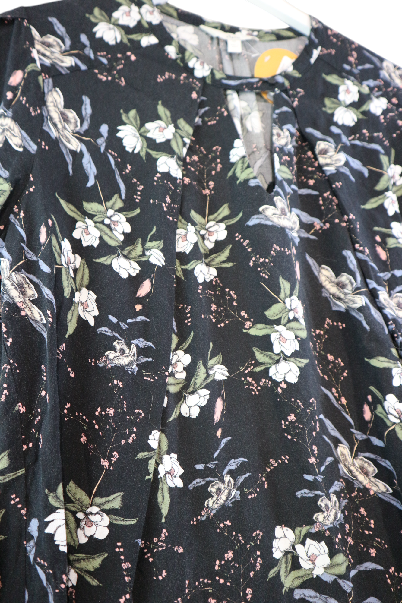 Ripe maternity blouse in black with floral print, size medium. Viscose.
