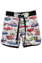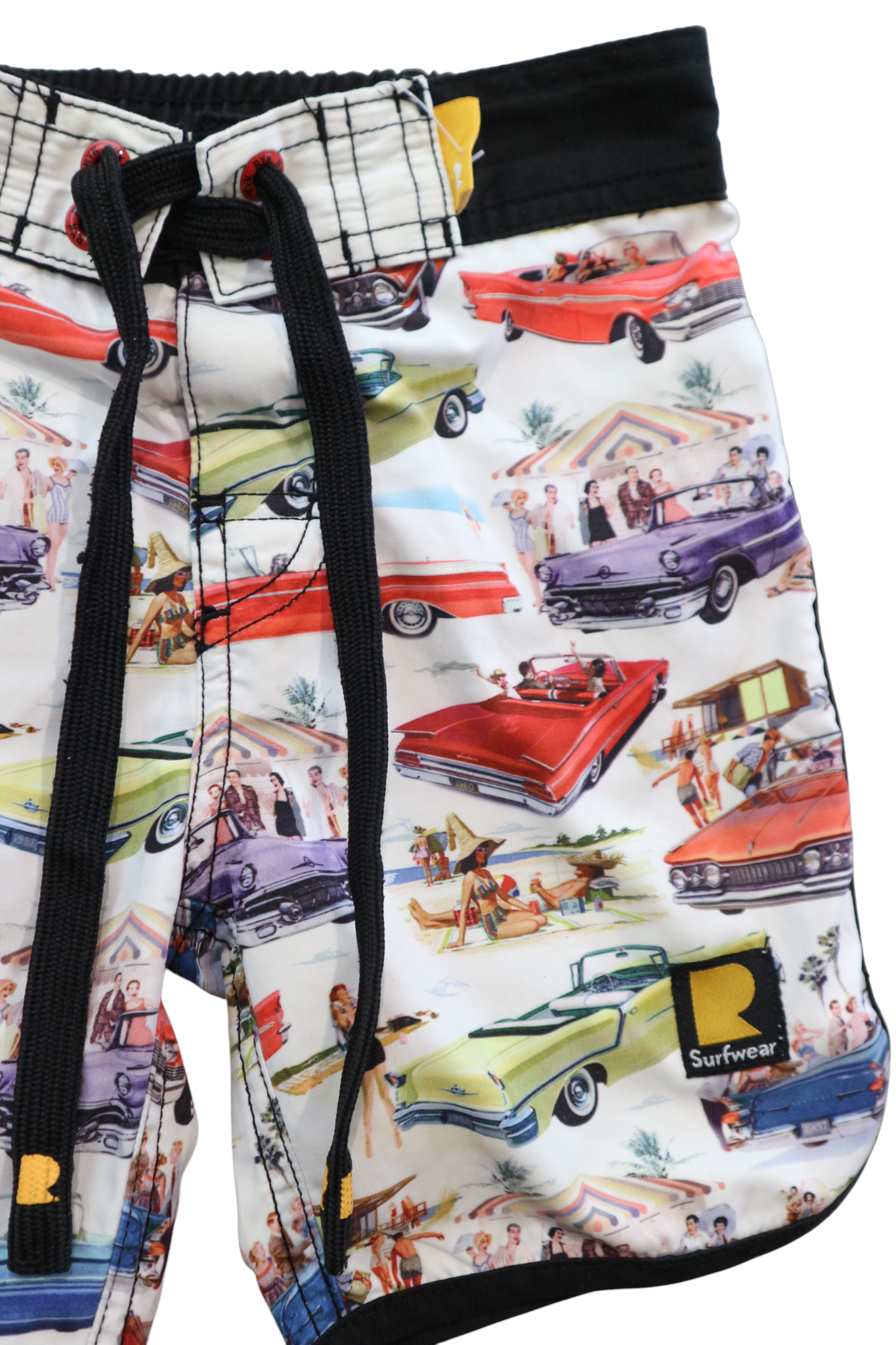 Rock Your Kid boardshorts in white 50s print, size 5. Polyester/nylon.