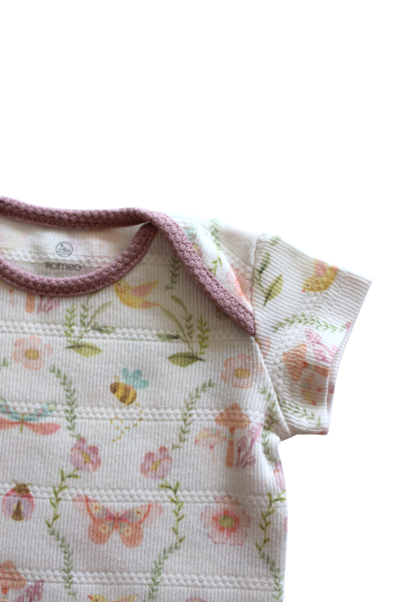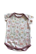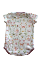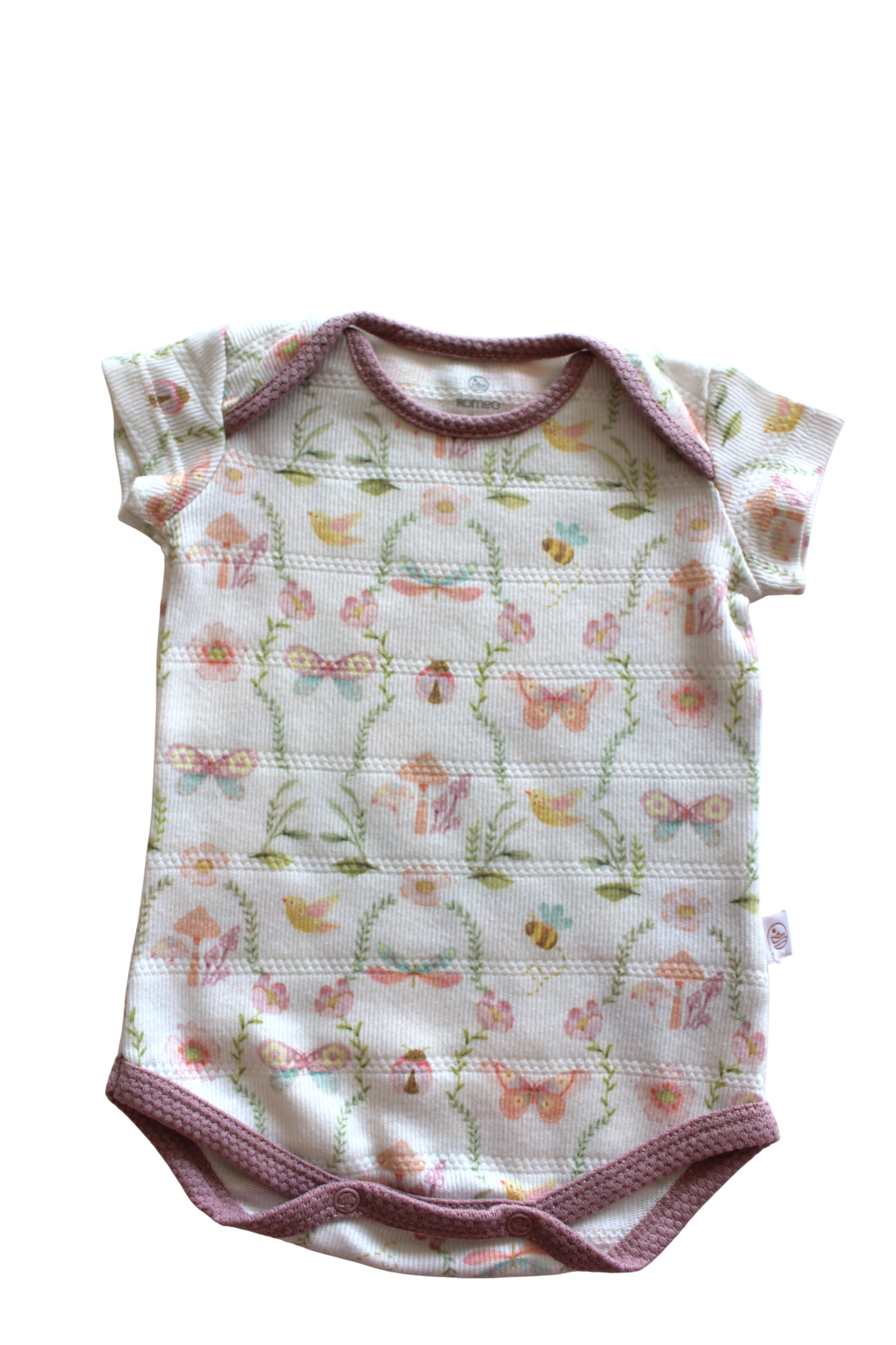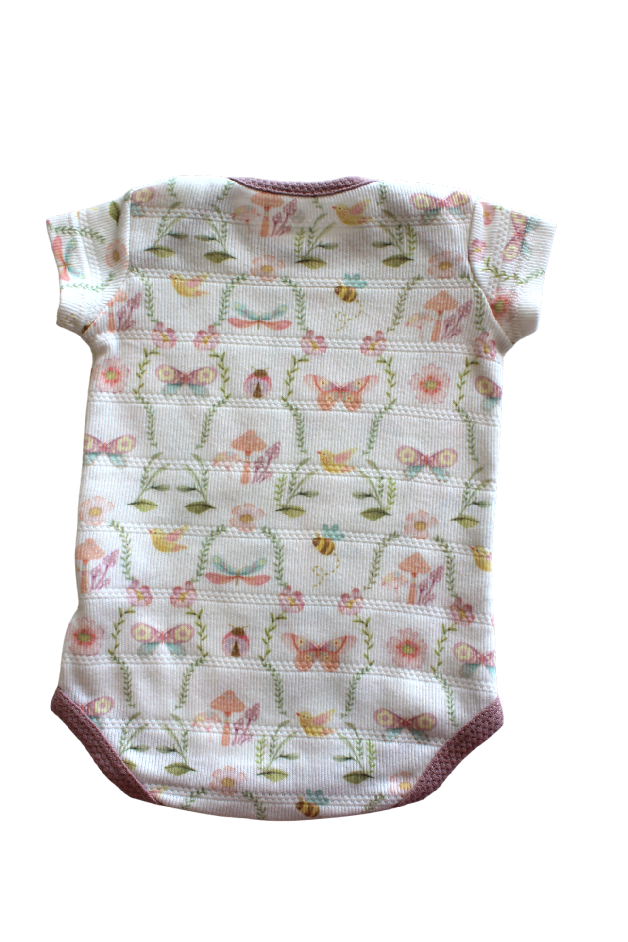 Forester dwellers perfect print bodysuit. with birds, bees and mushrooms. Double popper nappy opening. Pink contrast binding on the neckline and leg holes.