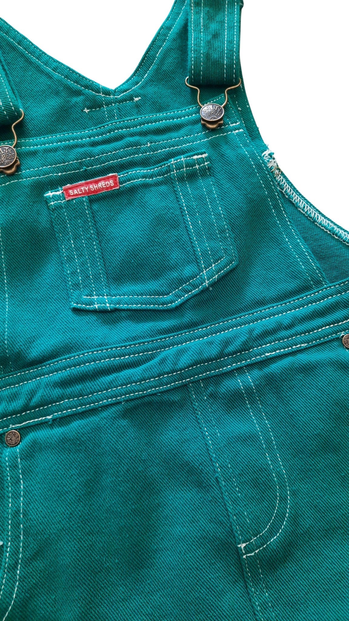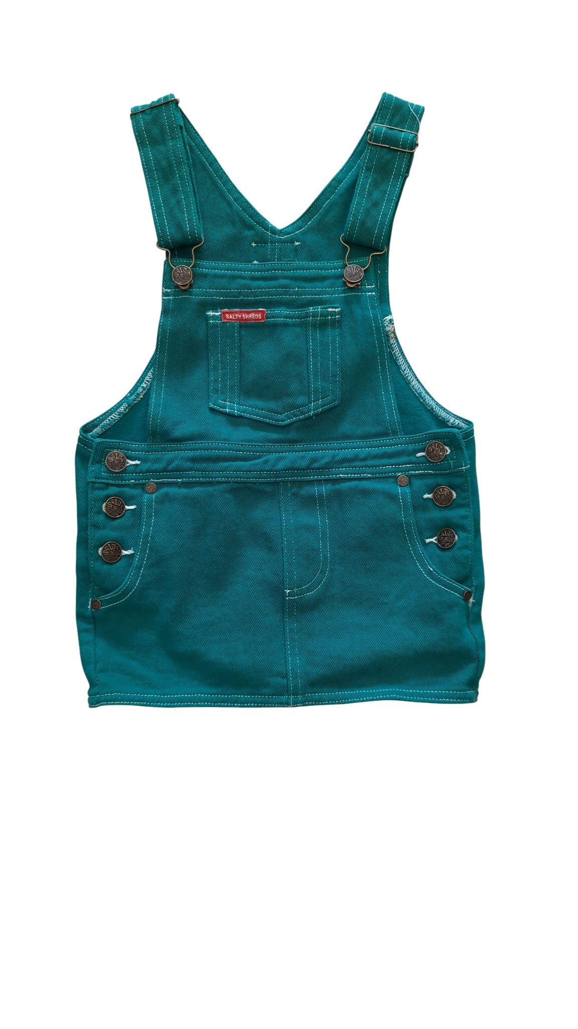 Satly Shreds green denim pinafore in size 3-4yrs. 100% cotton.
