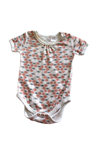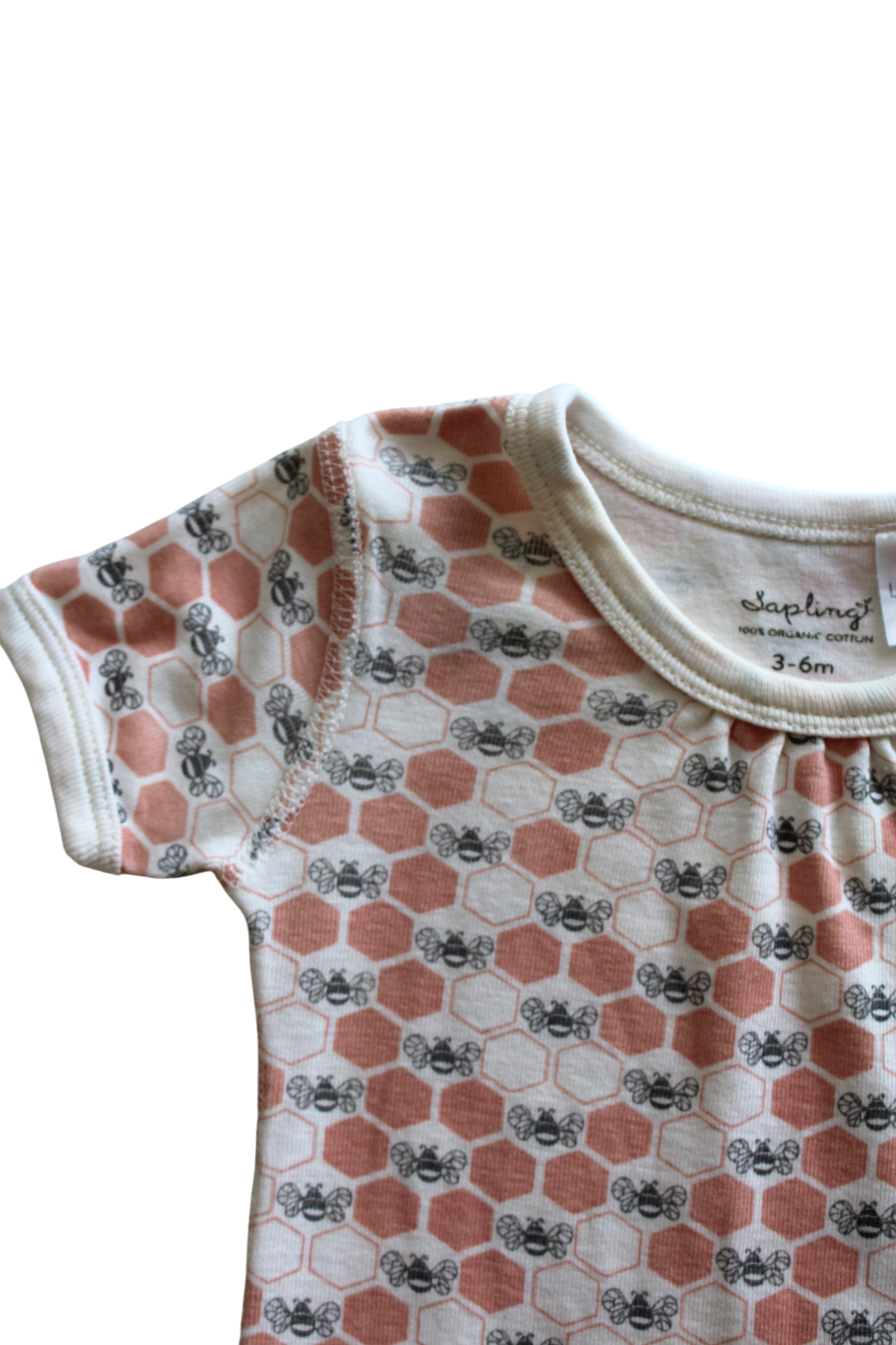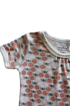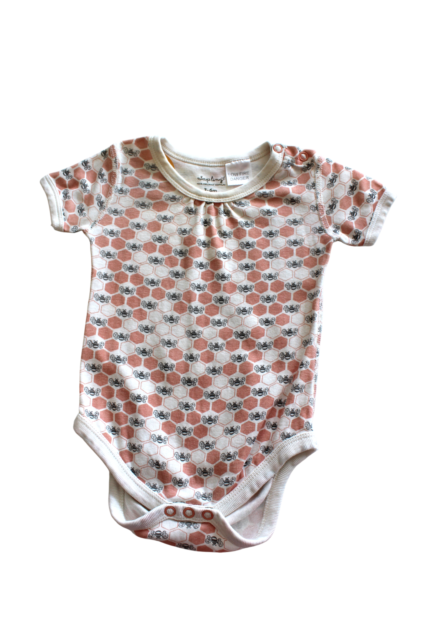 Hexagon bee print bodysuit. Ribbed bound neck, sleeve and leg holes. double popper neckline opening and three popper nappy opening. beautiful small pucker details on the centre front and back legs. Designed in Australia.