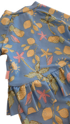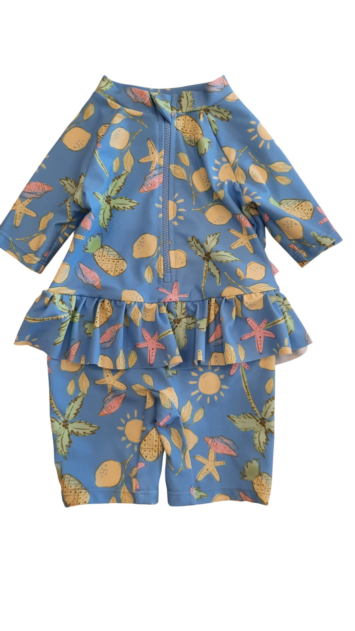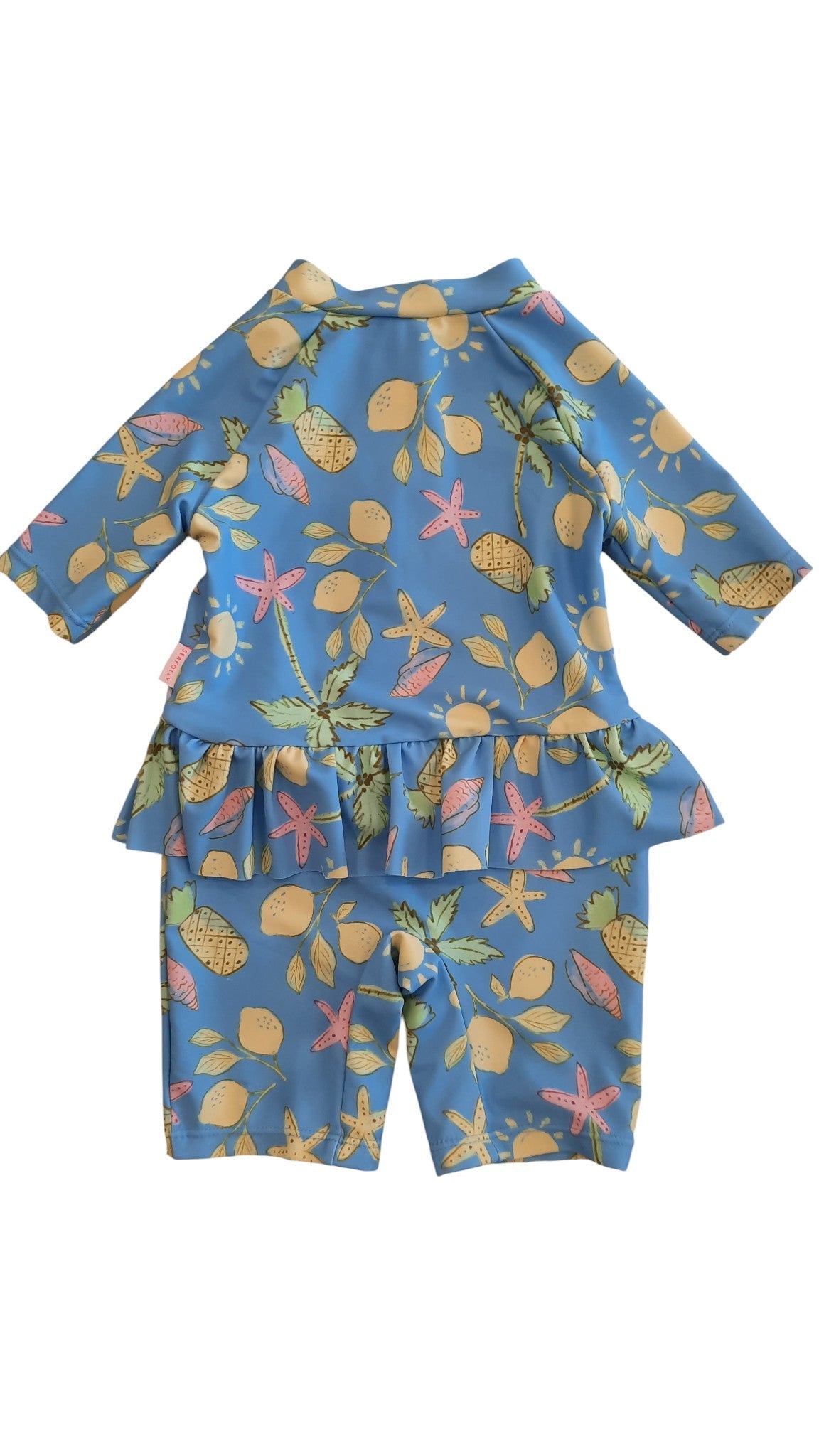 Seafolly Baby sunsuit in blue with summer print, size 0. Polyester/elastane.
