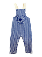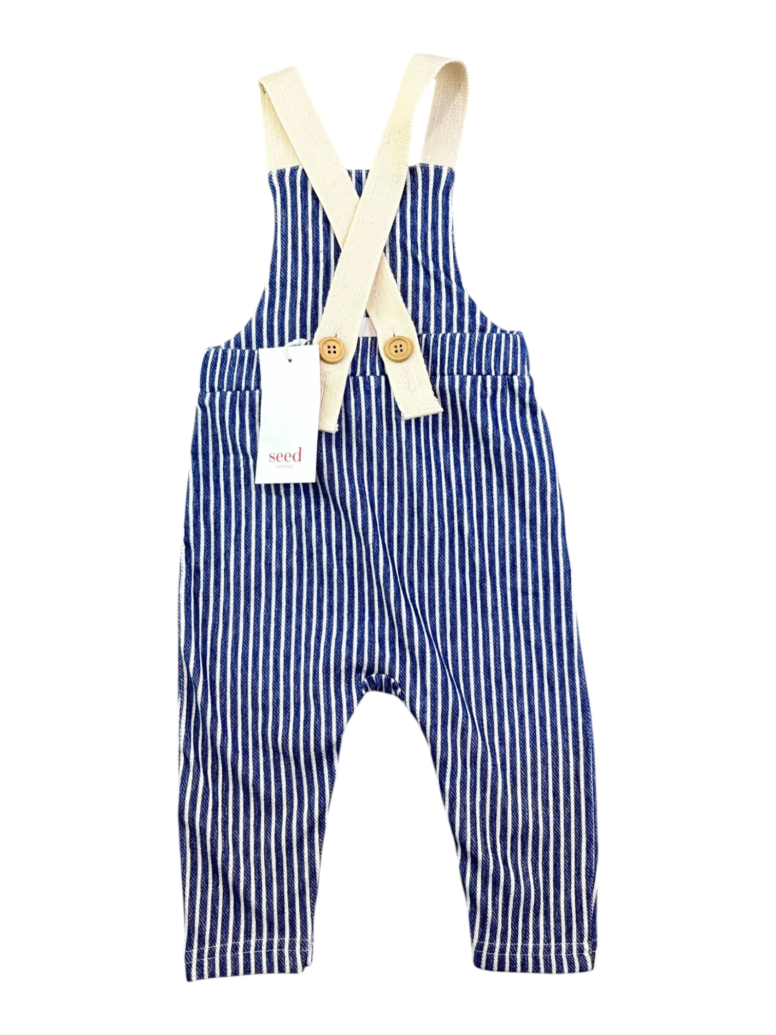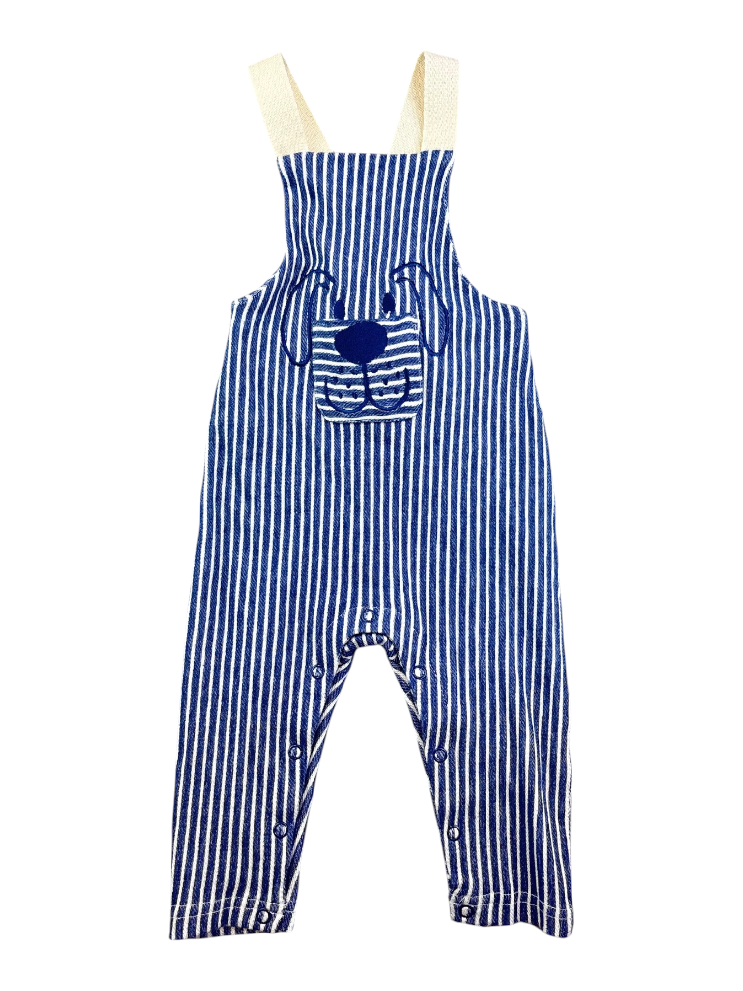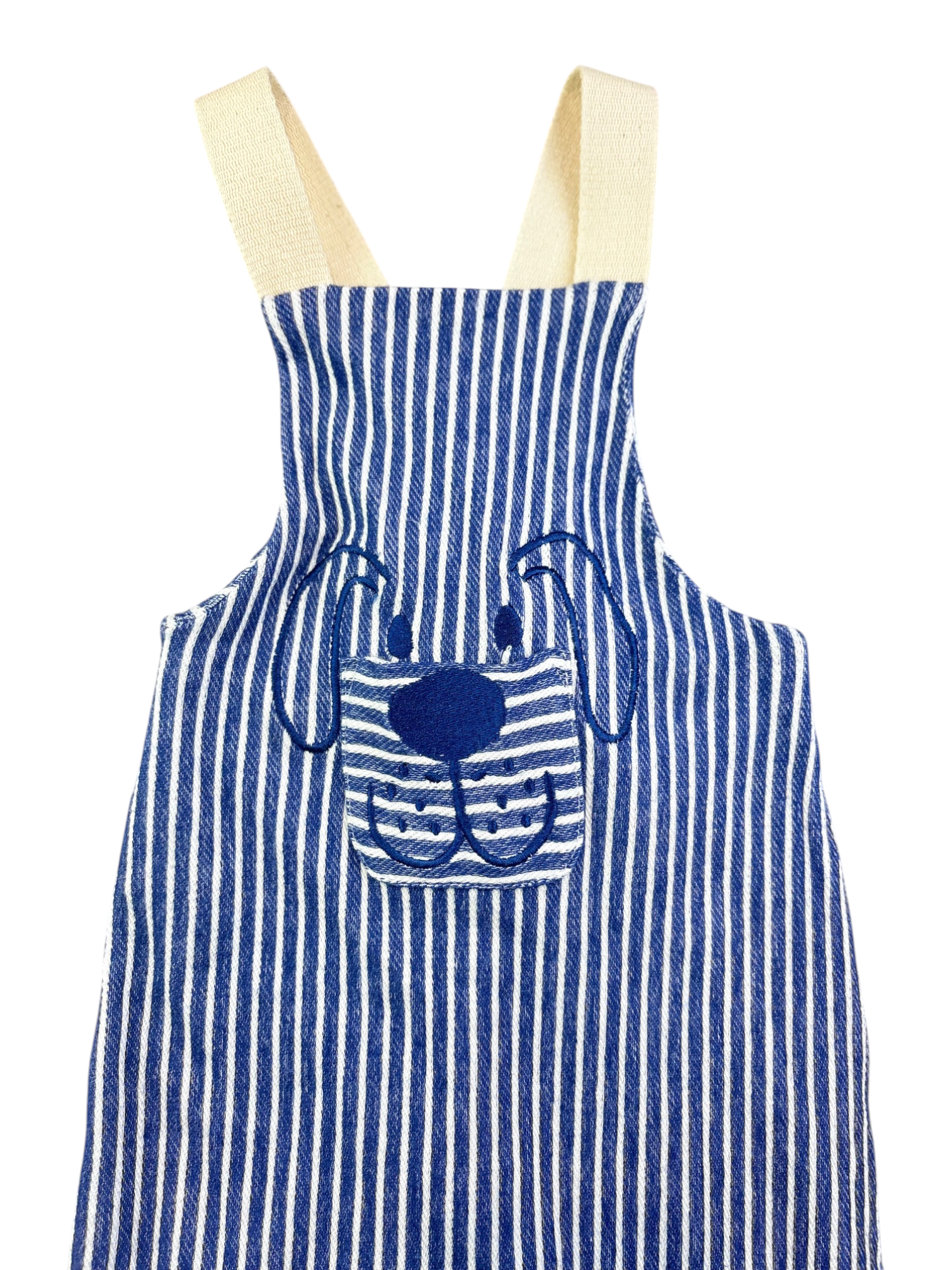 Cute navy pinstripe overalls for tiny adventurers! These size 000 overalls feature contrast cream straps, a cute pocket/ embroidered dog detail, and ultra-soft/ stretchy fabric. Perfect for playtime and everyday layering.