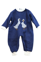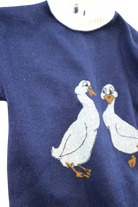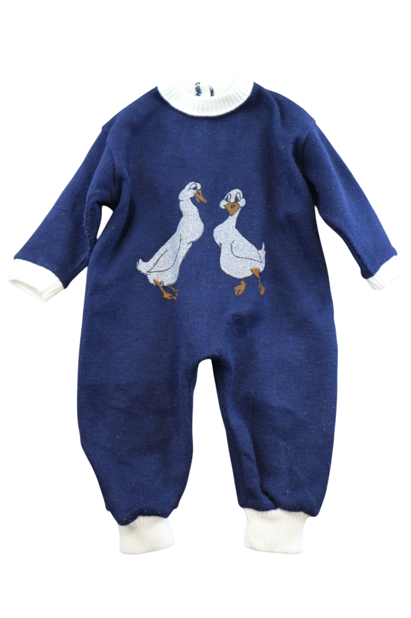 Vintage Target knit jumpsuit in navy with twin duck print, size 0. Acrylic. Made in Australia.