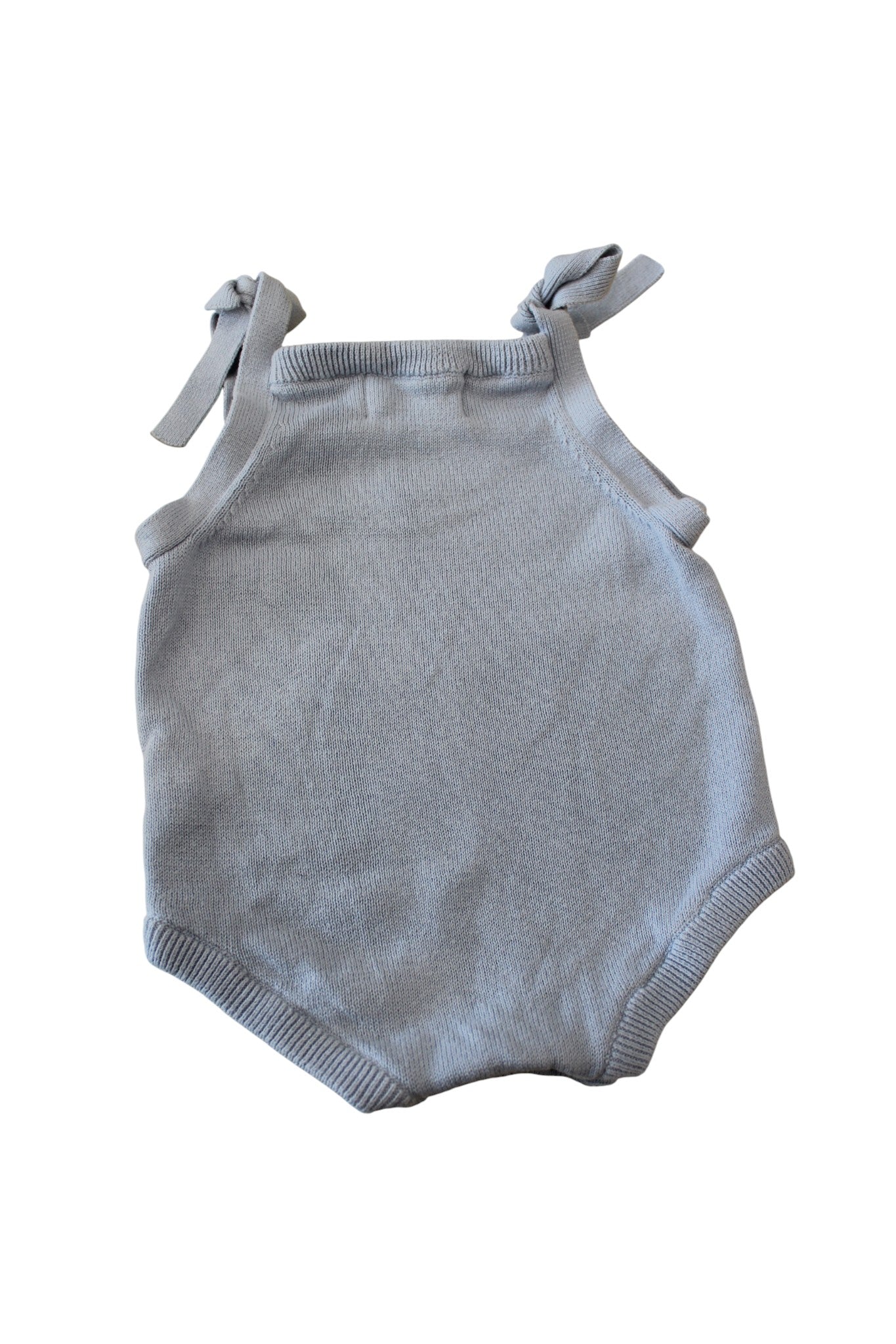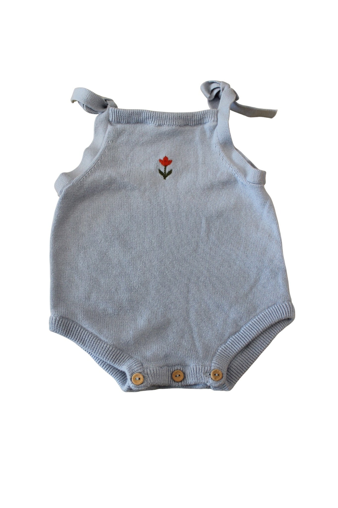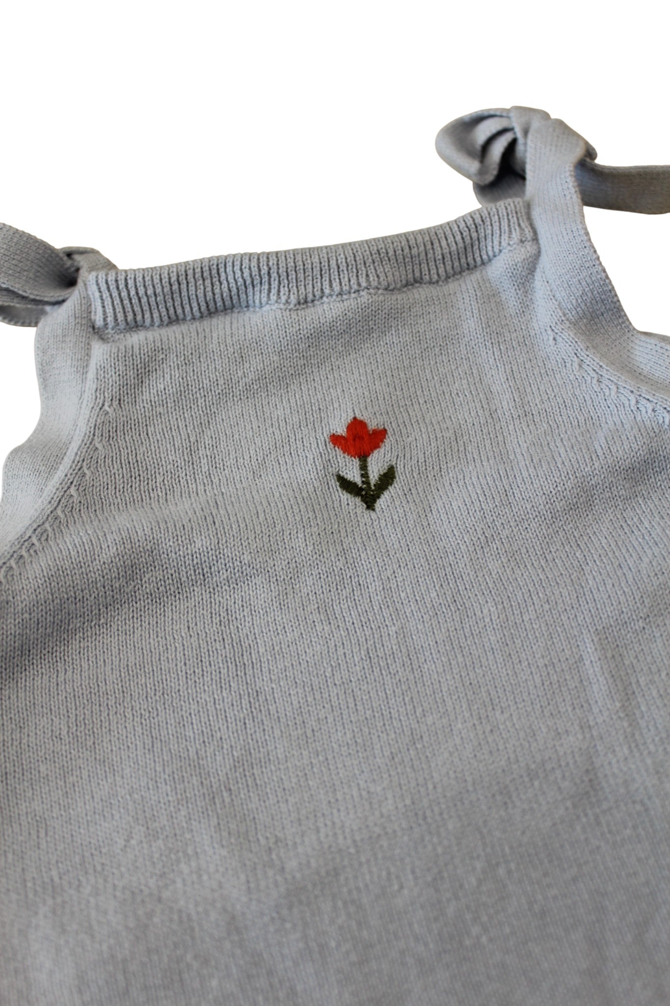 This baby blue knit bodysuit from The Rest is made from 100% organic cotton for gentle softness. Featuring adorable orange flower embroidery and adjustable tie-straps, it combines comfort with charming style for your little one’s everyday adventures. Very good condition.