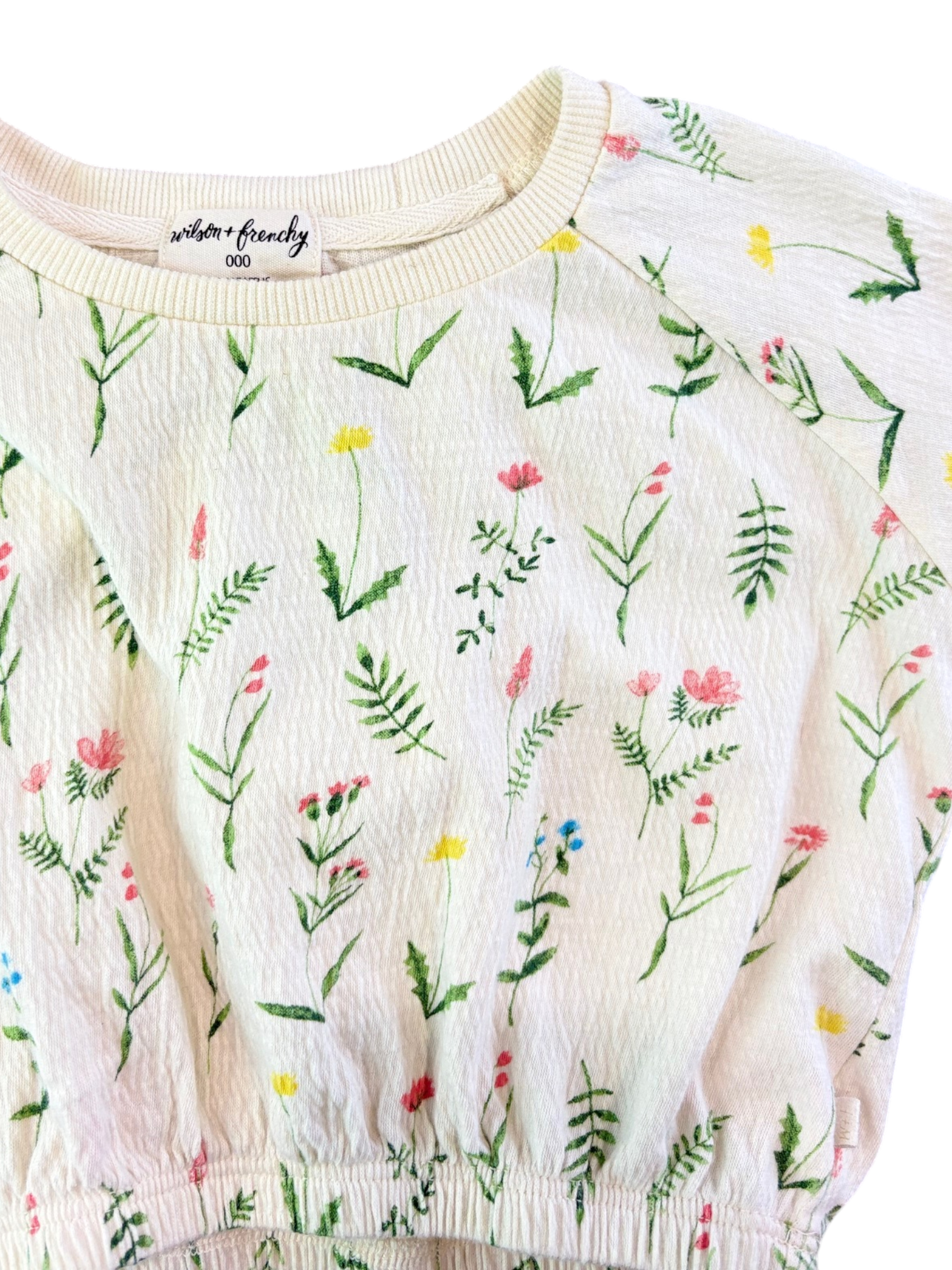 Oversized cream Wilson & Frenchy tee, with a cinched waist hem and a delicate floral print. Ultra-soft, lightweight and crafted with a cotton, polyester and elastane blend, it's the perfect pick for your little one's summer adventures.