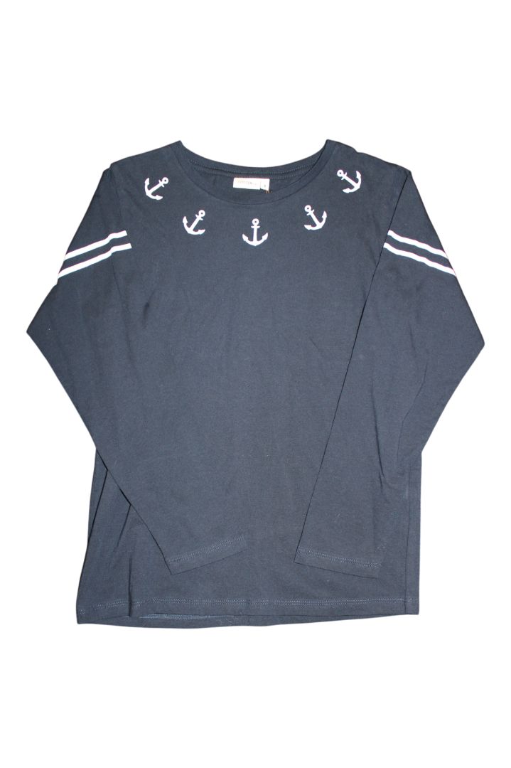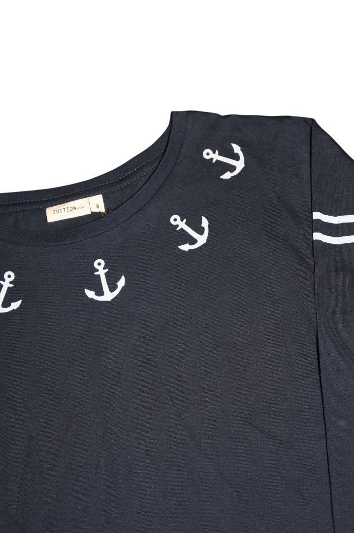 Set sail with style in this navy blue long-sleeve tee featuring a charming anchor print. Perfect for kids who love nautical vibes, it's the kind of top that works year-round—layered under jackets in winter or worn solo when the weather warms up. Soft, durable fabric stands up to everyday wear and washing, while the classic anchor design never goes out of style. Whether they're heading to school or weekend adventures, this tee is a wardrobe workhorse that keeps them looking effortlessly cool.