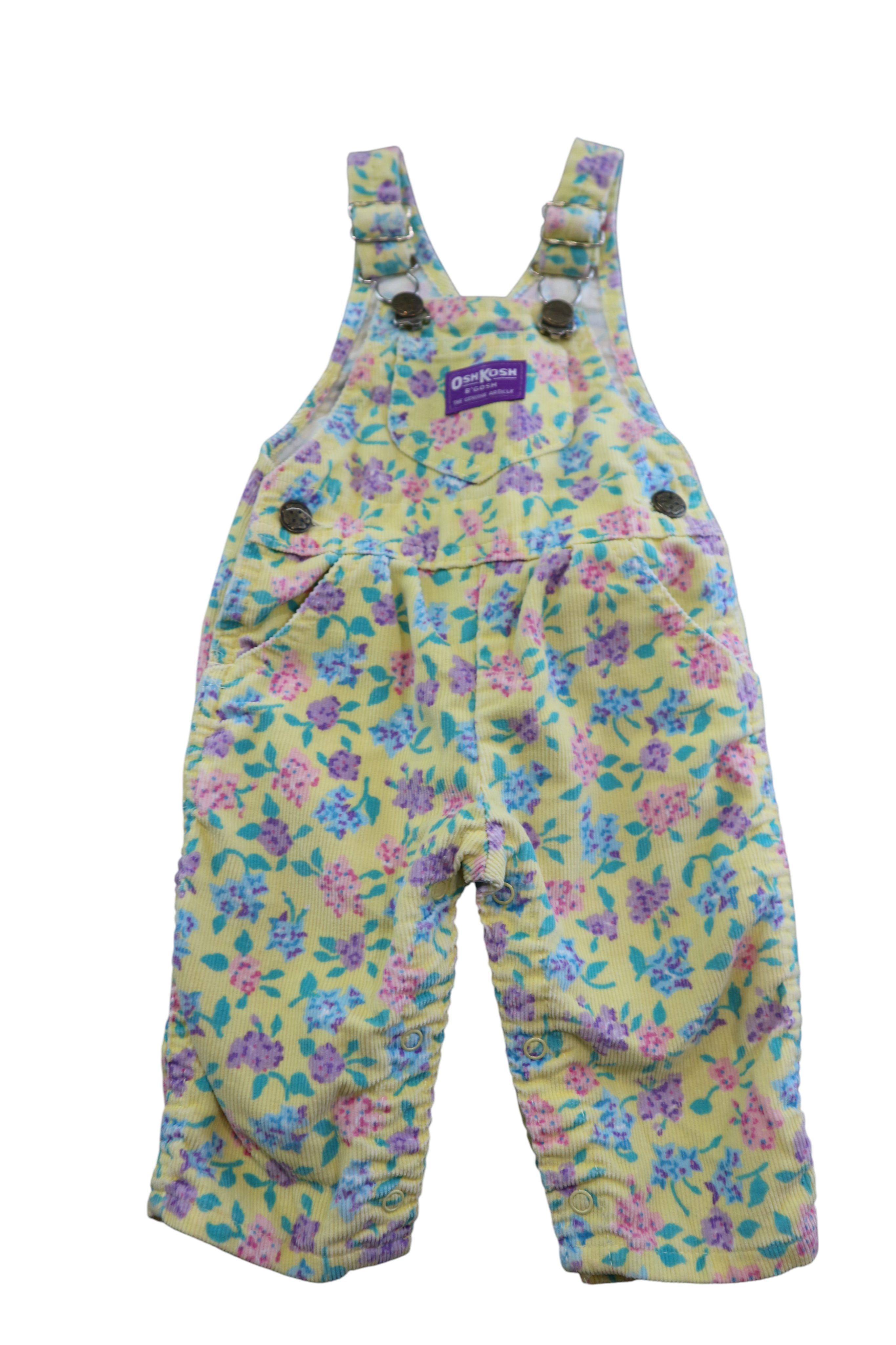 Vintage OshKosh overalls in yellow corduroy with floral print, size 00. Made in USA. Cotton.