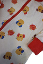 This Goldie & Ace baby jumpsuit in soft cream is adorned with playful orange koalas and cheerful red suns, bringing fun and brightness to any day. Featuring bold red trim and an easy zip closure, it makes dressing your little one simple and enjoyable. Perfect for little adventurers ready to explore! Size 00.