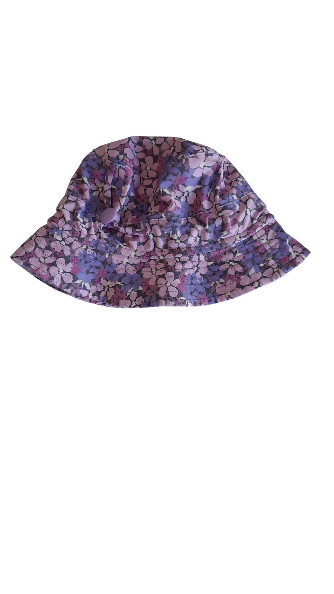 Econaps purple floral swim hat with neck tie. Size small (3-6months). Recycled polyester/spandex.