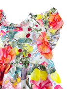 The Kip & Co Playsuit is a delightful blend of comfort and charm. Made from soft linen, it features a vibrant multi-coloured floral print on a white background, with gentle waist and sleeve ruffles adding a playful touch. Snap fasteners at the crotch and back make changes simple, while the embroidered silver crescent moon brings a magical finish to this sweet little outfit. Size 000.