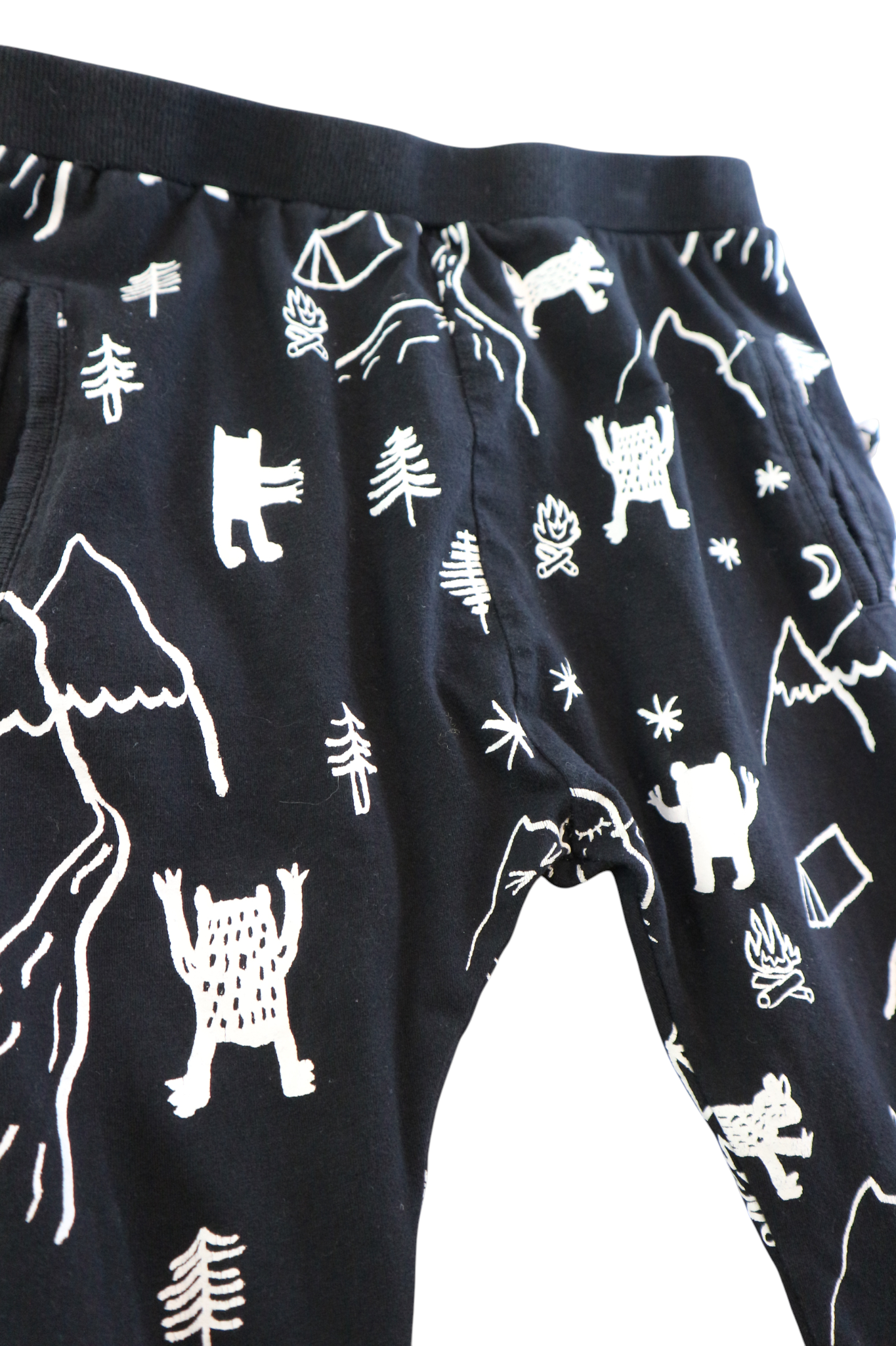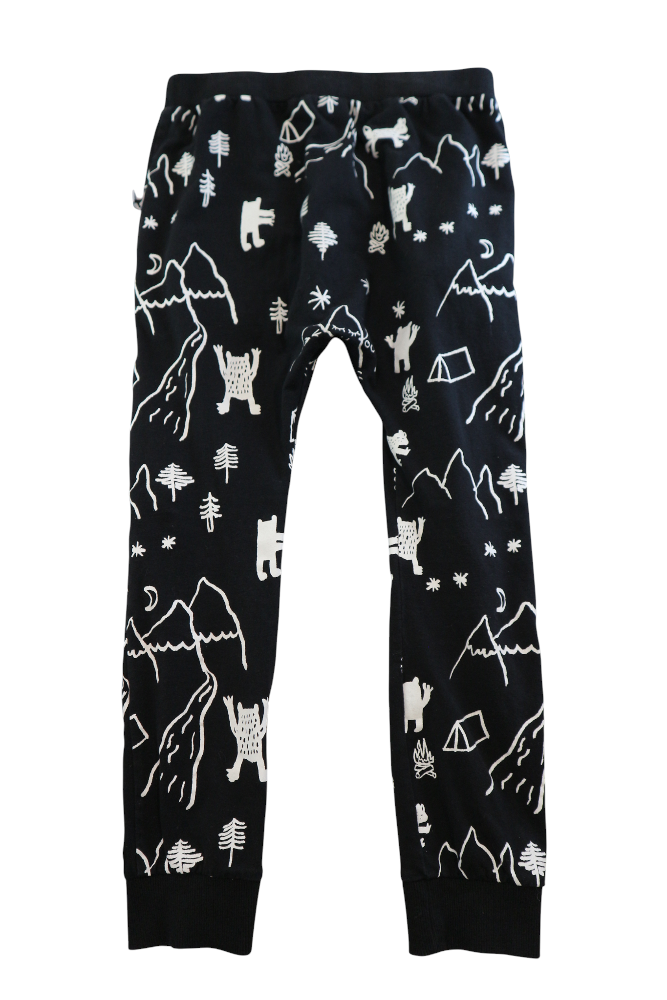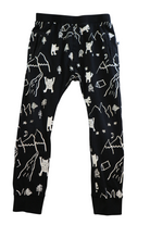 Minti black drop crotch pants with print, size 8. Cotton/elastane.