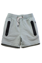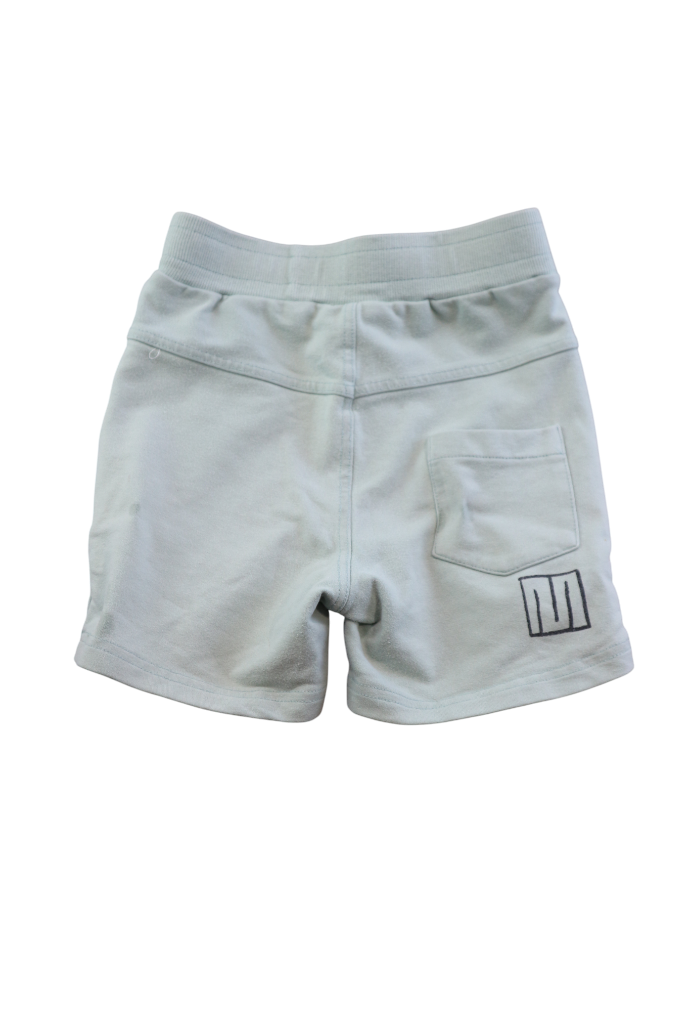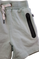 Minti pale green pull-on shorts with zip pockets and tie waist, size 4. Cotton/elastane.