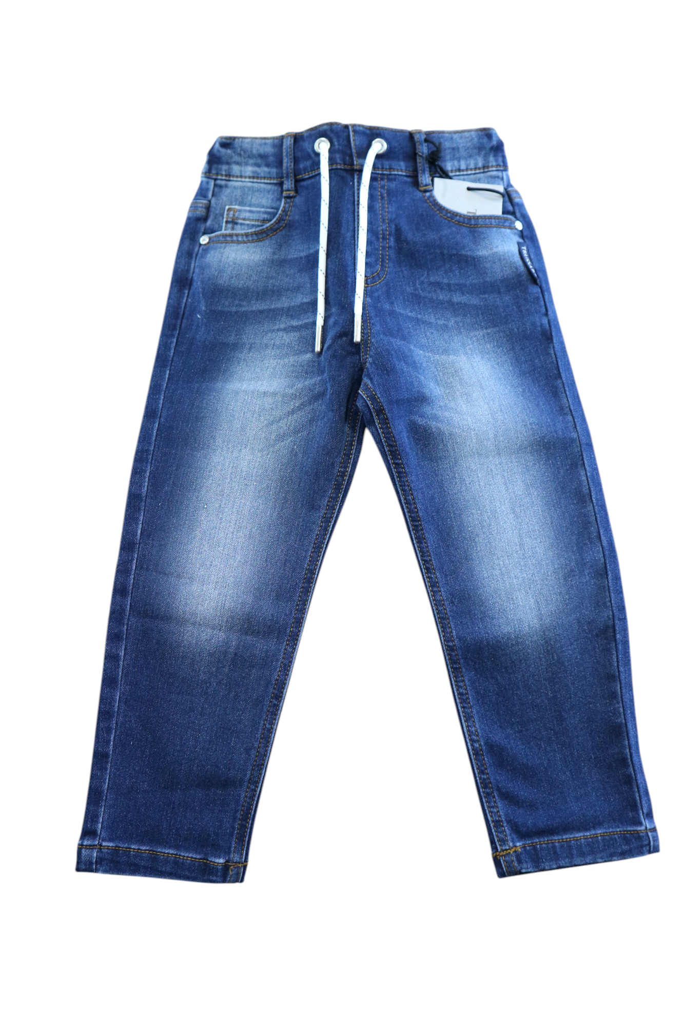 Trussardi Junior blue denim pull on jeans with tie waist, size 3. Cotton/spandex/polyester.