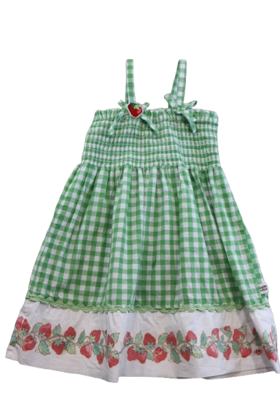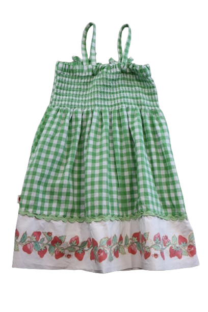 Goldie + Ace green gingham dress with smocking detail and strawberry print hem, size 5. Cotton.