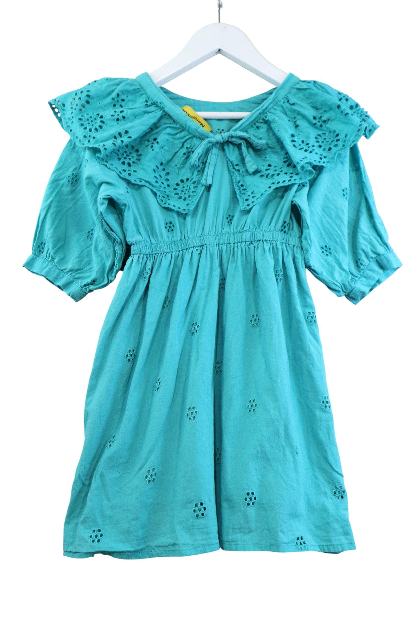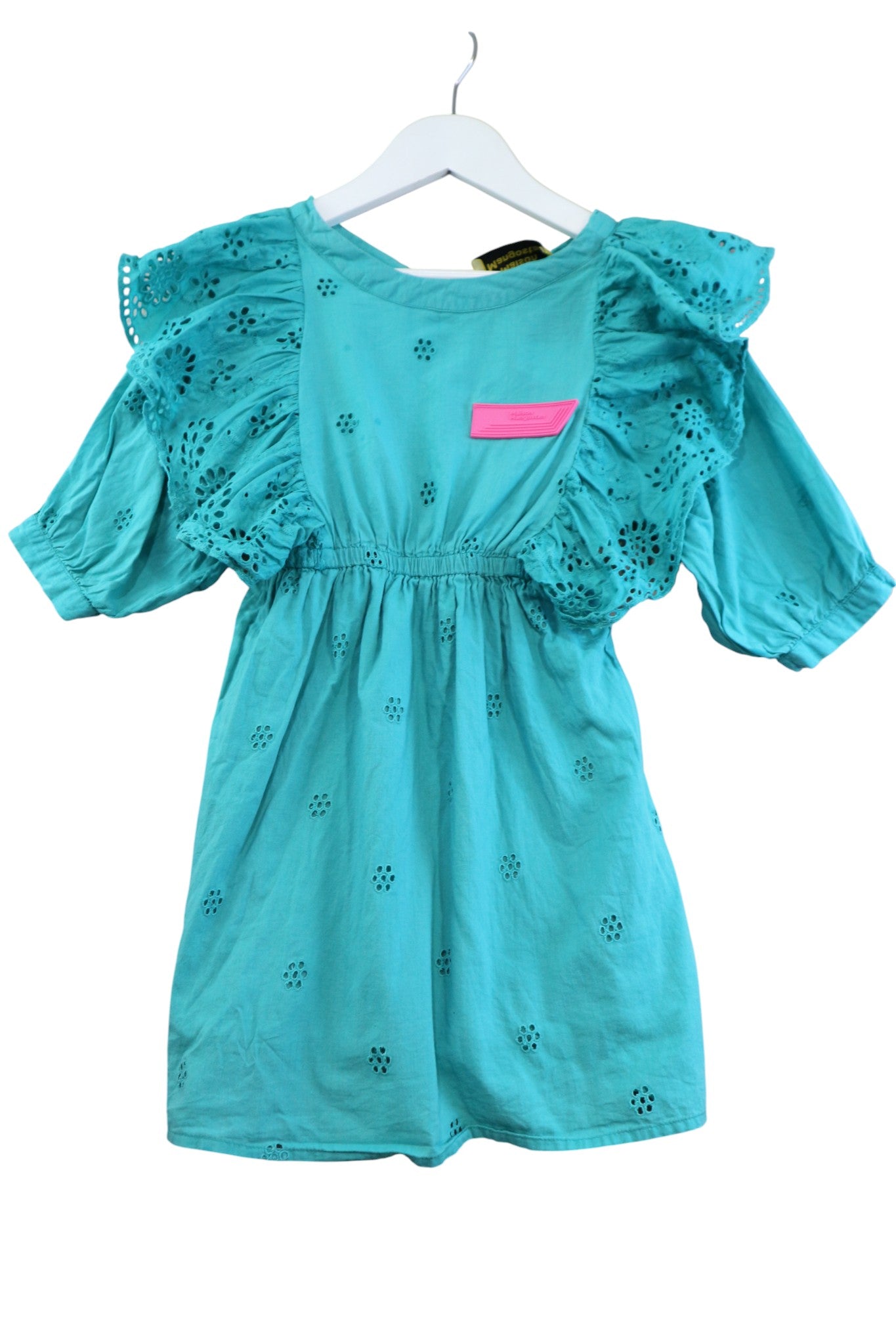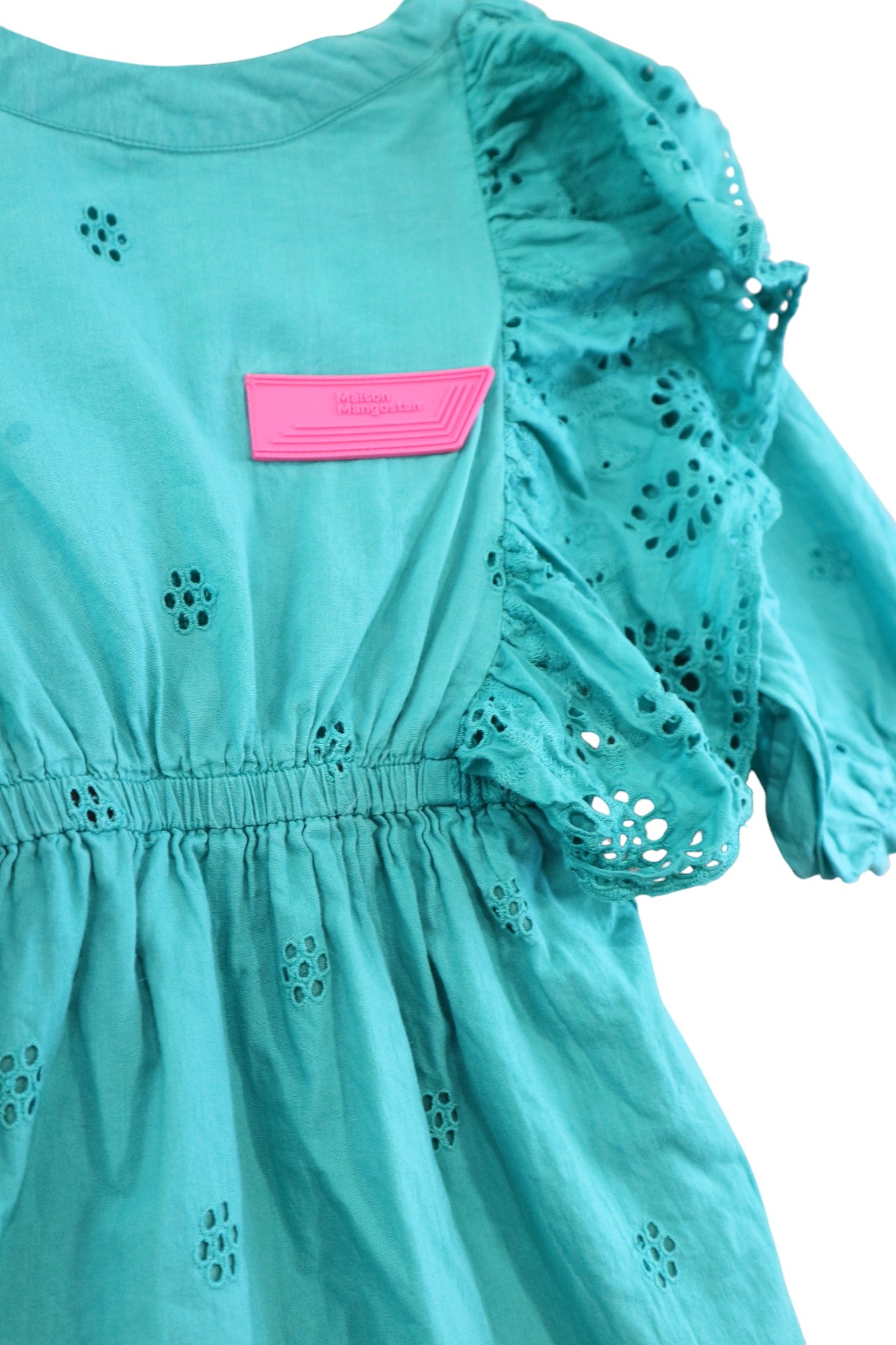 Maison Mangostan teal dress with rubber logo, size 4. Lined.