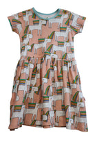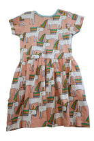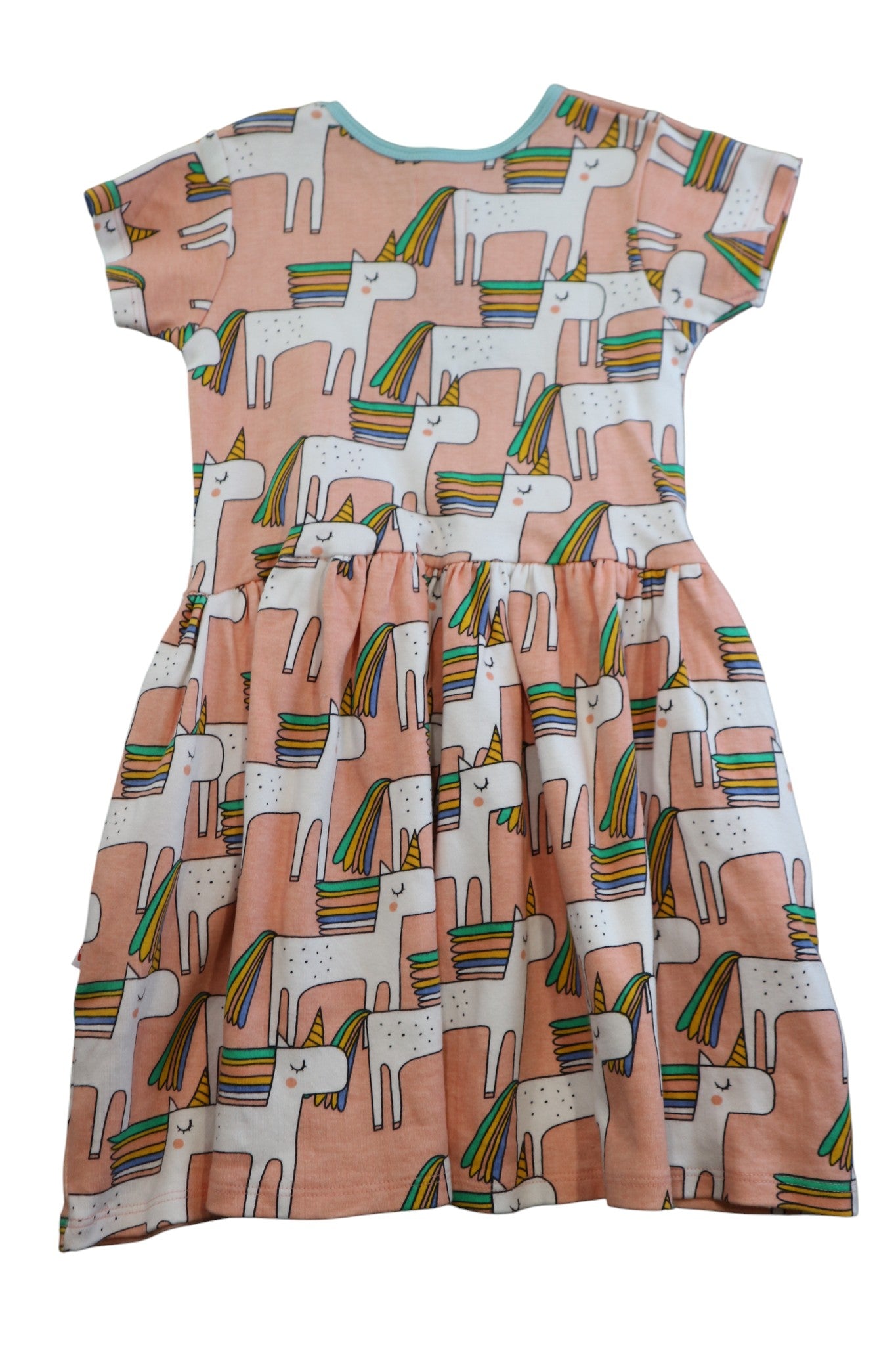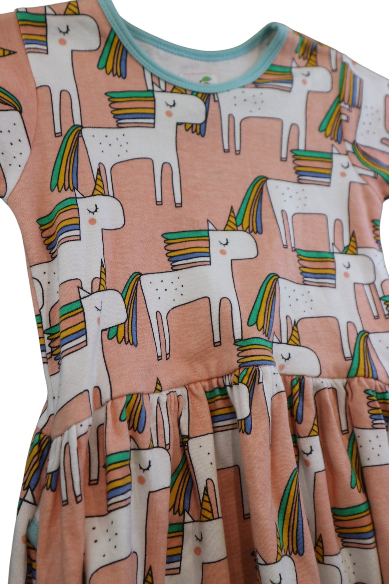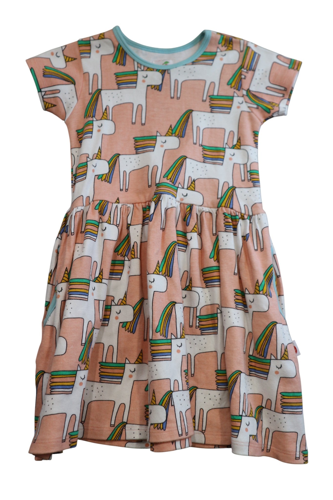 Oobi dress in peach with all-over unicorn print, approx. size 4-5yrs (tags cut). 100% cotton.
