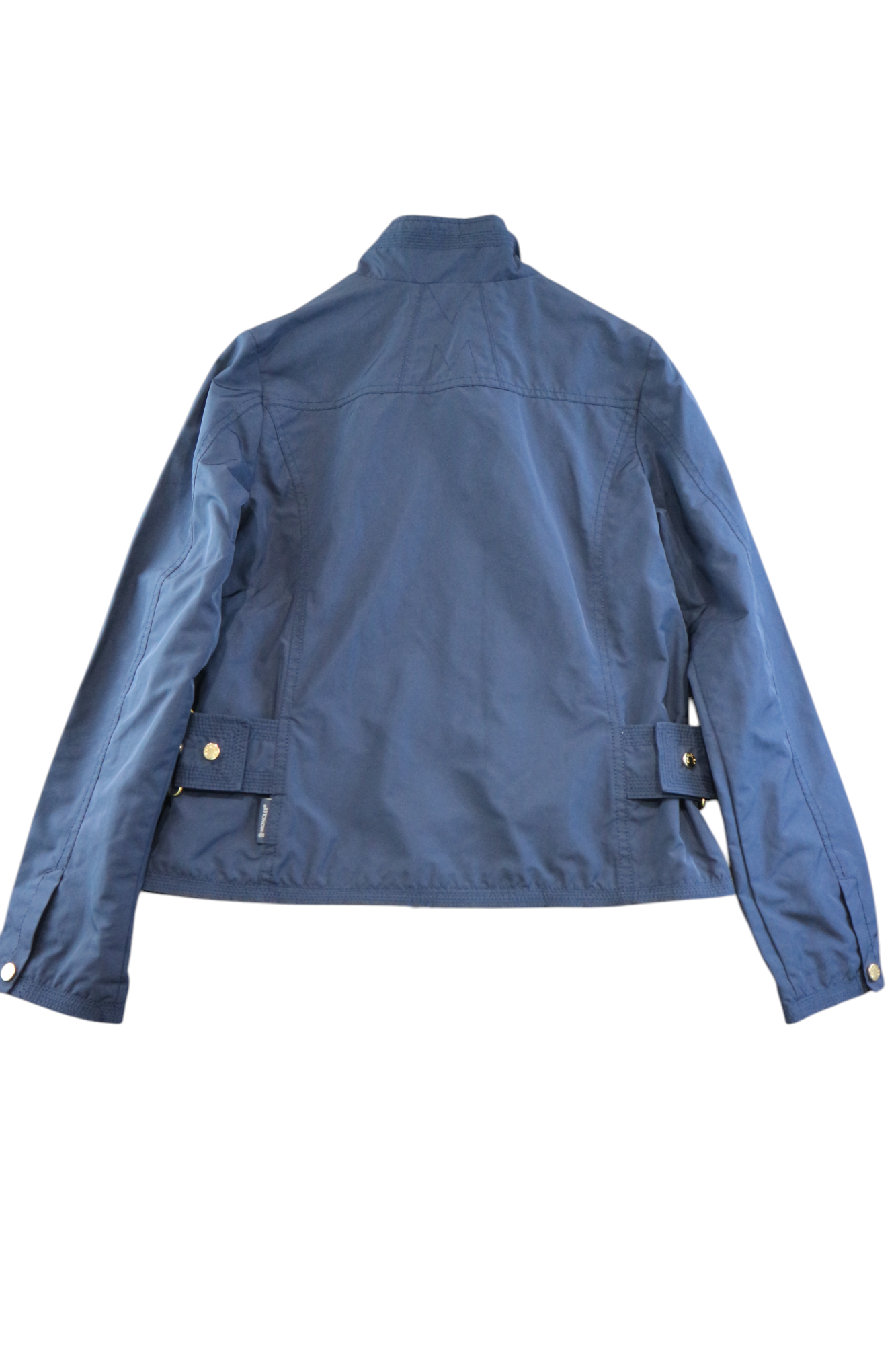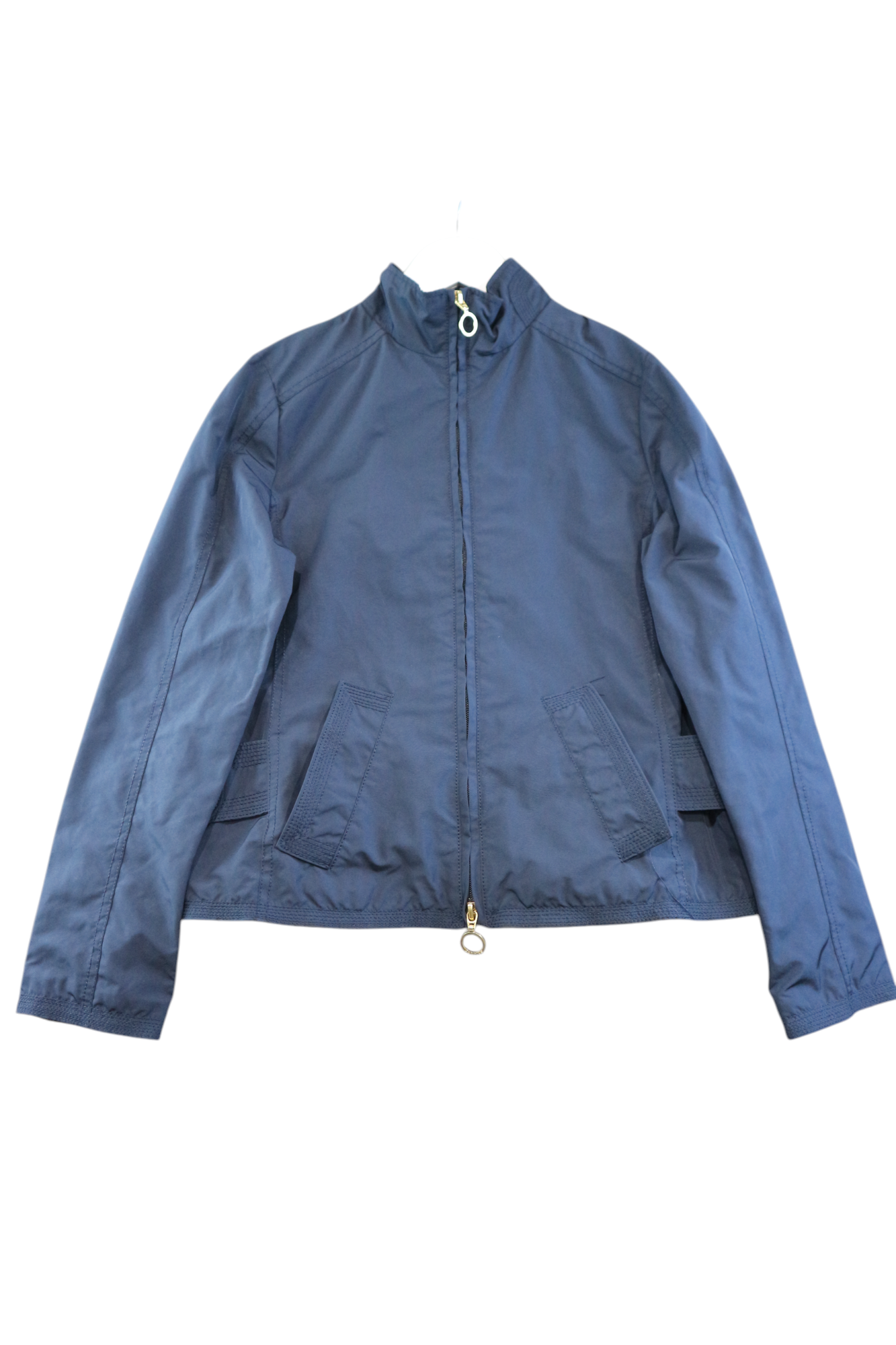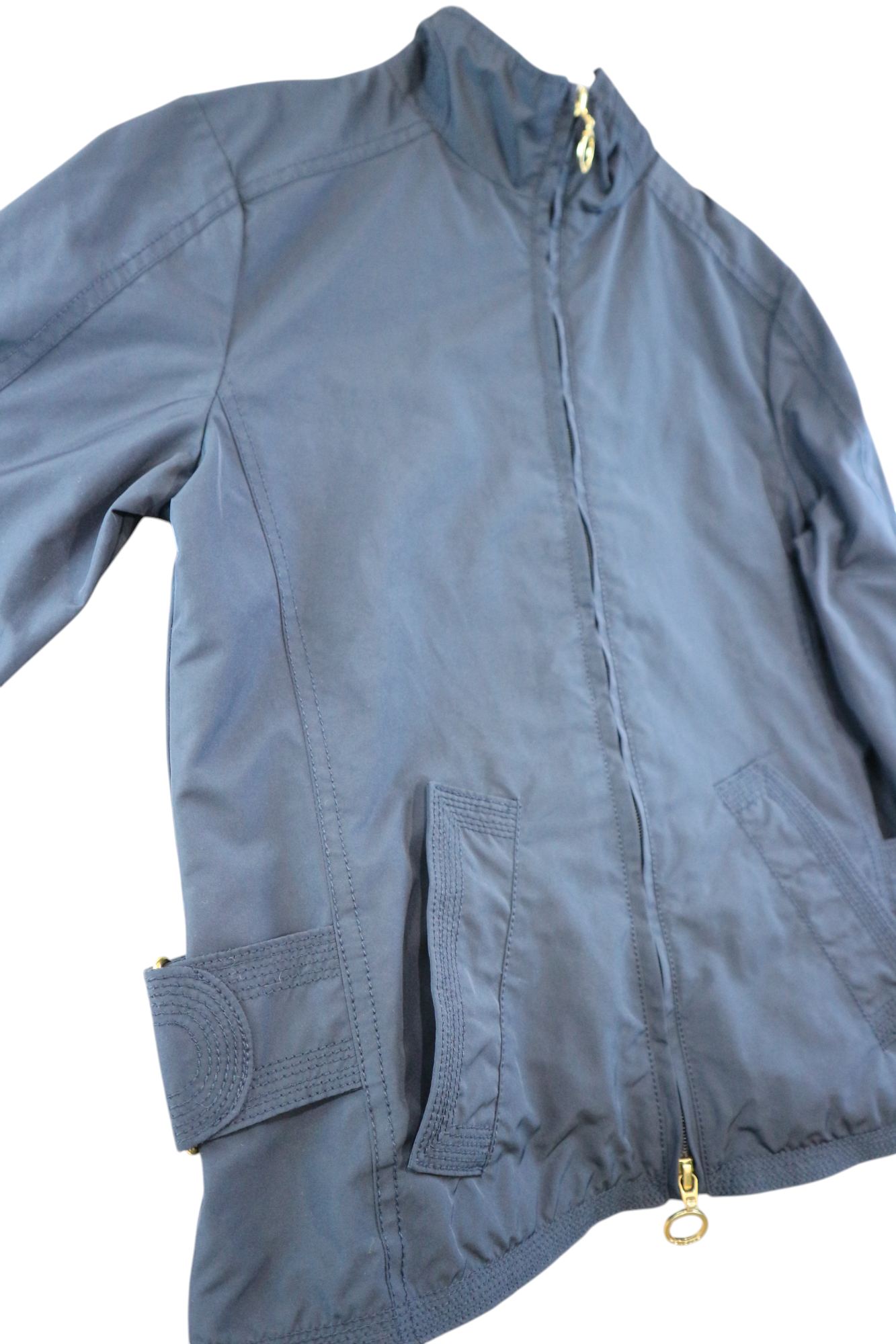 Moncler kids navy spray jacket in size 12. Gold hardware, zip front, front pockets. Polyester/nylon-polyamide.