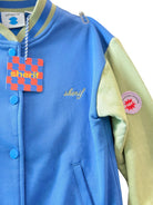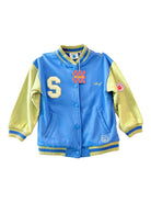 The Sherif Bomber Jacket in kids size 4 combines lime green and royal blue in a fun colourblock design. Made from a super soft cotton-polyester blend, it offers comfort with practical pockets and an oversized fit perfect for active little adventurers. Brand New with tags.