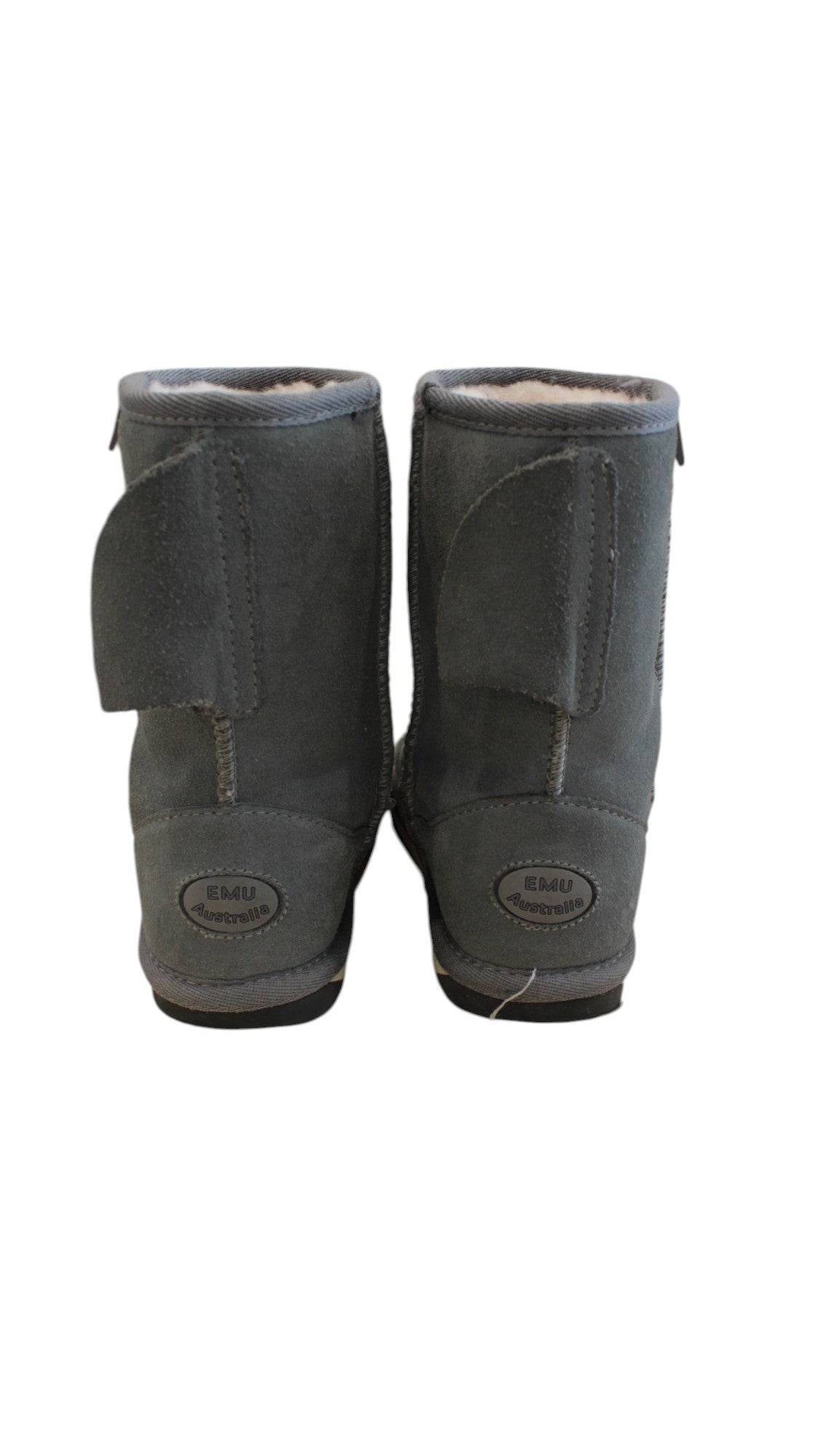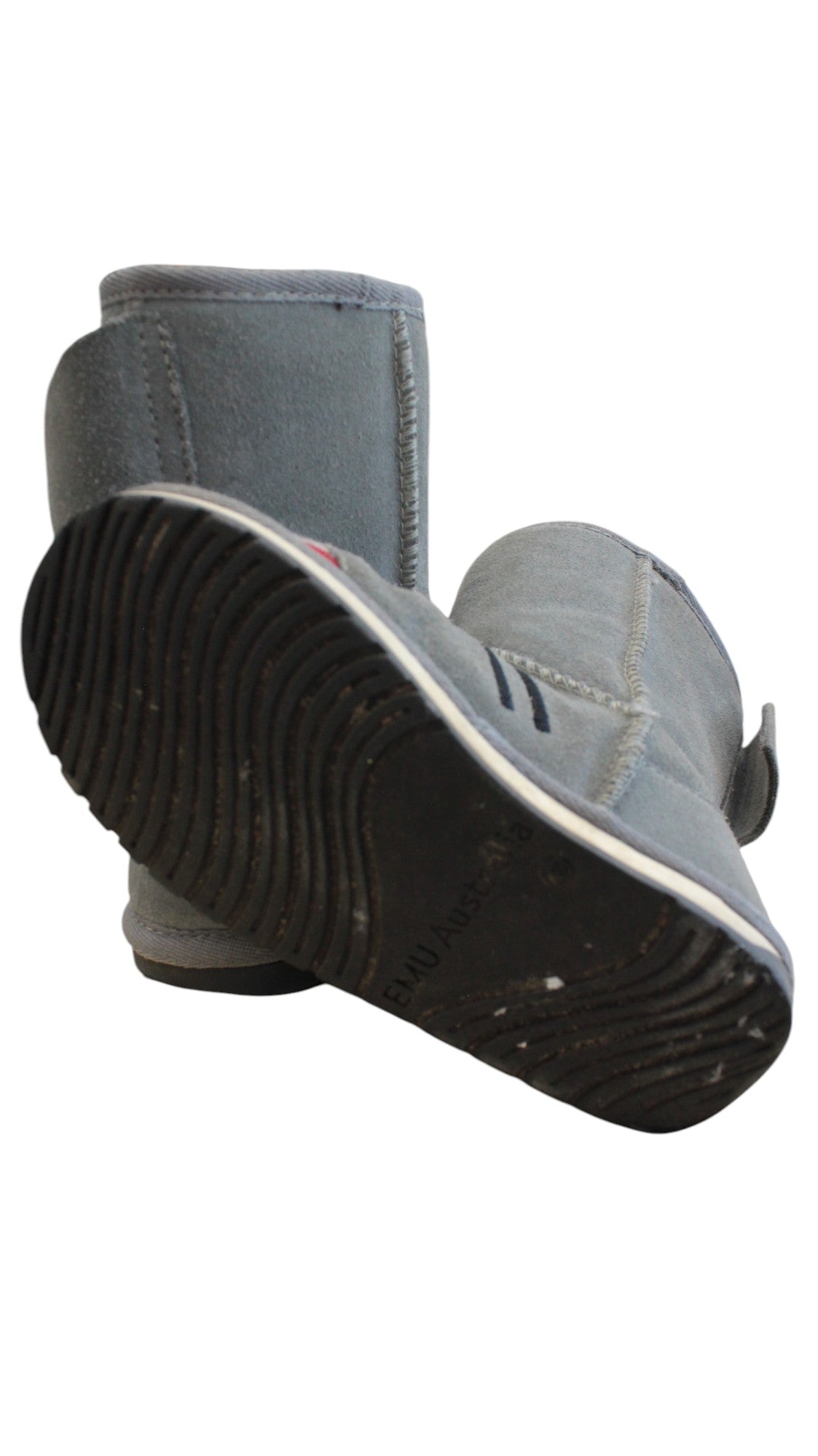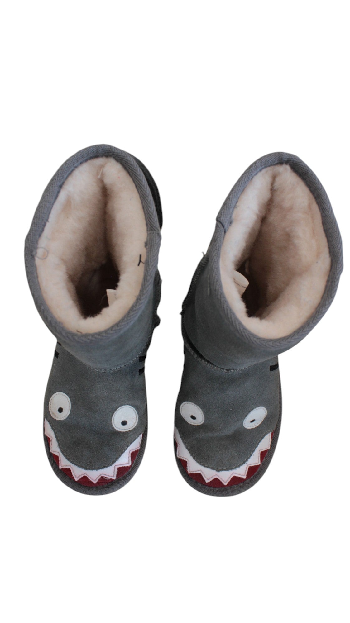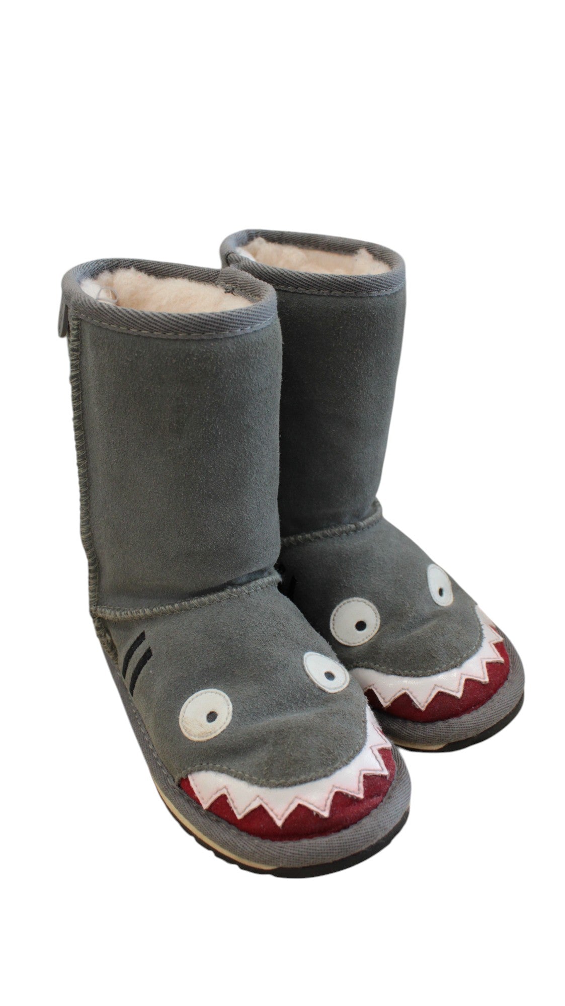 Treat your kid's feet to cozy comfort with these lambswool slipper boots featuring a fun shark design. Crafted by EMU, they combine soft, warm lambswool lining with a durable sole, perfect for indoor and light outdoor wear. Slip on this playful yet practical boot to enjoy warmth, cushioning, and a unique style that stands out. Ideal for relaxing at home or casual outings in cooler weather. Good preloved condition.
