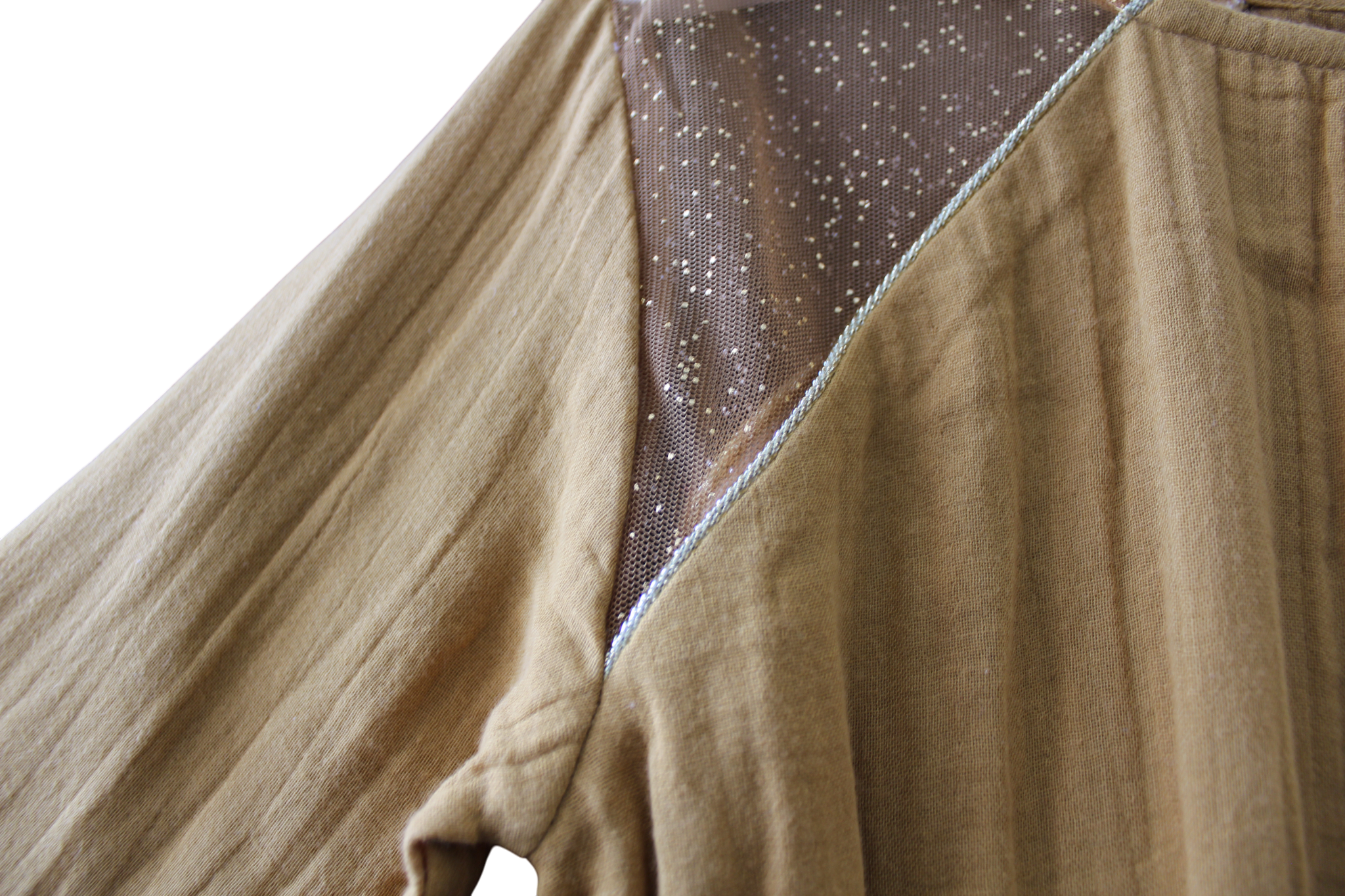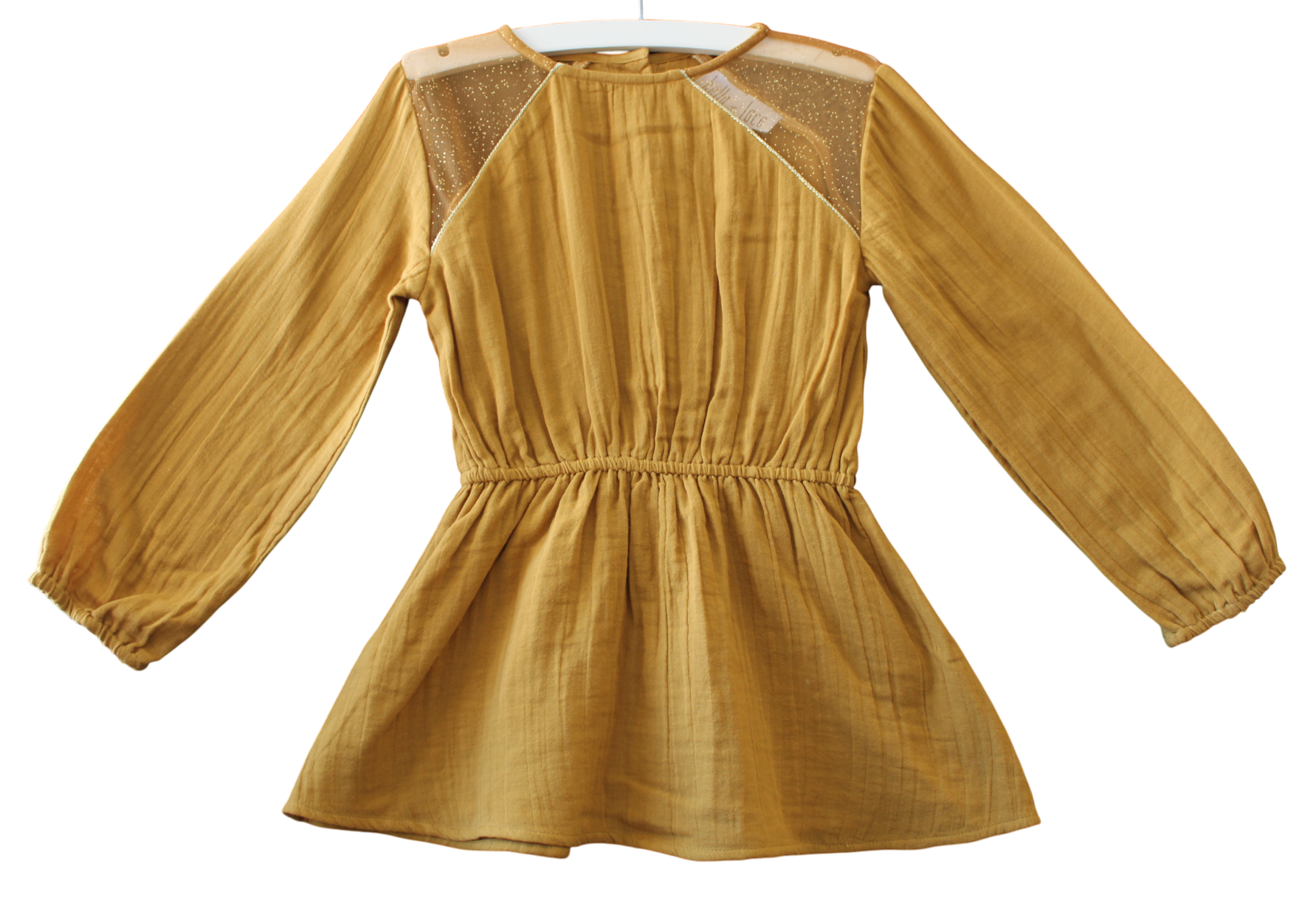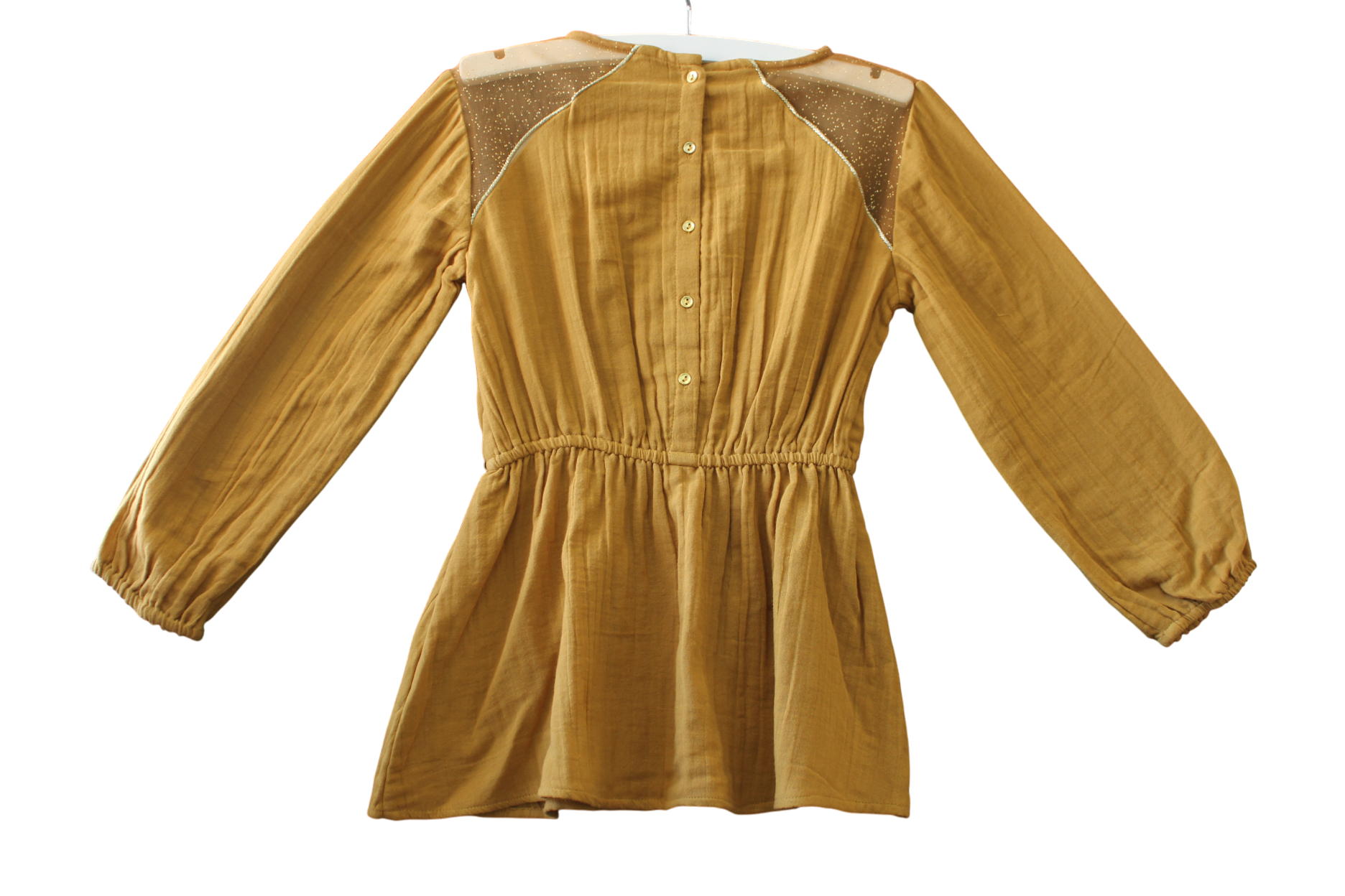 This top features soft muslin cotton with delicate metallic gold sparkles on mesh shoulders. Its elasticated waist and wrists allow for endless twirling and playful adventures, all while adding a subtle shimmer to every move.