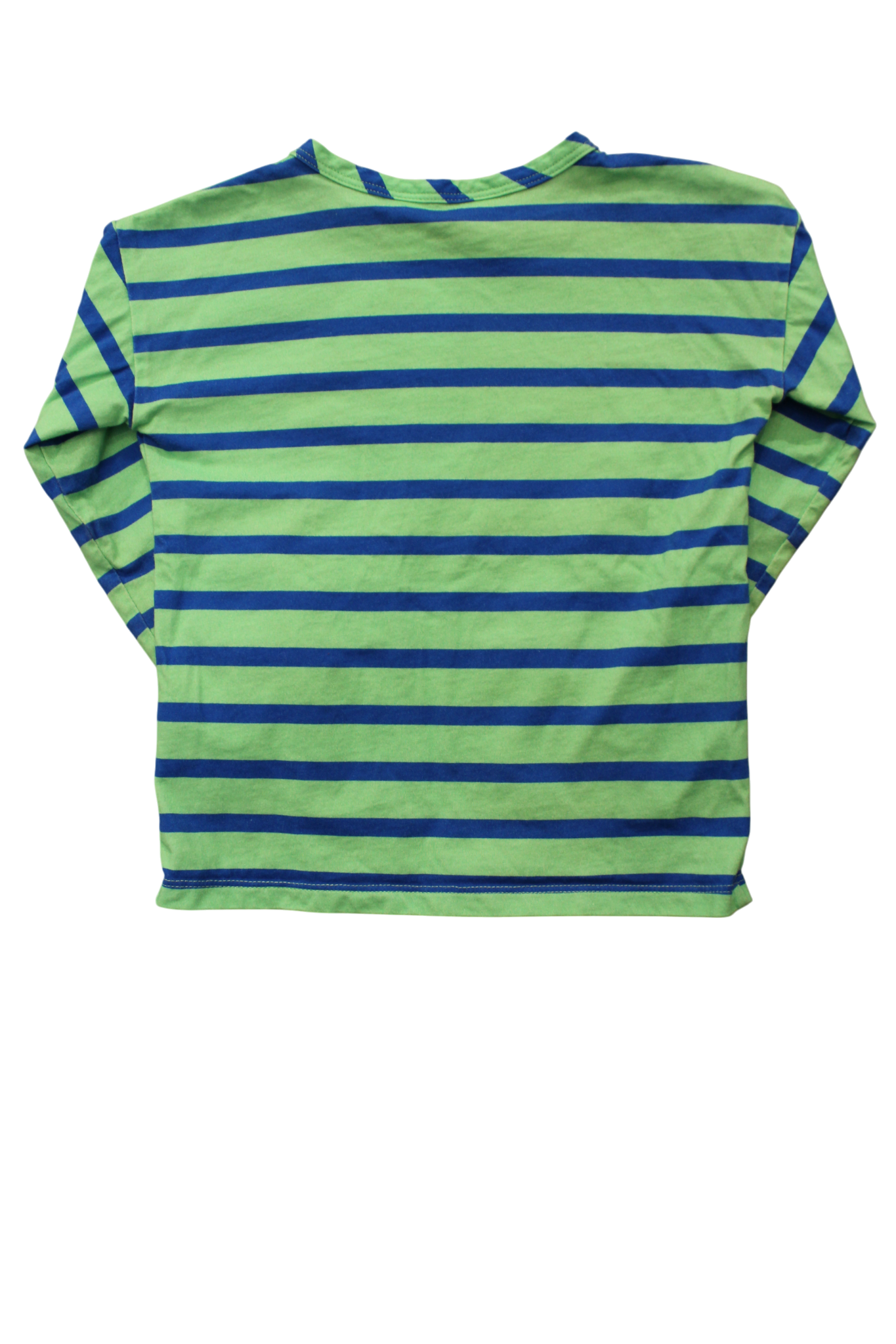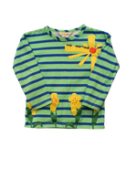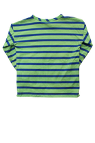 Green and Blue Stripe T-Shirt Fresh and fun stripes in cool green and blue tones! This Gorman Kids t-shirt brings a splash of colour to little ones' everyday style. Made from soft, comfortable fabric, it's perfect for layering or wearing solo during warmer months. The cheerful stripe pattern pairs easily with solid bottoms, making it a go-to piece for playdates, outings, and relaxed days at home. Size 2-3. Good condition, some marks on the sleeve.
