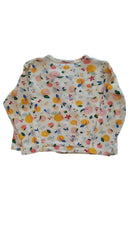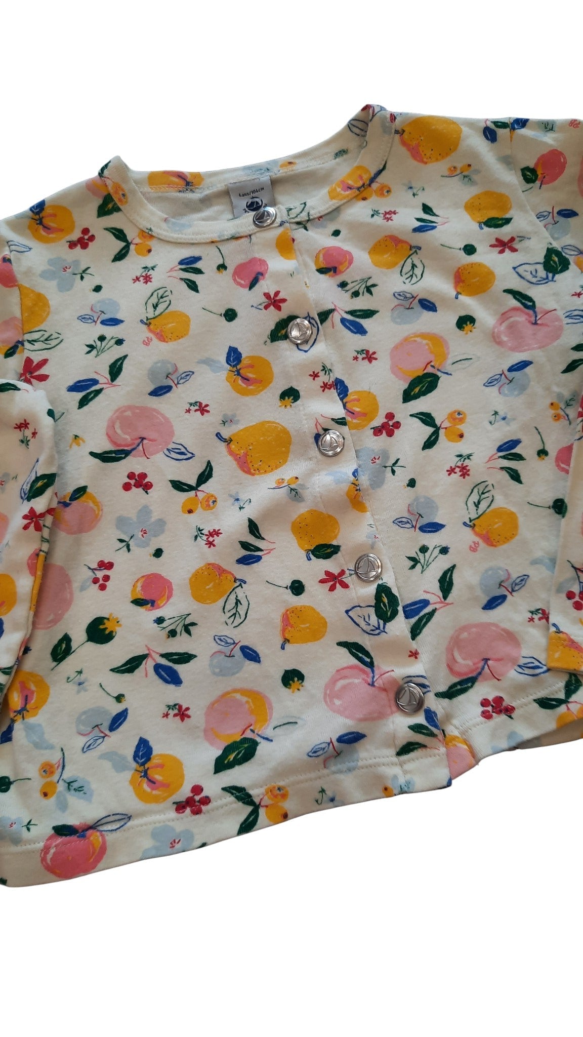 Petit Bateau pale yellow cardigan with all-over fruit print and snap-button closures, size 4. 100% cotton.
