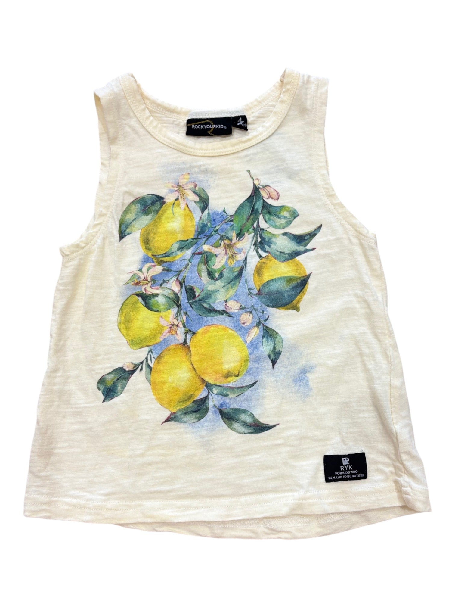 Sunny butter-yellow tank from Rock Your Kid, with a gorgeous watercolour lemon print! Lightweight 100% cotton keeps kids cool and comfy all summer long.