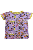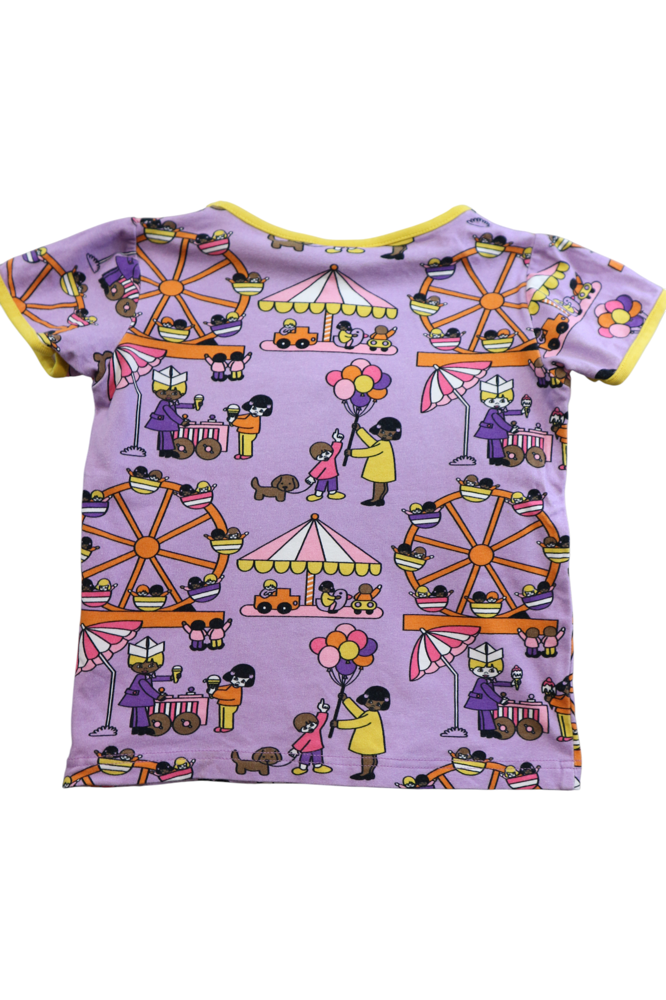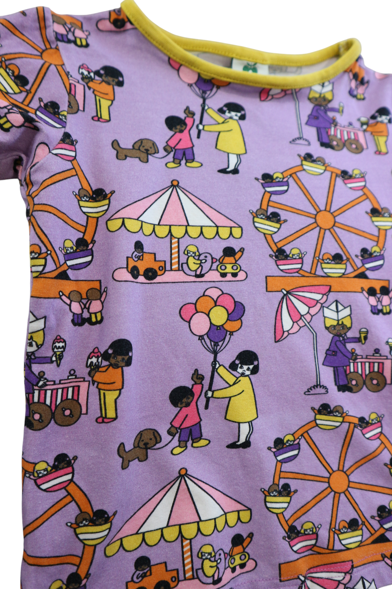Smafolk t-shirt in purple with carnival print, size 4-5yrs. Organic cotton/elastane.