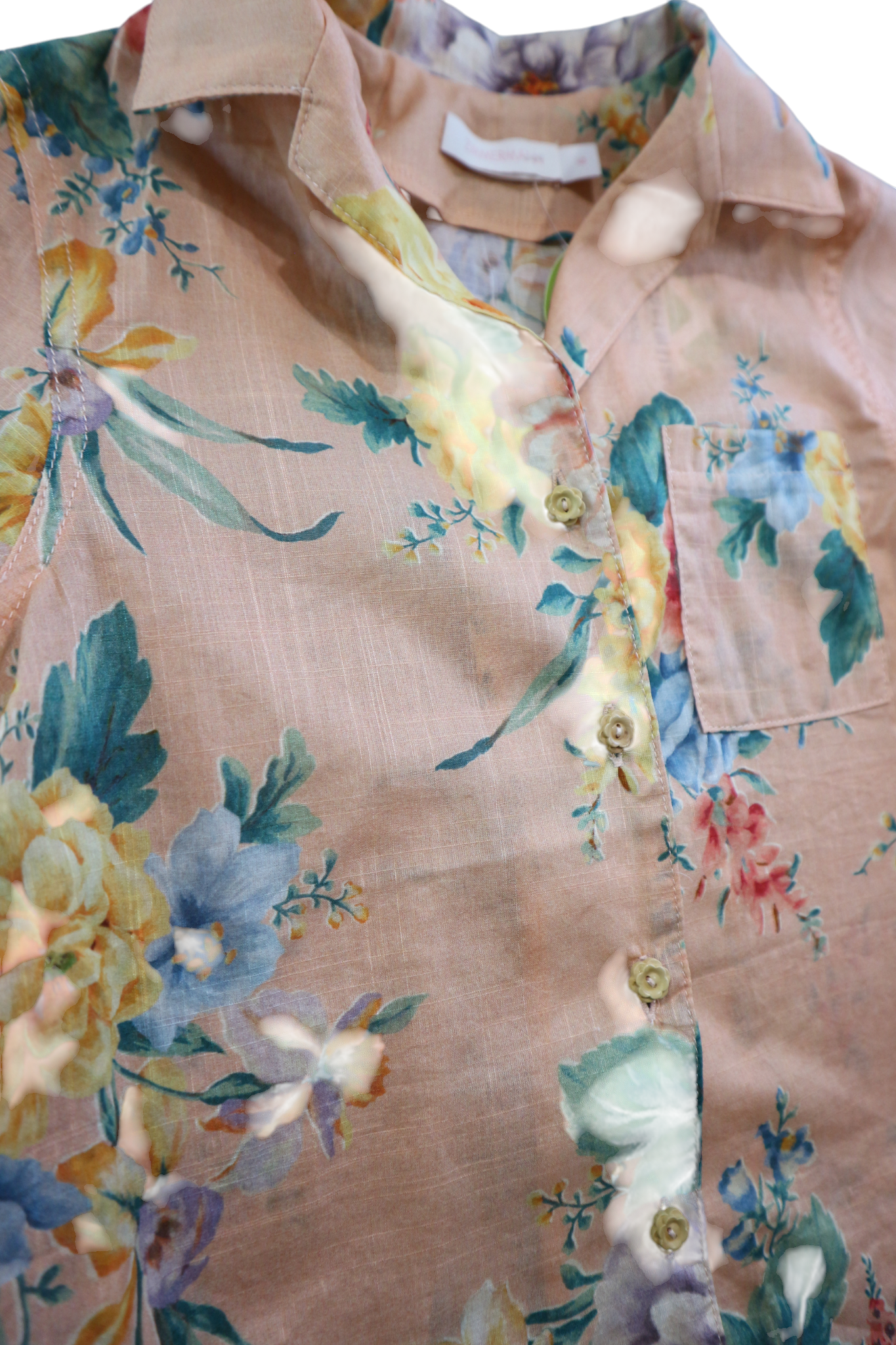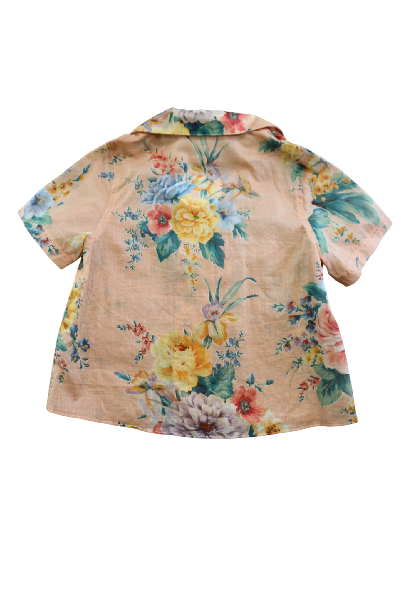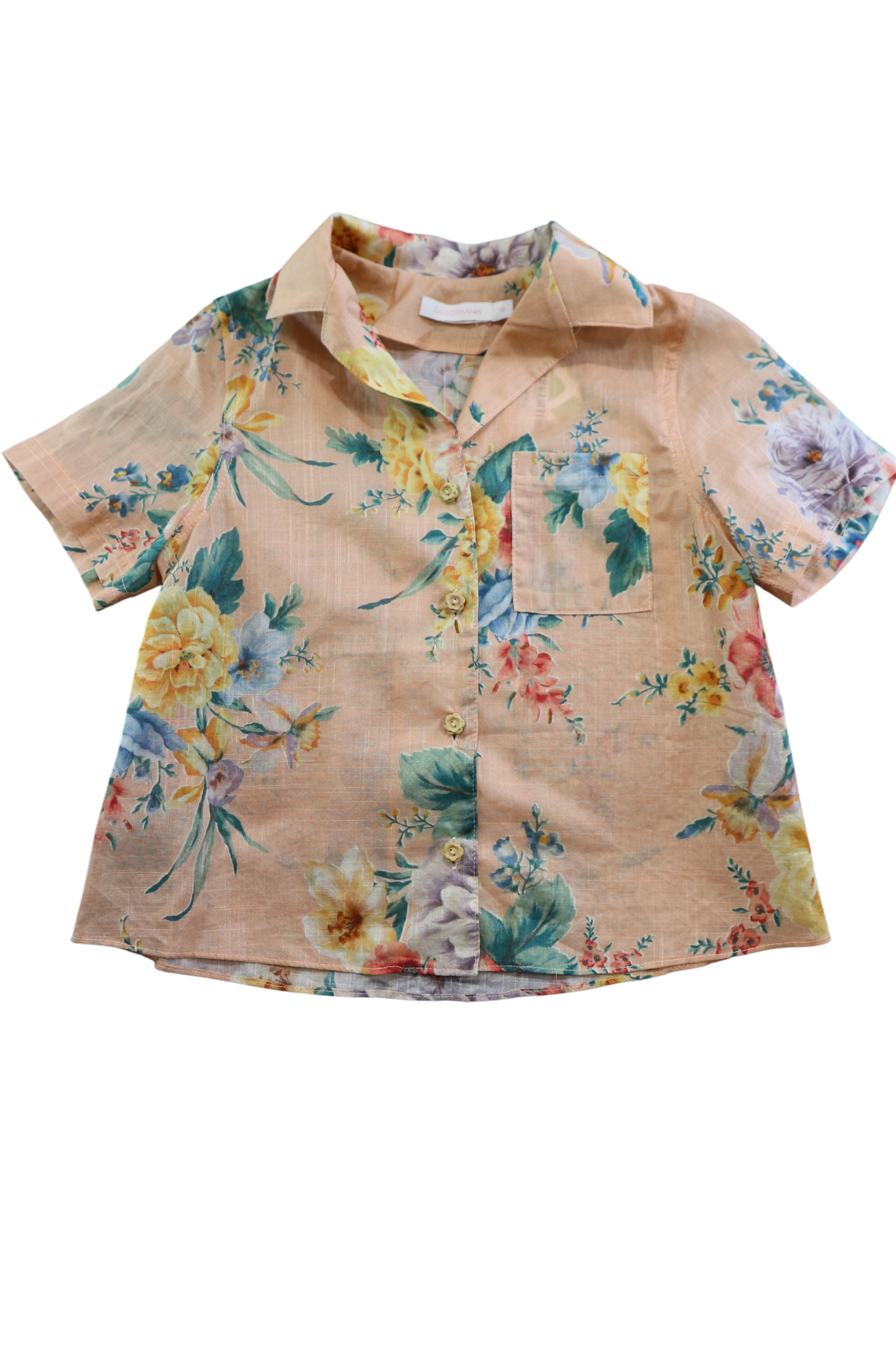 Zimmerman peach floral short-sleeved button-down shirt, size 6. 100% cotton.