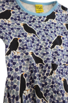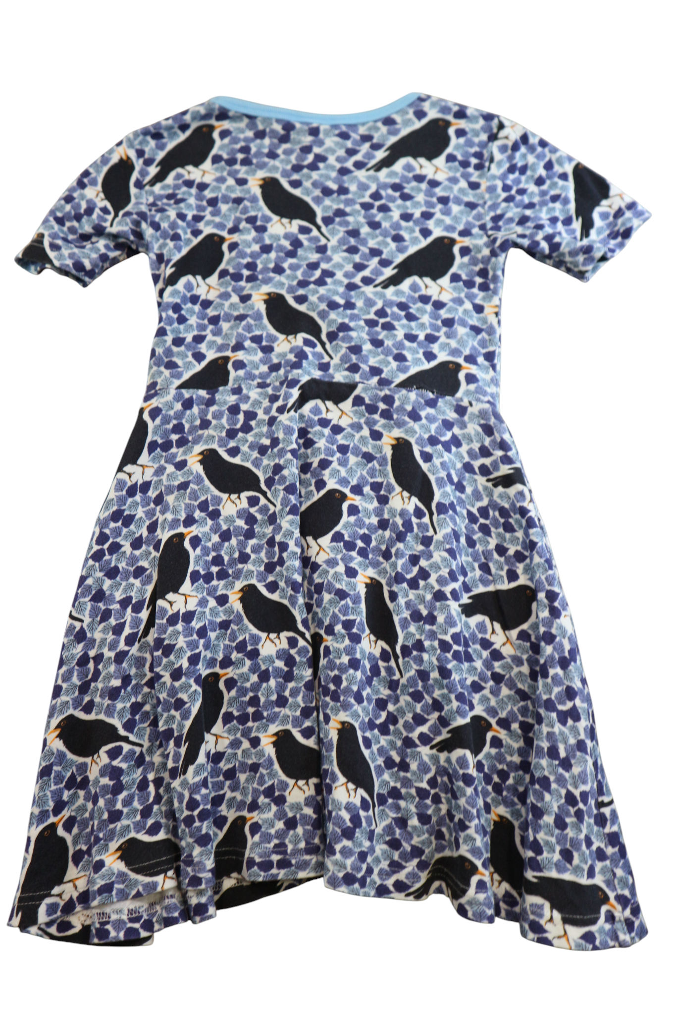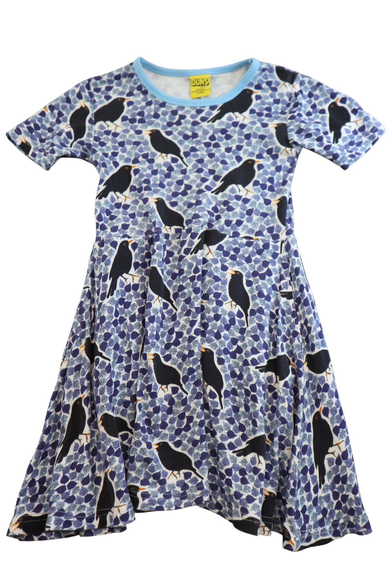 DUNS swing dress in blue leaf/bird print, size 110 (5yrs). Organic cotton.