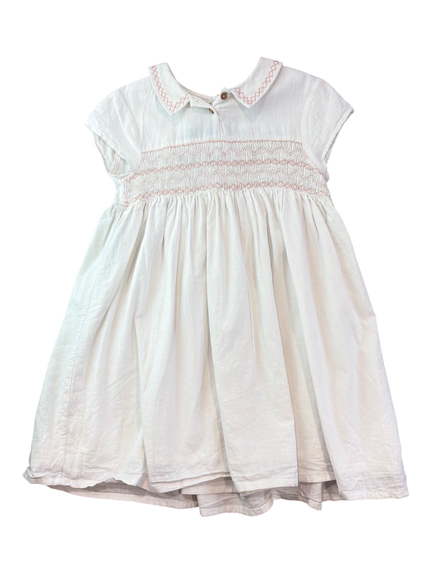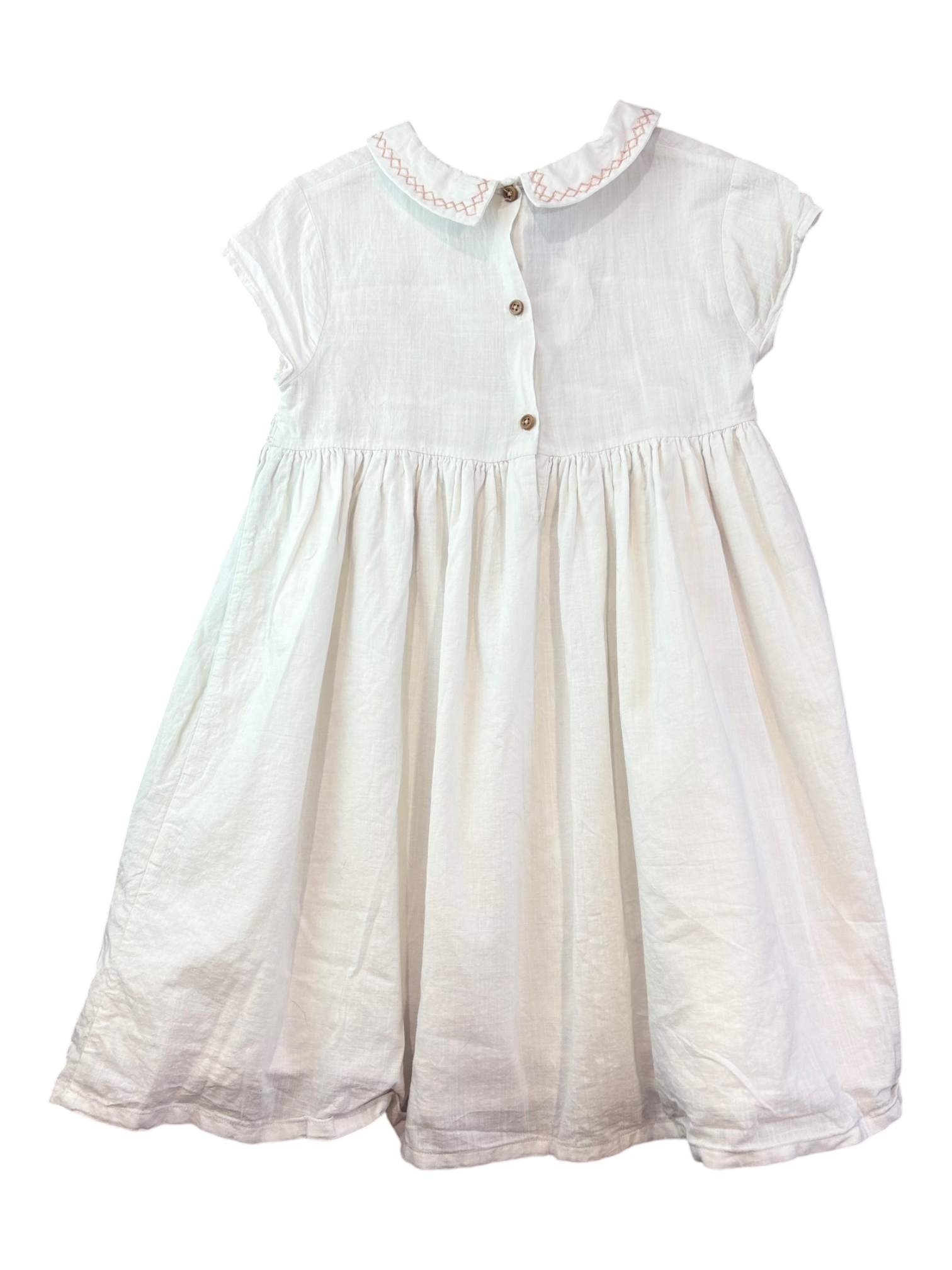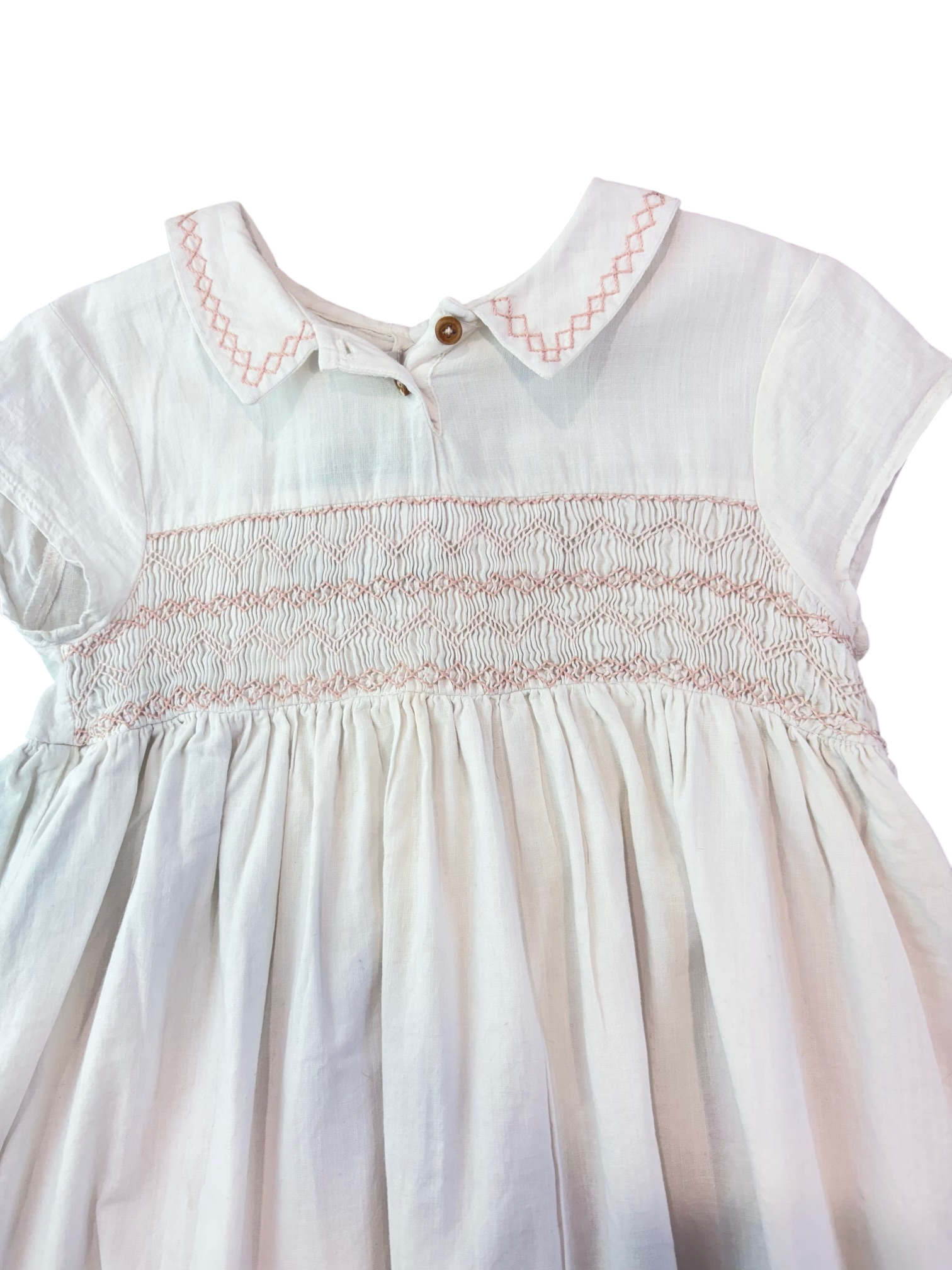 Twirl through summer in this delightful Marie Puce dress with vintage charm! The pristine cream base features a pretty pink shirred waist that cinches beautifully, while a sweet collar and button accents bring nostalgic appeal. Crafted from lightweight 100% organic cotton, it's breathable and gentle on growing kids.