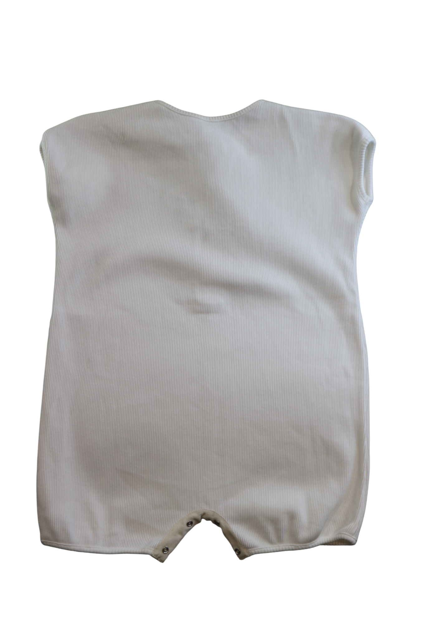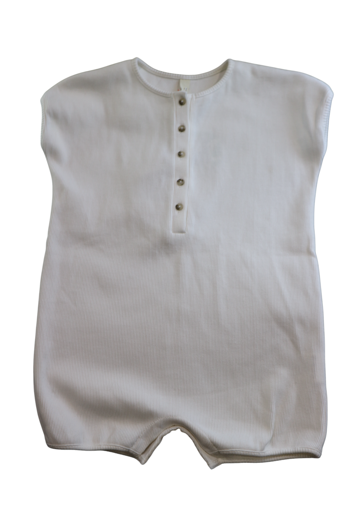 Millk white ribbed playsuit, button front and snap buttoncrotch, size 5. 100% cotton.