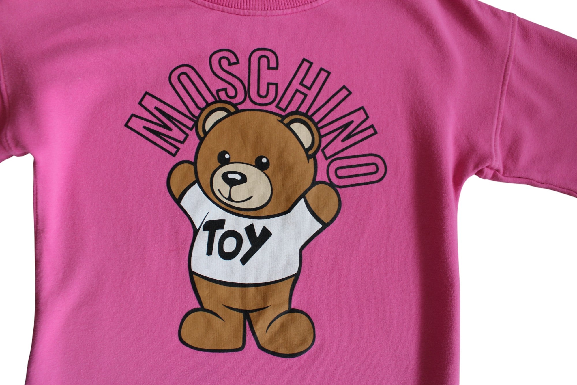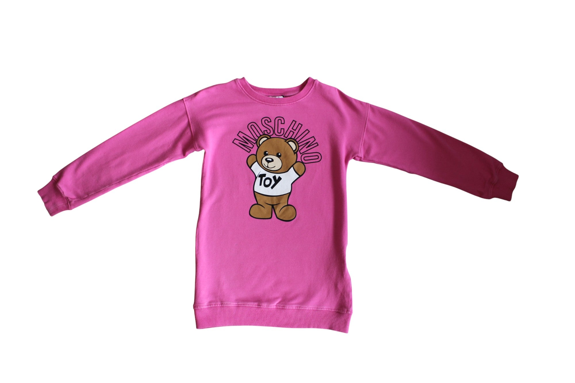 This pink Moschino sweatshirt dress blends comfort and fun with its soft cotton fabric, ribed trims and brand's iconic teddy bear. The perfect item for everyday adventures with a touch of charm.