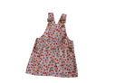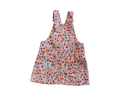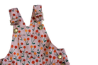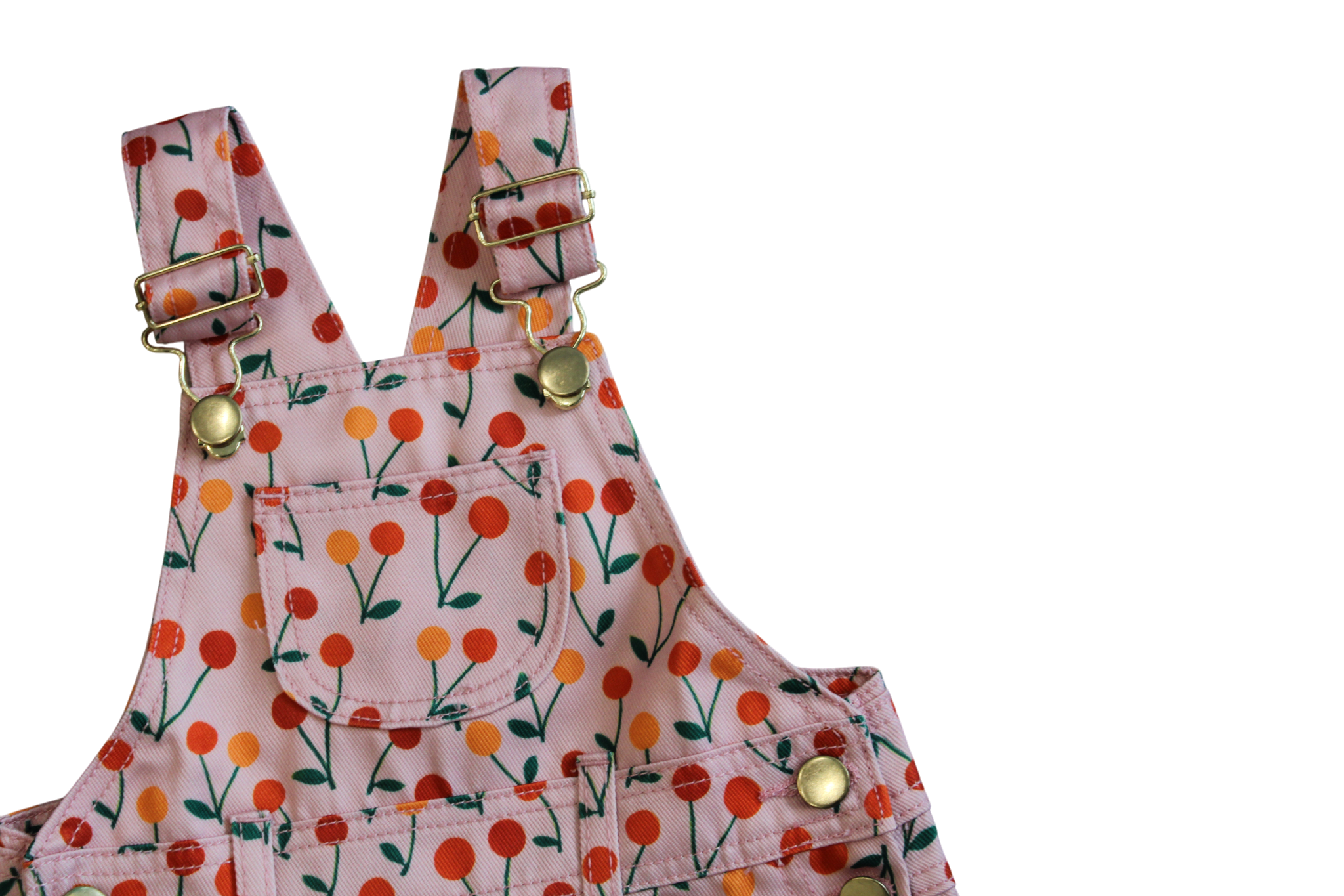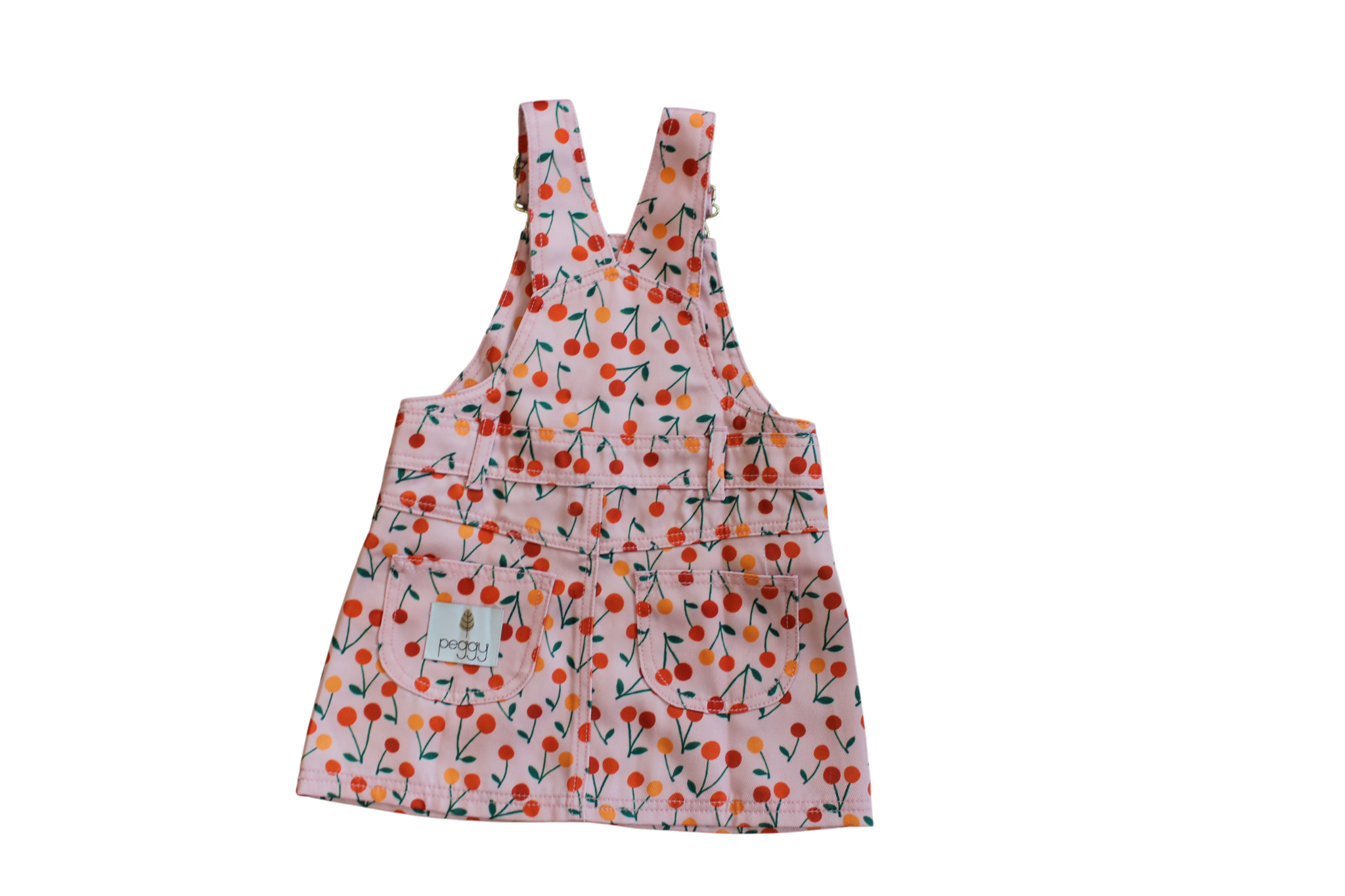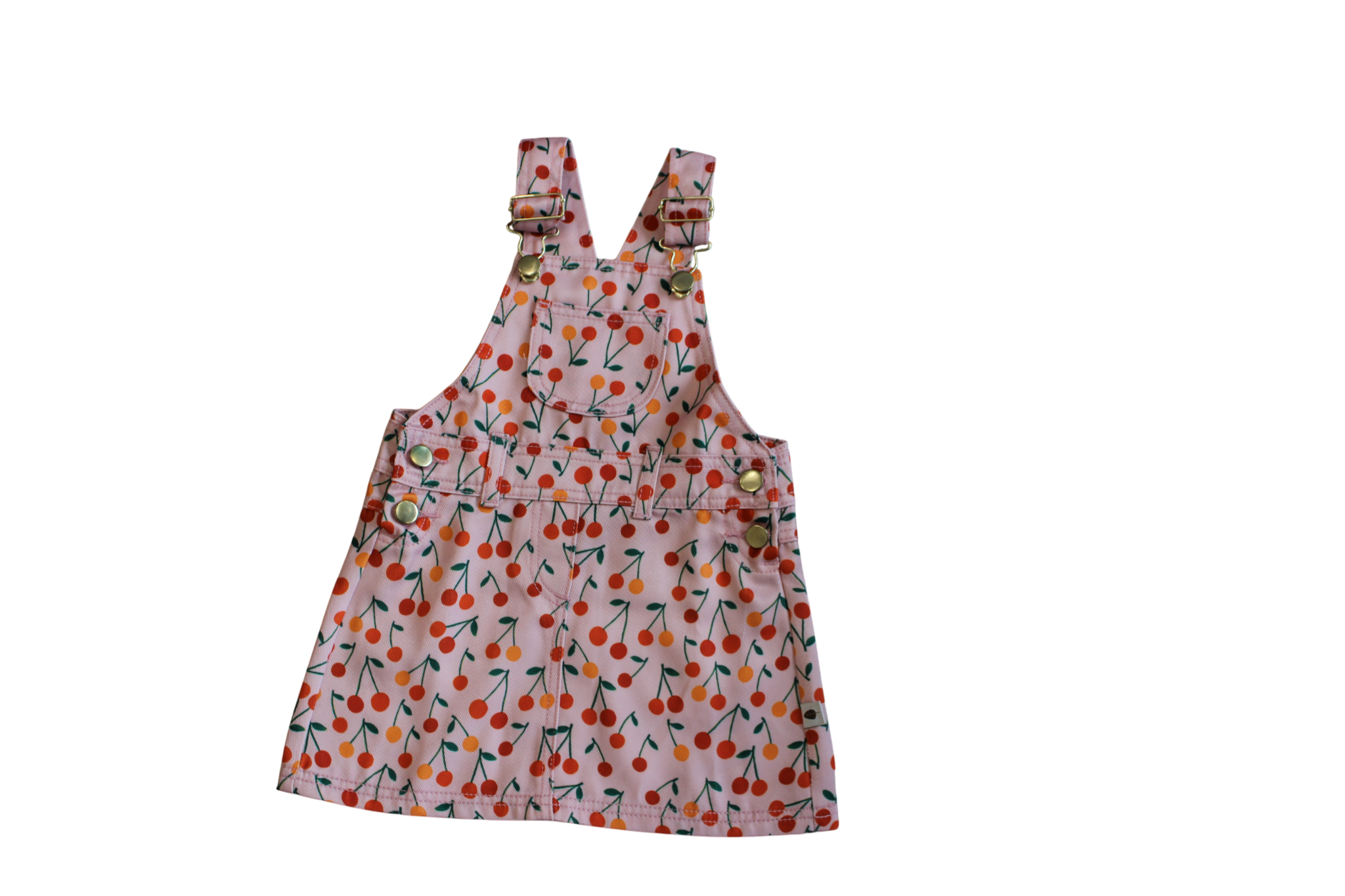 Mini cherry print pink dress. Ajustable straps. front pocket and four button hole opening at waist. Two back pockets, waist belt loop and denim style double flat seam detailing.