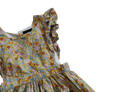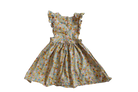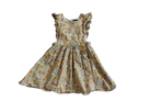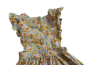 Feminine flower and box yellow print. Pinafore-style top for breezy summer wear or layering. Frill sleeve, square neckline, and button up back. Gathered skirt with two front pockets.