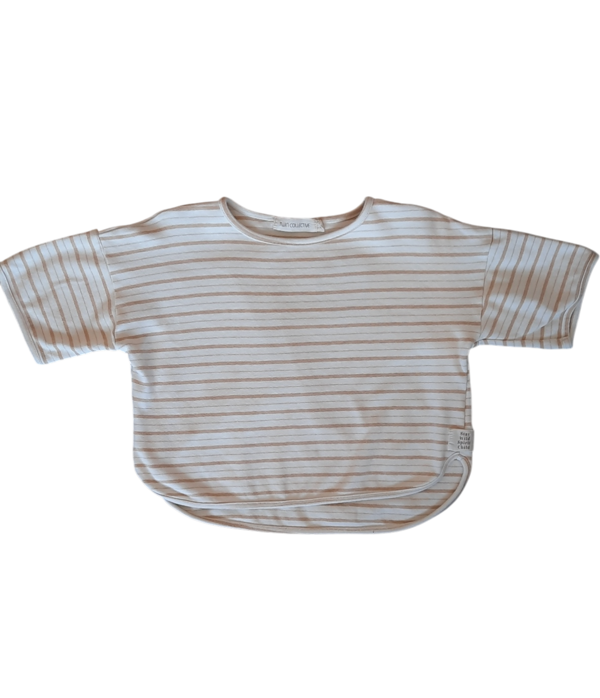 This laid-back slouchy tee from Twin Collective is crafted from beautifully soft fabric in beige/cream stripes and a stay wild spirit child' tag on the side. Effortlessly cool.