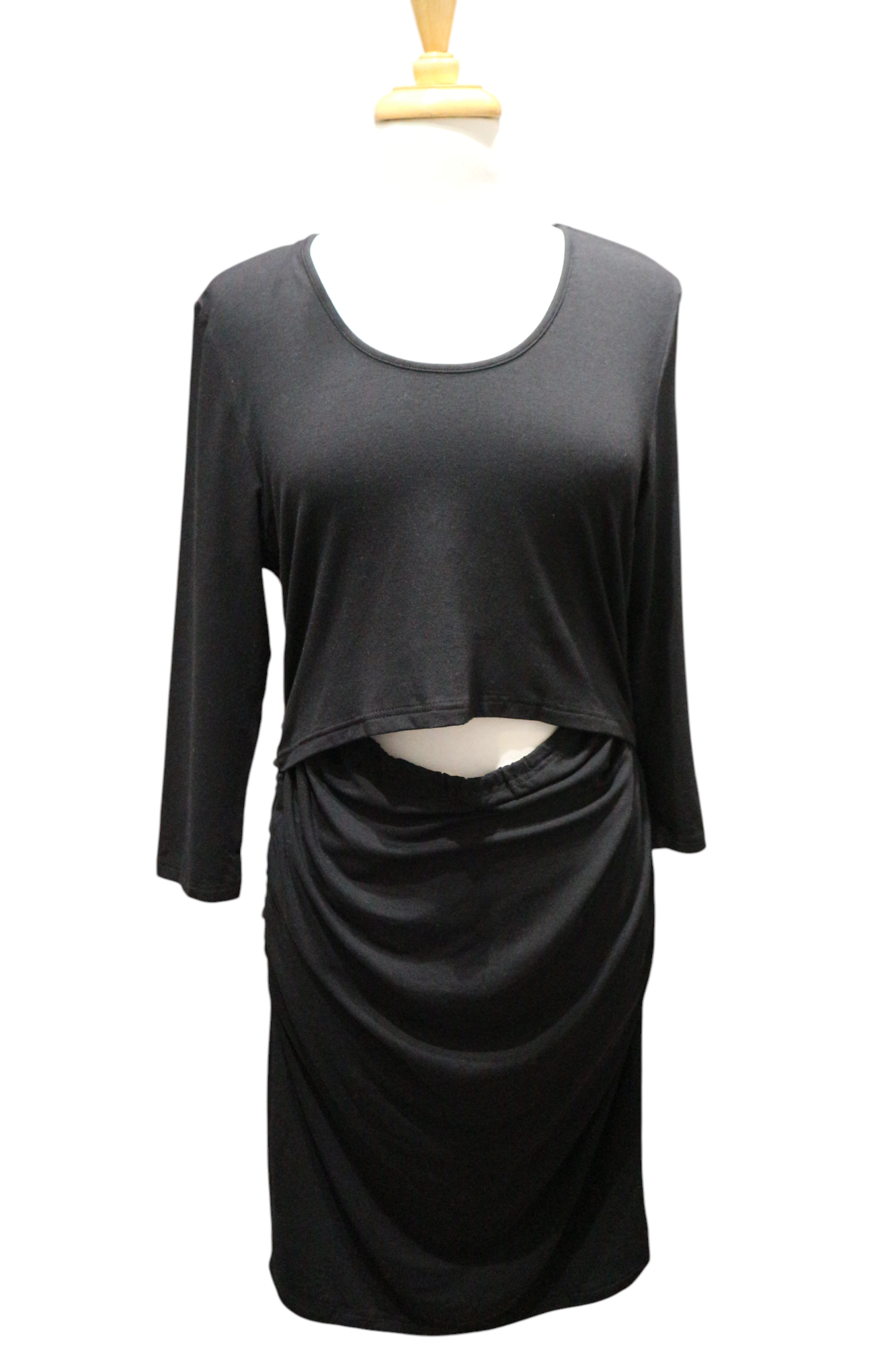 This elegant black nursing dress in XL size is perfect for any new or expecting mothers! Featuring a split skirt and bodice design, it allows for easy and discreet breastfeeding while remaining stylish. The soft stretch material ensures comfort. Size XL.