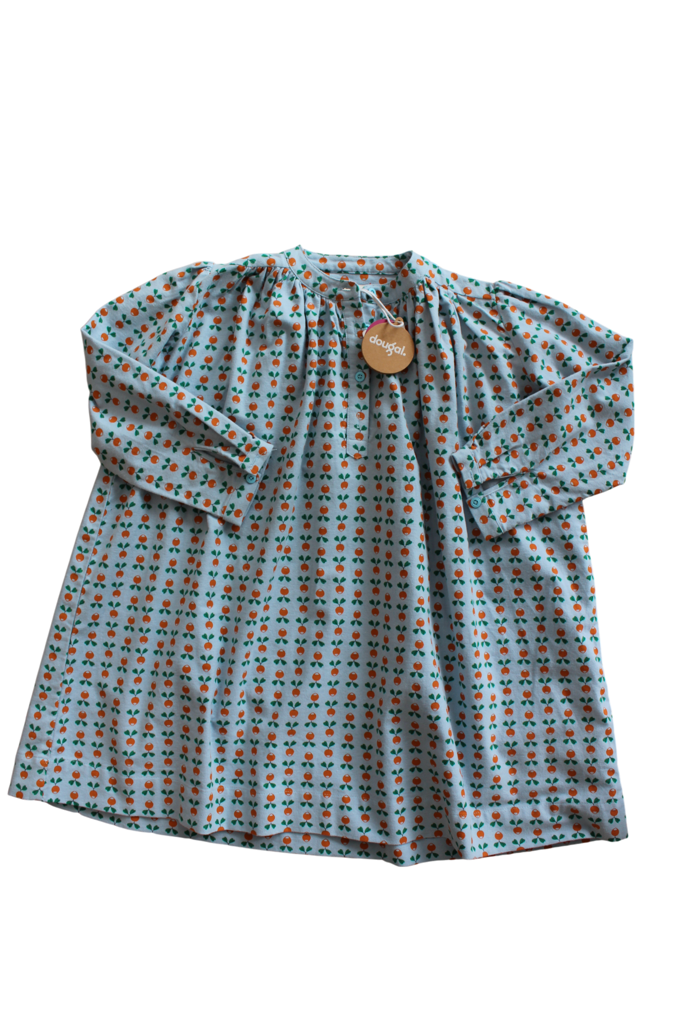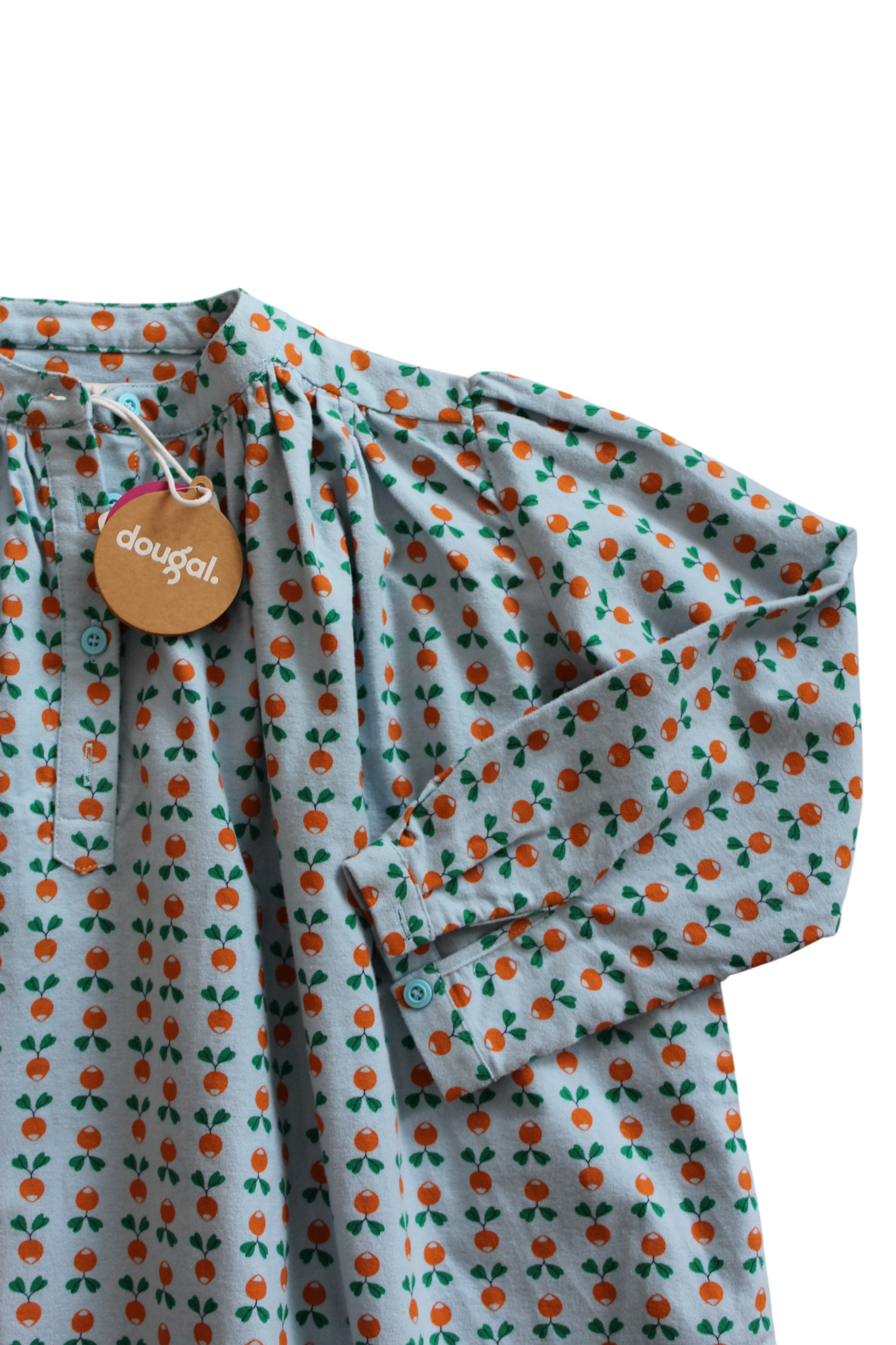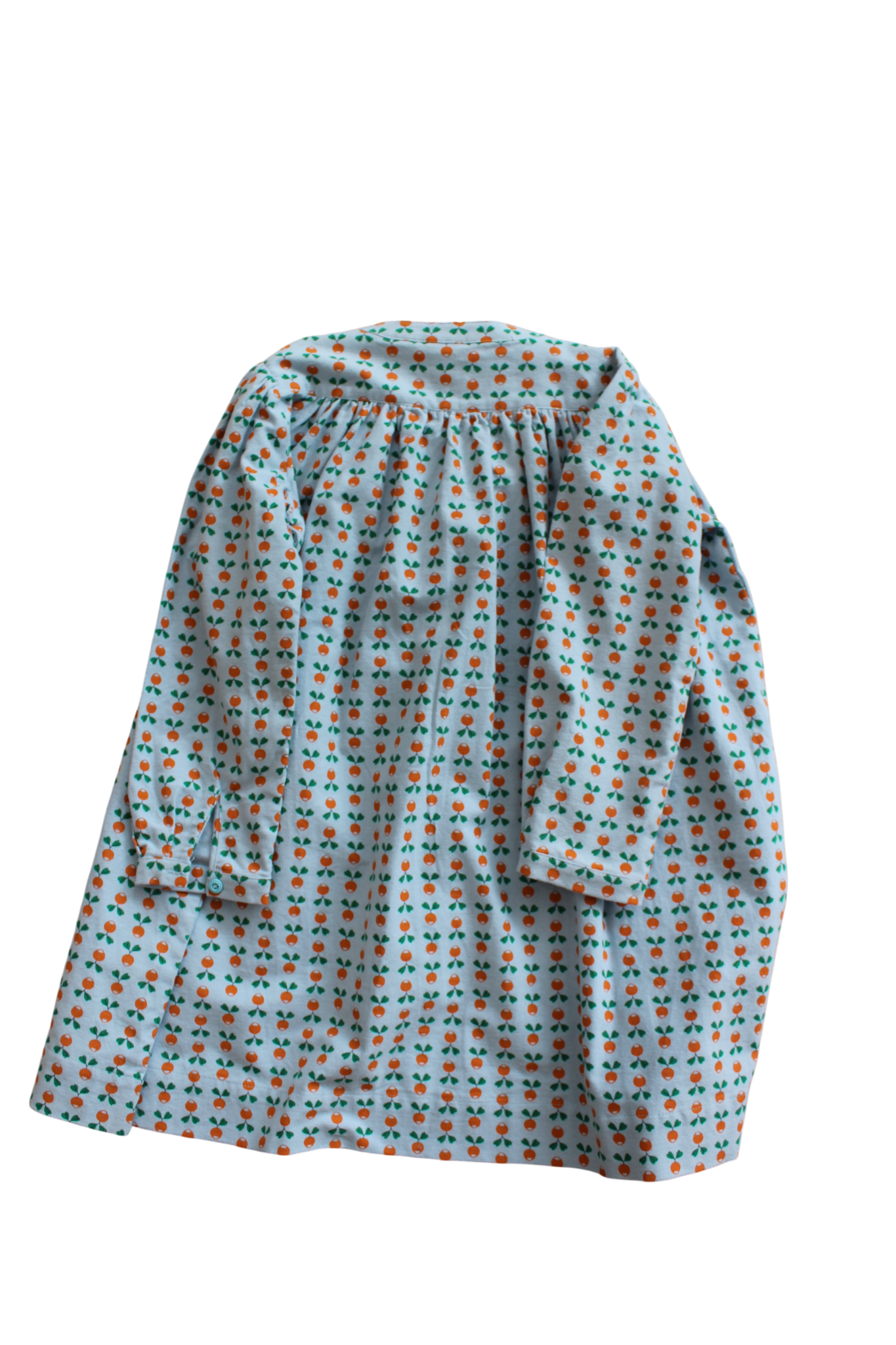 This charming babydoll dress id crafted from soft cotton fabric with a flannelette feel, it features long sleeves perfect for all-season wear and a gathered neckline with button details for an adorable touch. Designed for kids who love to move and play, this dress combines comfort and style.