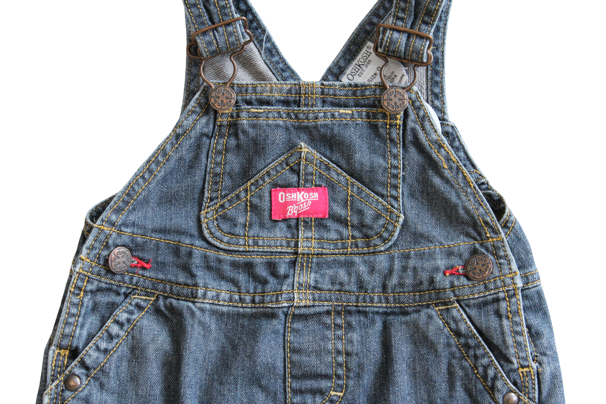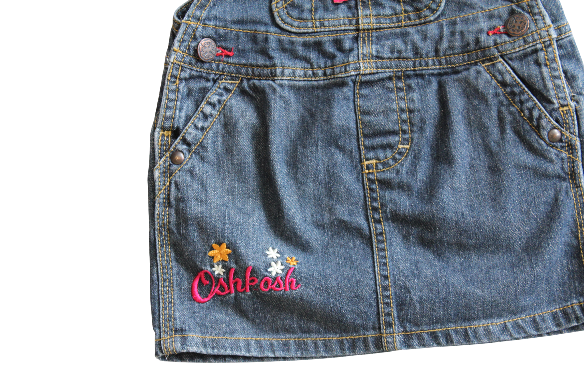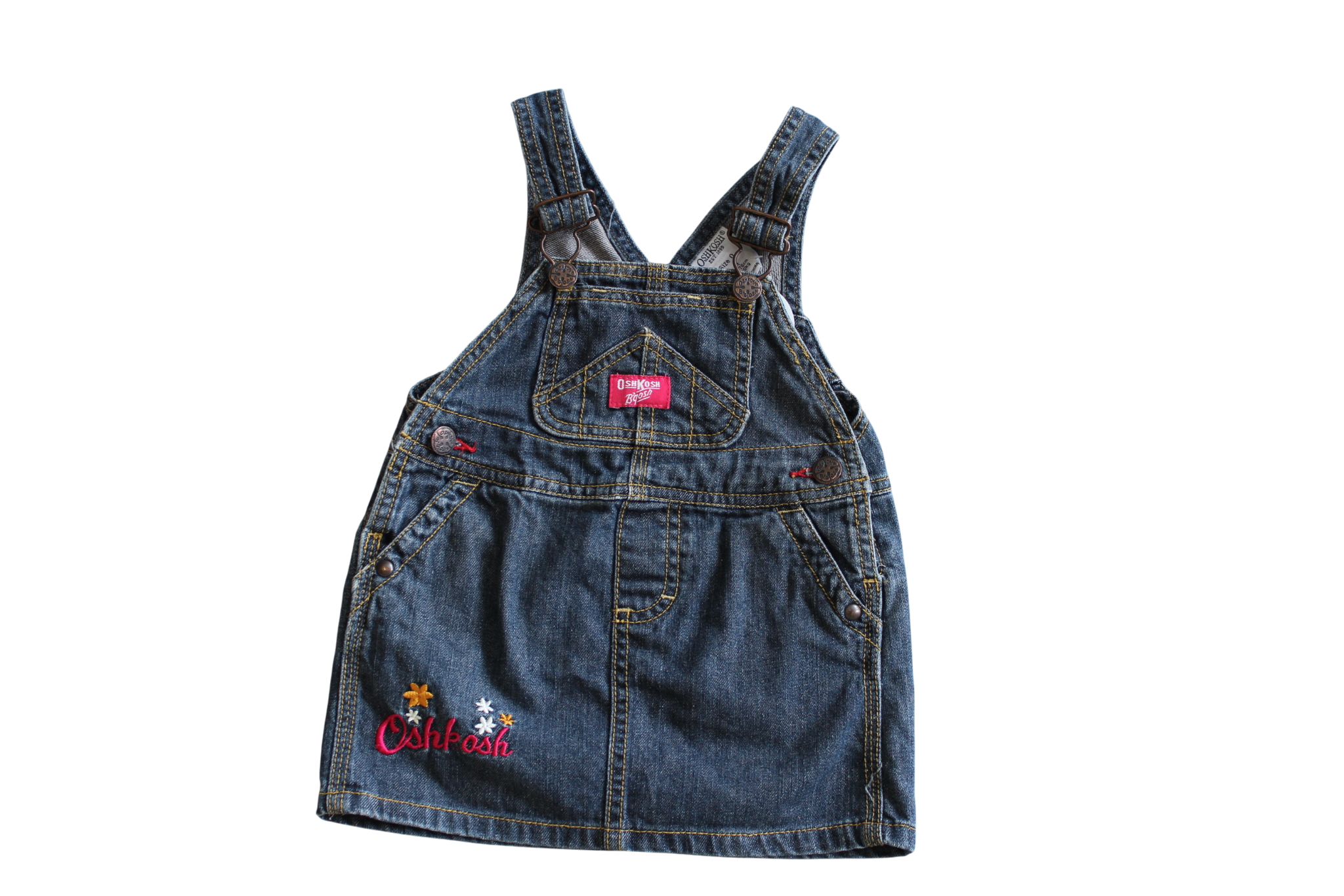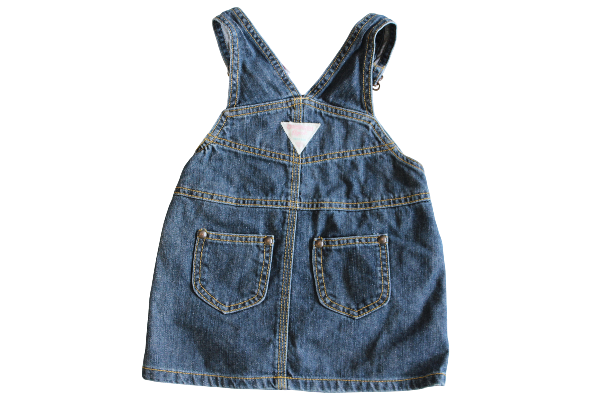 Highly Sort- after OshKosh Dress. Pinafore style just cross-over ajustable strapes. Two Front pockets, and two buttons at waist. With Contrast stitching to add to the vintage feel.